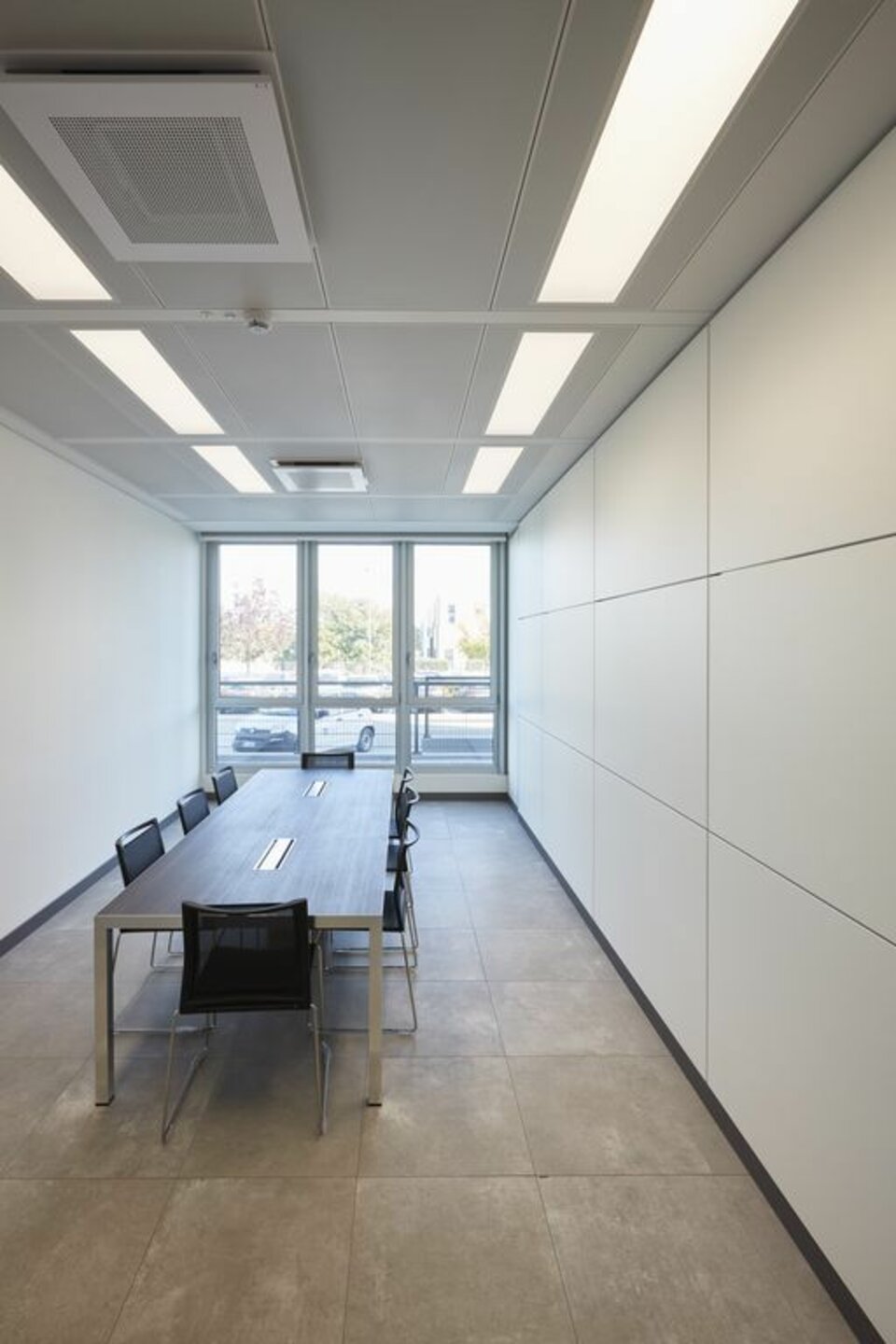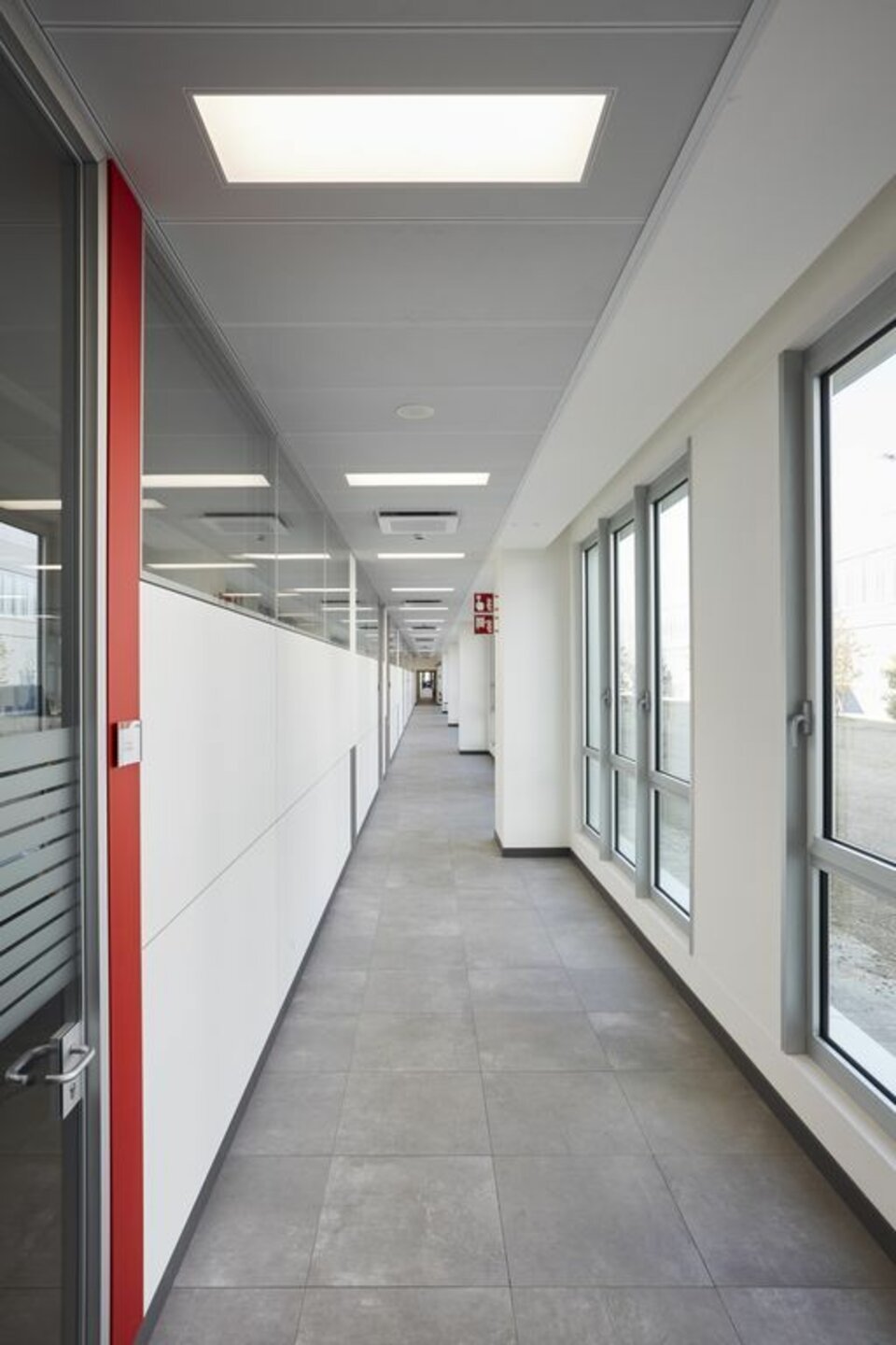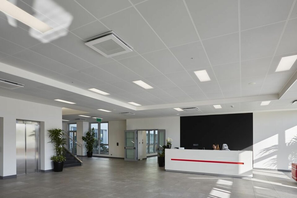 Um den hohen Anforderungen an die Akustik gerecht zu werden, lieferte Lindner die schalllängsgedämmte Bandrasterdecke LMD-B 100 SD. Die komplette Integration von Lindner Airboxen für Zu- und Abluftversorgung sowie Lindner IS 22 LED Leuchten garantiert eine lückenlose Schallschutzleistung über alle Gewerke. Dank der Schalllängsdämmung konnte eine spürbar bessere Akustik erzielt werden als mit einer normalen Decke – dies ermöglicht ein besonders ruhiges und konzentriertes Arbeiten in den Büroräumen auf allerhöchstem Niveau.