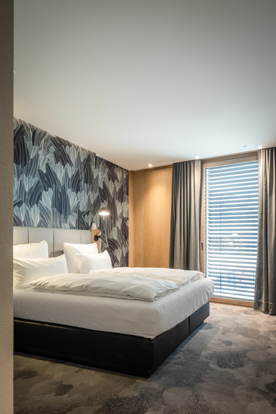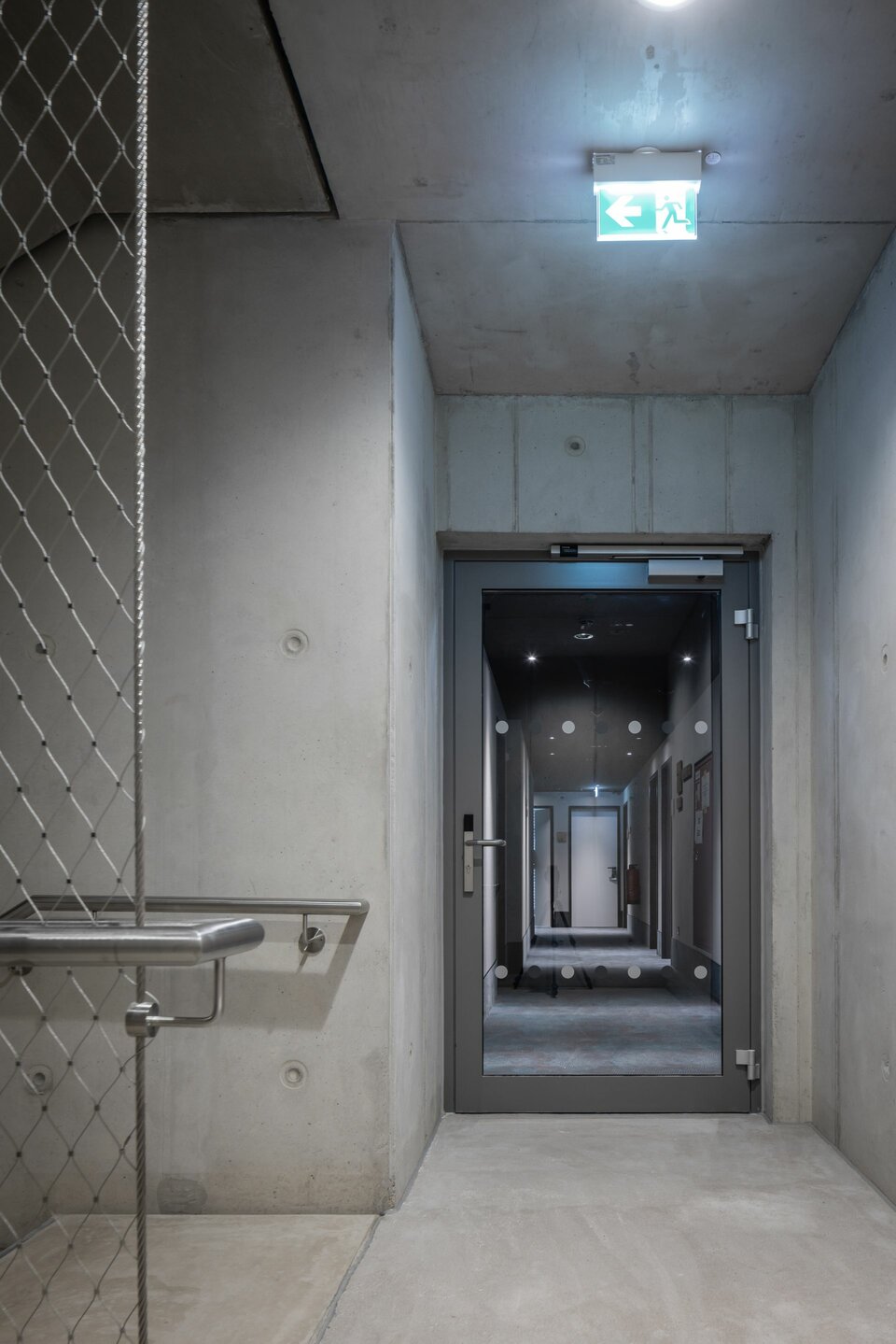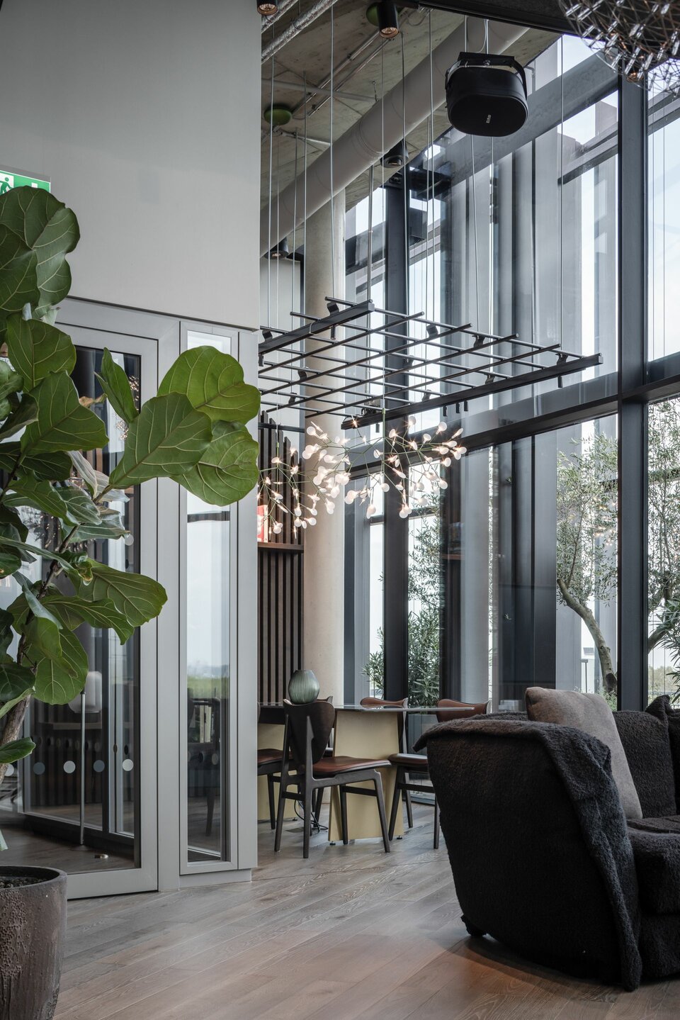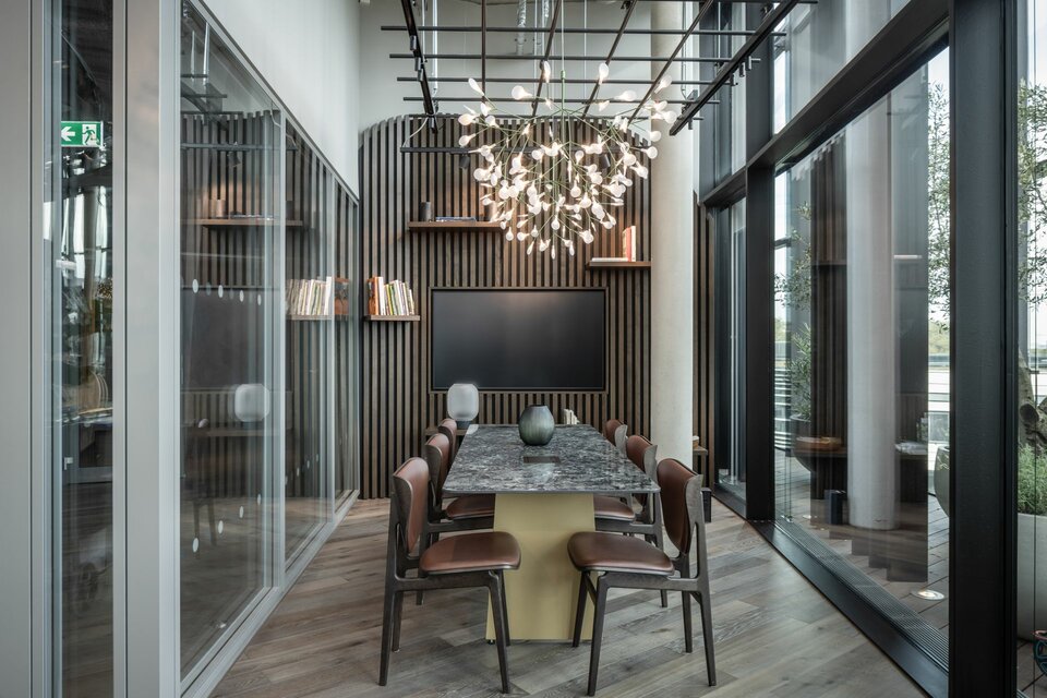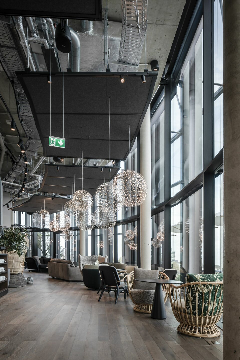 Lindner war beim Innenausbau des Projekts für eine Vielzahl von Leistungen verantwortlich. Die LMD-E 200 Einhängedecke sorgt für ein homogenes, elegantes Deckenbild, während die hochtransparente und schalldämmende Glastrennwand Lindner Life Stereo 125 den Innenräumen ein modernes und helles Ambiente verleiht. Um den hohen Schallschutzanforderungen gerecht zu werden, wurde außerdem der CAVOPEX comfort Hohlboden in einer Sonderausführung verbaut. Neben den gestalterischen Elementen umfasste das Leistungsspektrum der Lindner Group auch zahlreiche Ausbaugewerke: von Estrich- und Trockenbauarbeiten über Maler- und Bodenbelagsarbeiten bis hin zu Tischler- und Schlosserarbeiten. Auch der bauliche Brandschutz sowie die Installation von Gipskartonwänden und -decken wurden durchgeführt.