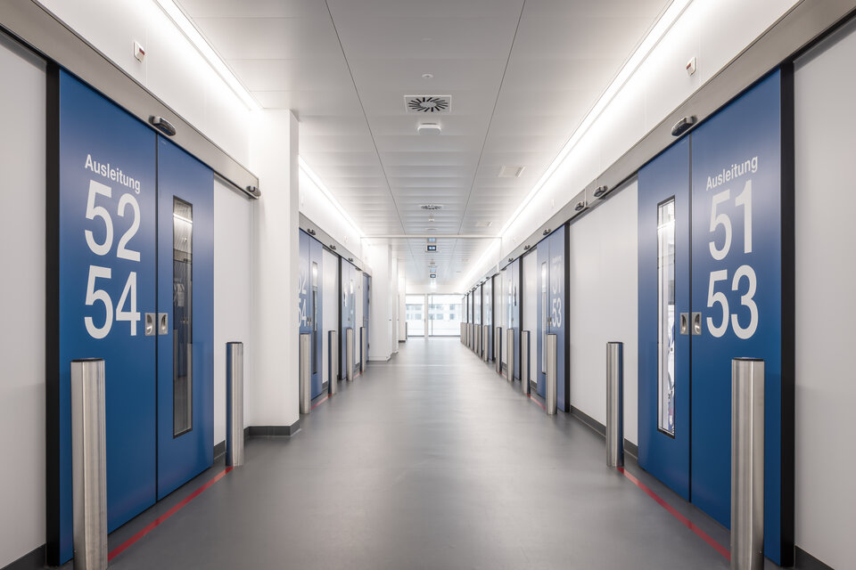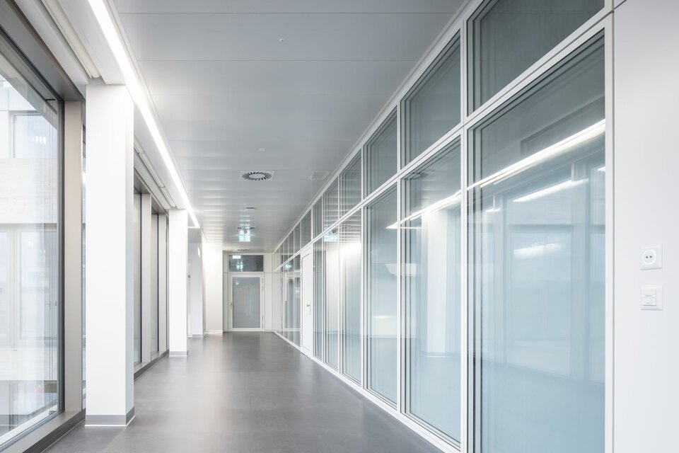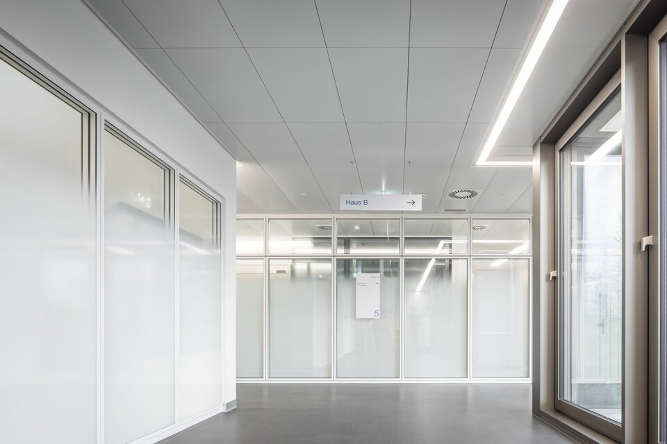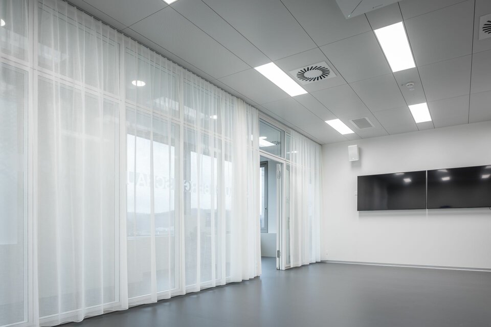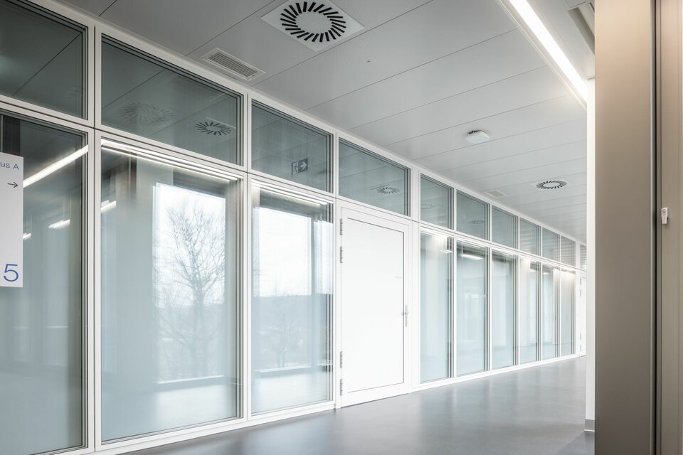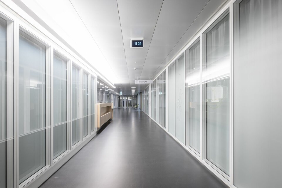 Im Innenbereich des Krankenhauses wurden zahlreiche Lindner Produkte verbaut: Glas fungierte dabei als zentrales Gestaltungselement im Innenausbau. Die transparenten Lindner Life Glastrennwände sowie die sondergefertigten Schiebefenster ermöglichen dank elektrischen und manuellen Jalousien auf Wunsch auch Diskretion. Das optische Highlight des Spitals sind die „Künstlerwände“ – Glaswände, die mit sandgestrahlten Kunstwerken verziert wurden. Die verbauten Planum Verglasungen mit Folienbeklebungen überzeugen weiterhin nicht nur in optischer Hinsicht, sondern auch mit ausgezeichnetem Brand-, Schall- und Strahlenschutz. Als Gegenspieler zu den zahlreichen Glaselementen im Klinikum treten Wandschalen aus Metall und Türelemente aus Holz auf.