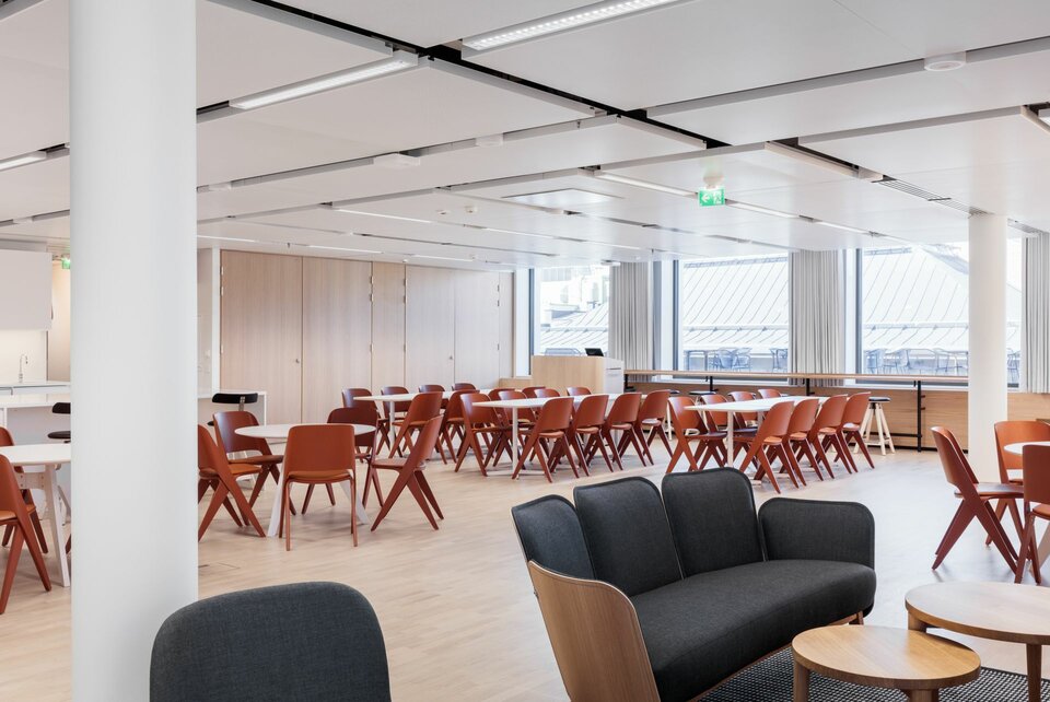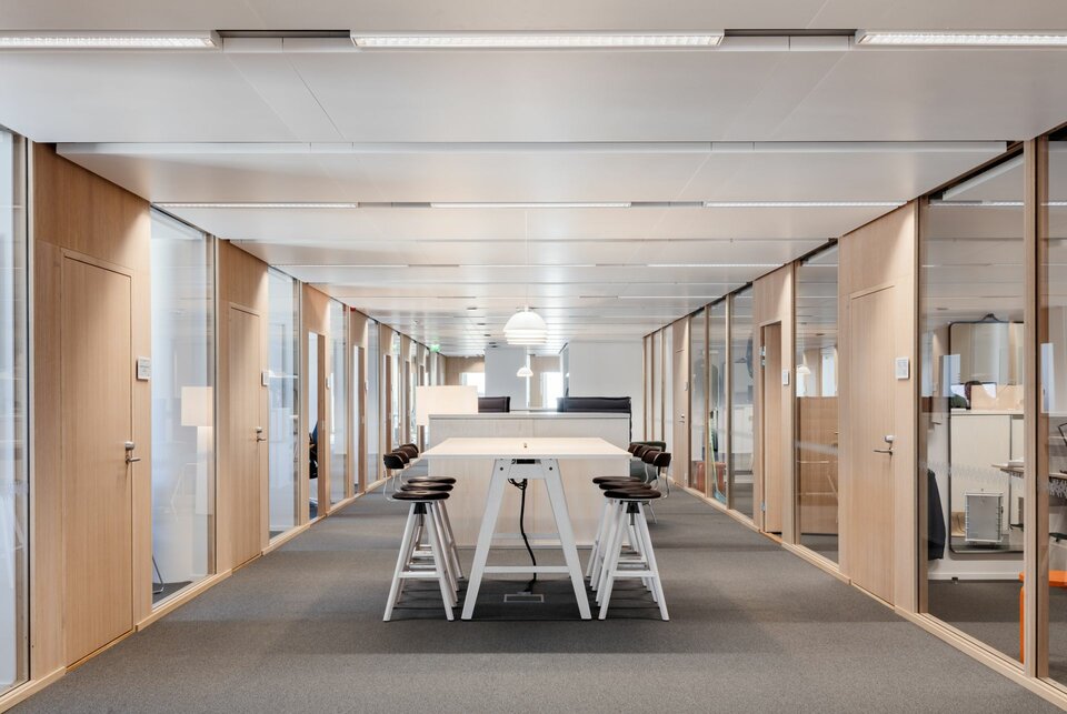 Neben hoher Flexibilität und Nachhaltigkeit weist das Projekt eine weitere Besonderheit auf: Das Kasarmikatu 21 ist das erste große Kühldeckenprojekt mit integrierten Leuchten in Finnland und gilt somit als eines der Leuchtturmprojekte. Die Lindner Group übernahm die Ausführung des außergewöhnlichen Deckensystems. Dazu stellte der Kunde einen Deckenspiegel bereit; Lindner führte dann im Nachgang die Positionierung, Auslegung der Kühldecken und die Detailklärung durch. Ergänzt wurden die Kühldecken durch kundenspezifische Sonderleuchten aus dem Hause Lindner.
