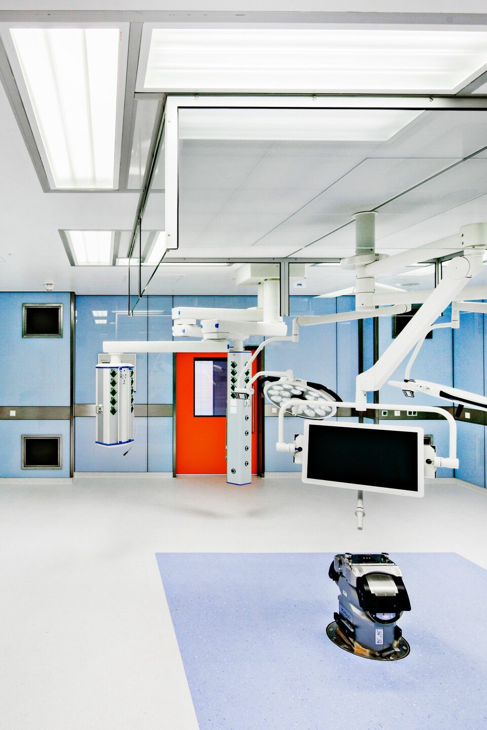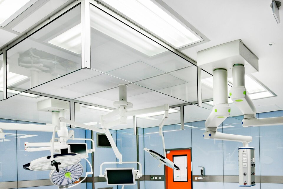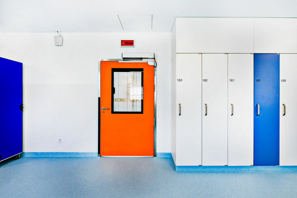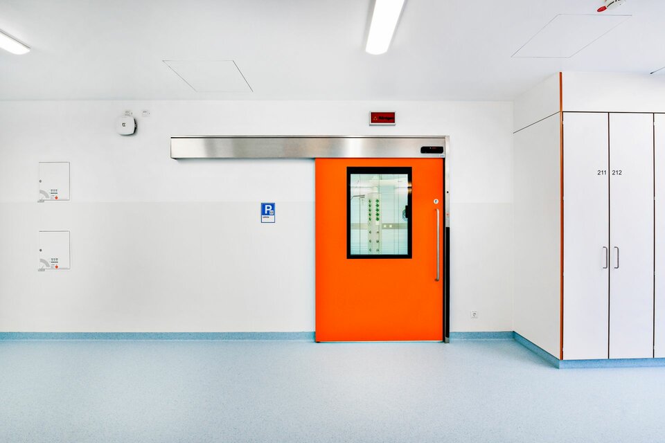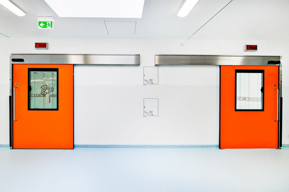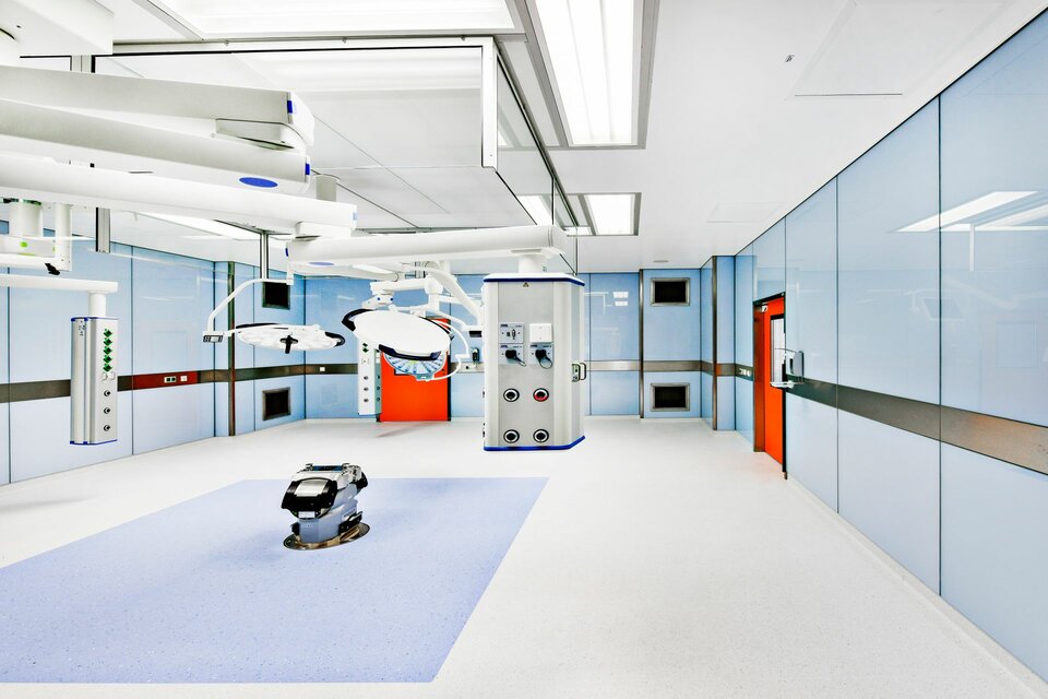 Lindner SE | Reinraumtechnik hat zum Ausbau der 14 OP-Säle beigetragen. Mit Gipskartonwänden wurden die Räume vom Flur abgegrenzt, der Zutritt erfolgt über Schiebe- bzw. Drehtüren. Die Drehtüren wurden mit Antrieben ausgestattet und sind teilweise mit T30-Brandschutz ausgeführt. In den OP-Sälen wurden Glas-Wandverkleidungen erstellt, eine hygienisch einwandfreie Lösung die verschiedene Einbauten wie z. B. Lüftungselemente und Bildschirmeinsätze nahtlos aufnimmt und die Haustechnik optisch ansprechend verbirgt. Aus technischer Sicht ergab sich die übergreifende Anforderung für alle Produkte, einen Strahlenschutz von 0,5 und bis zu 1,5 Pb zu gewährleisten.