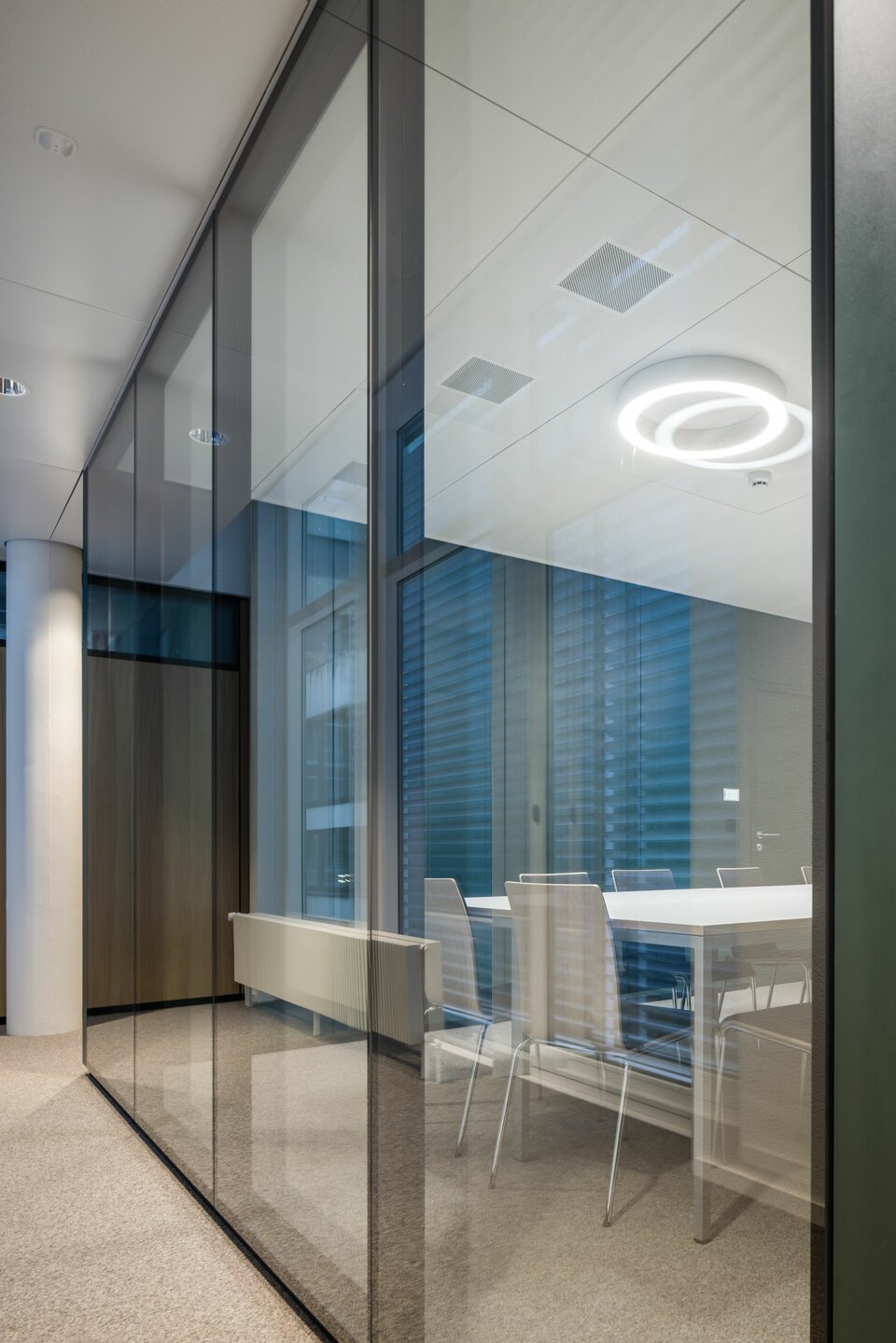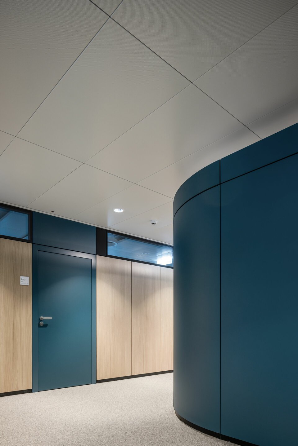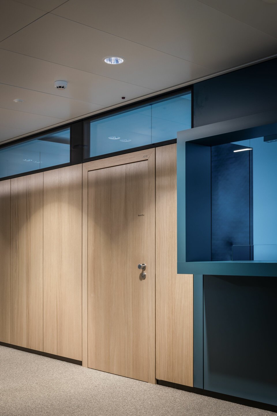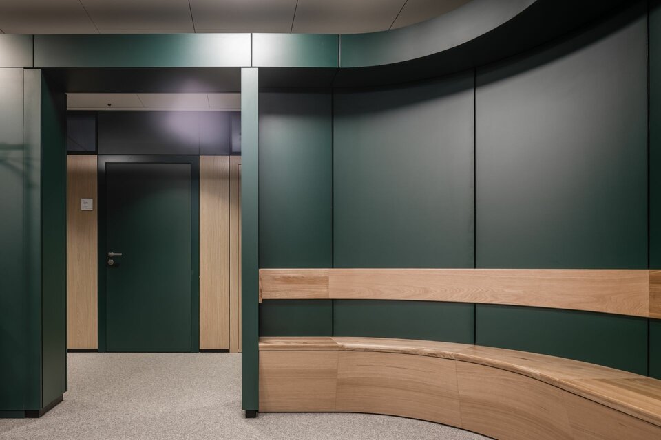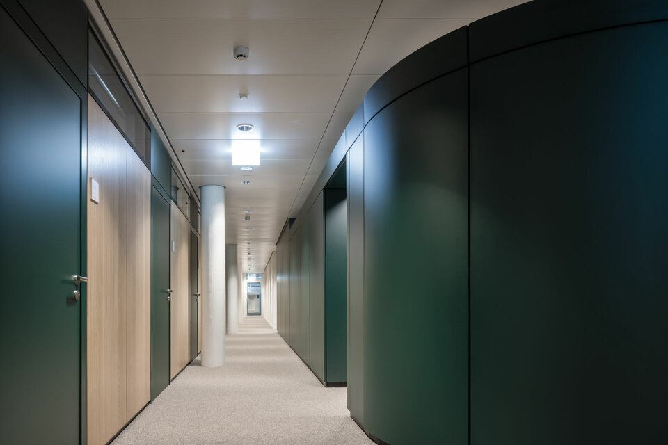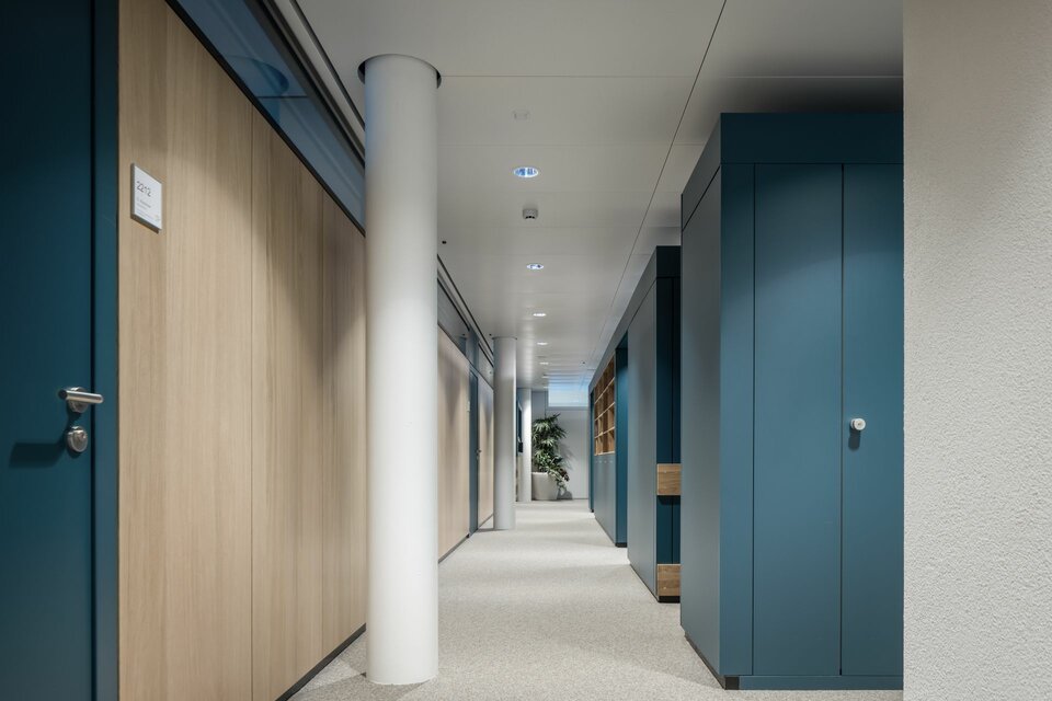 Lindner lieferte im Zuge der Umbaumaßnahmen maßgeschneiderte Leistungspakete für die individuellen Bedürfnisse des Mieters. Das Ambulatorium in den ersten beiden Obergeschossen im Finger D erhielt somit ein klares und elegantes Innendesign dank Glas- und Holztrennwänden. Diese wurden mit Türen und teilweise farbigem Holz kombiniert und dienen damit als Eyecatcher in den Räumlichkeiten. Ein frei stehender Wartebereich in Form eines offenen Cubes mit gerundeten Holzwandschalen sowie ein Empfangstresen wurden zudem als Sonderkonstruktion realisiert.