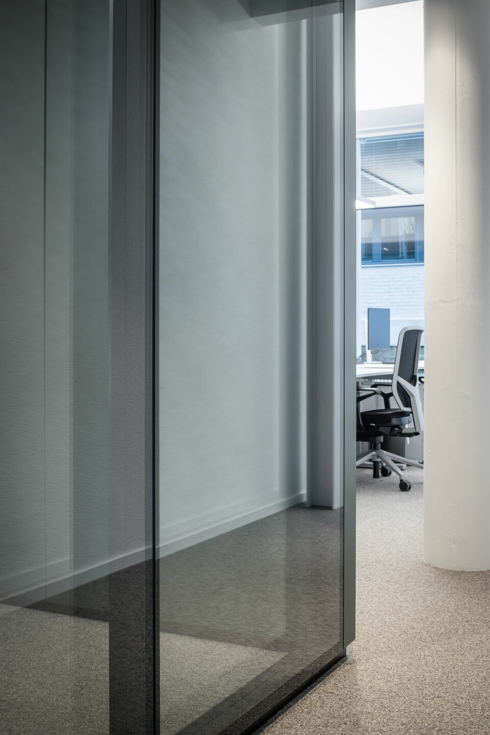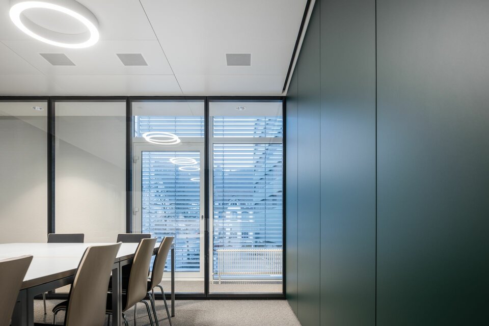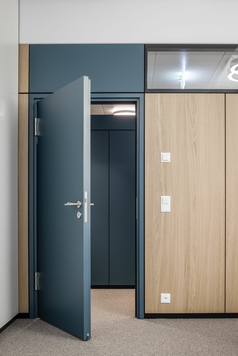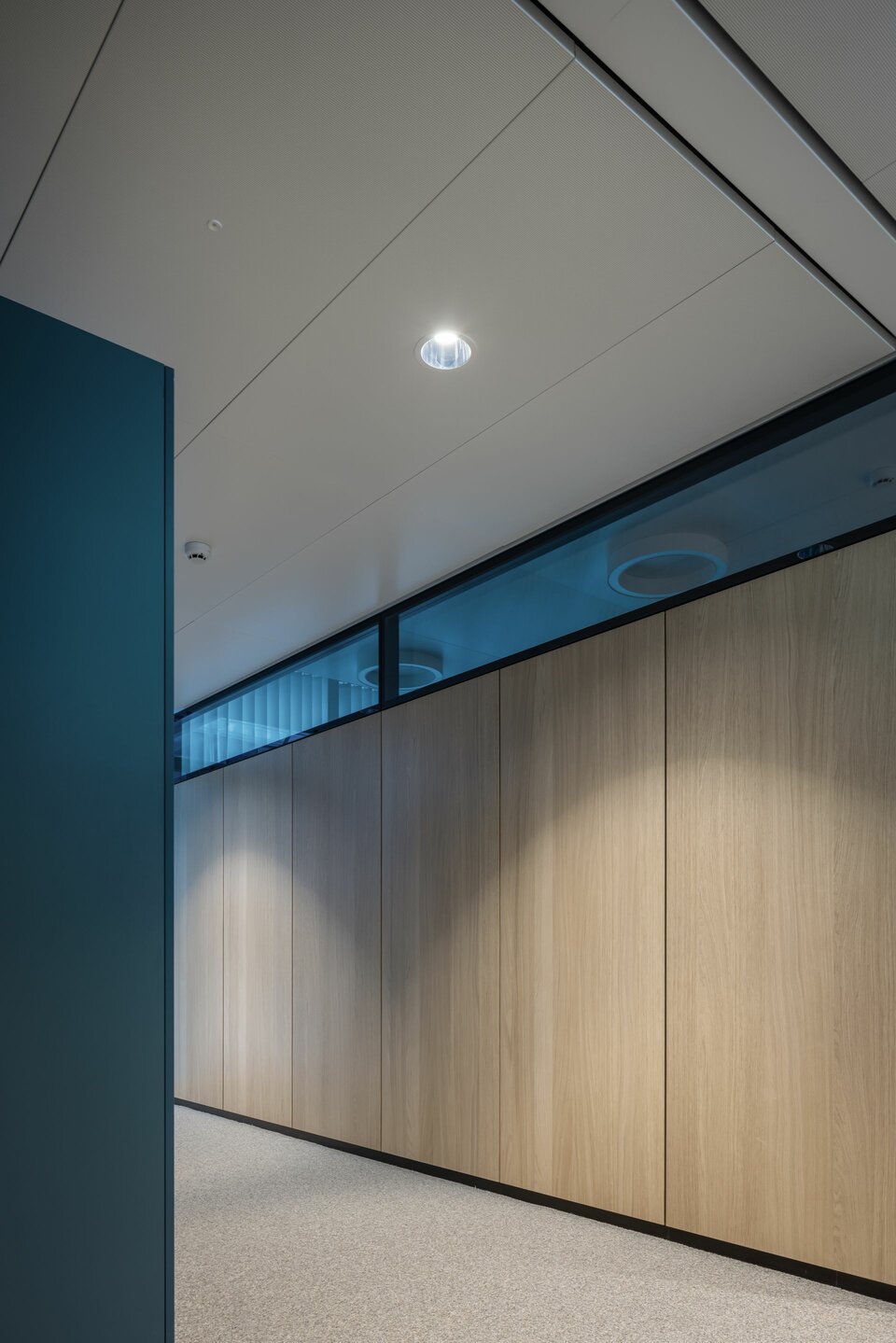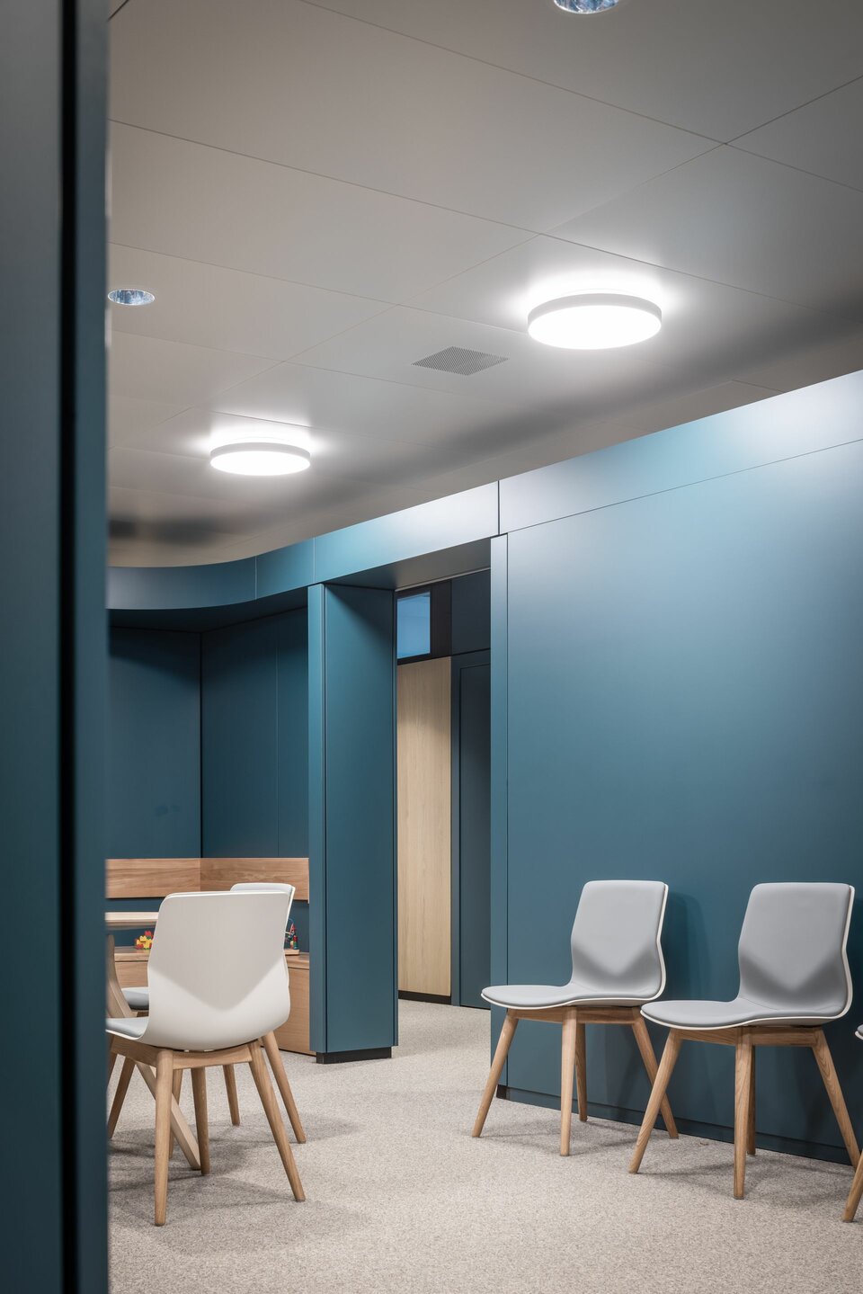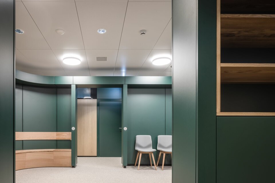 Lindner lieferte im Zuge der Umbaumaßnahmen maßgeschneiderte Leistungspakete für die individuellen Bedürfnisse des Mieters. Das Ambulatorium in den ersten beiden Obergeschossen im Finger D erhielt somit ein klares und elegantes Innendesign dank Glas- und Holztrennwänden. Diese wurden mit Türen und teilweise farbigem Holz kombiniert und dienen damit als Eyecatcher in den Räumlichkeiten. Ein frei stehender Wartebereich in Form eines offenen Cubes mit gerundeten Holzwandschalen sowie ein Empfangstresen wurden zudem als Sonderkonstruktion realisiert.