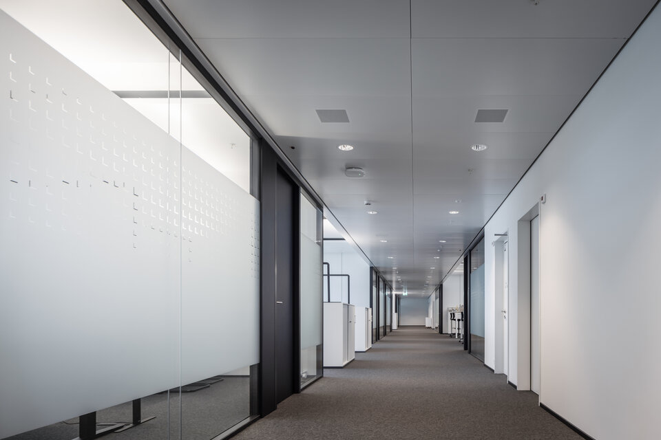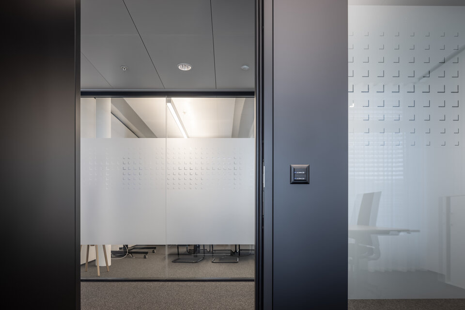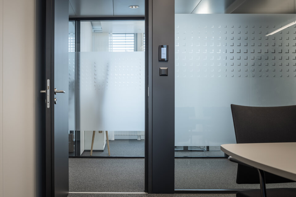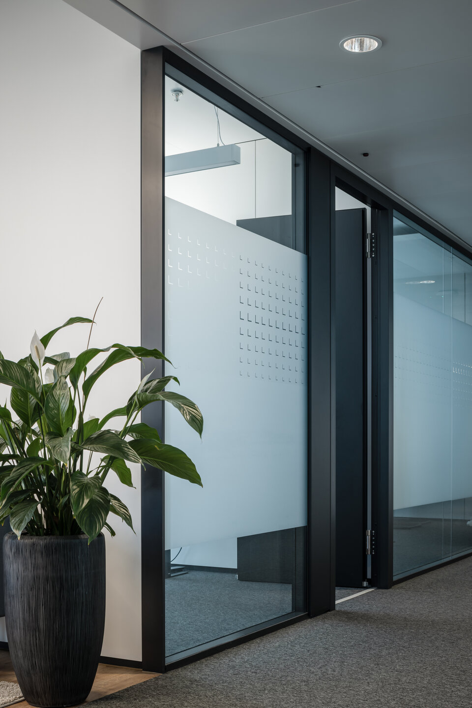 Dank des hohen Glasanteils und der schmalen Aluminium-Profile schaffen die Glastrennwände eine lichtdurchflutete, offene Arbeitsumgebung. Die ständerlose Ganzglaskonstruktion verstärkt die Transparenz, gleichzeitig wird dank exzellenter Schalldämmung eine ruhige, konzentrierte Atmosphäre in den Büroräumen gewährleistet. Das wohlige Ambiente wird durch einflüglige Holztüren HTB 68 mit Schalterpaneele/Installationspaneele ergänzt.