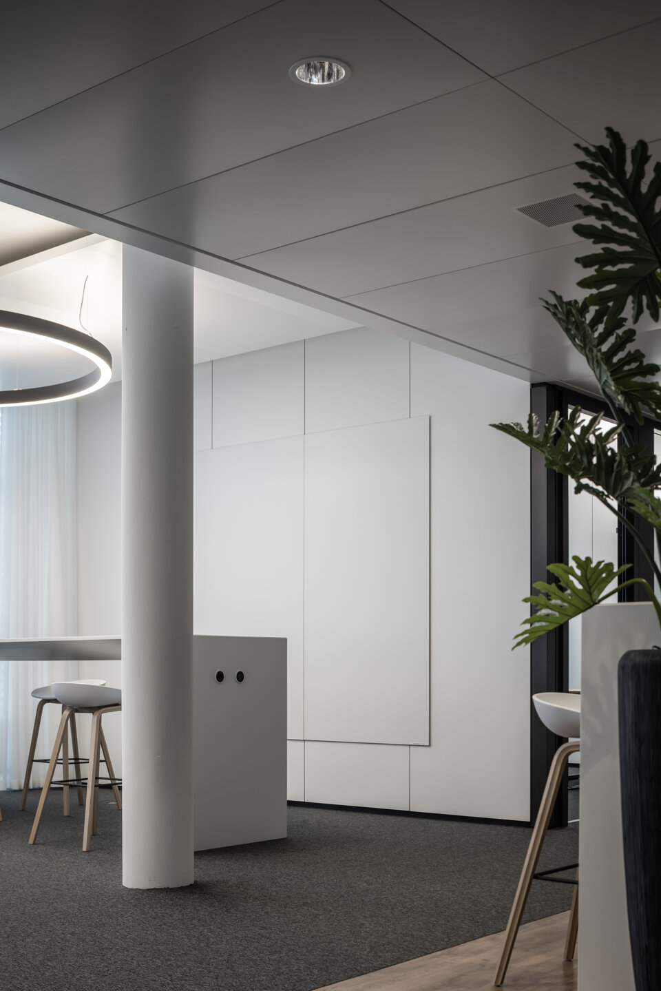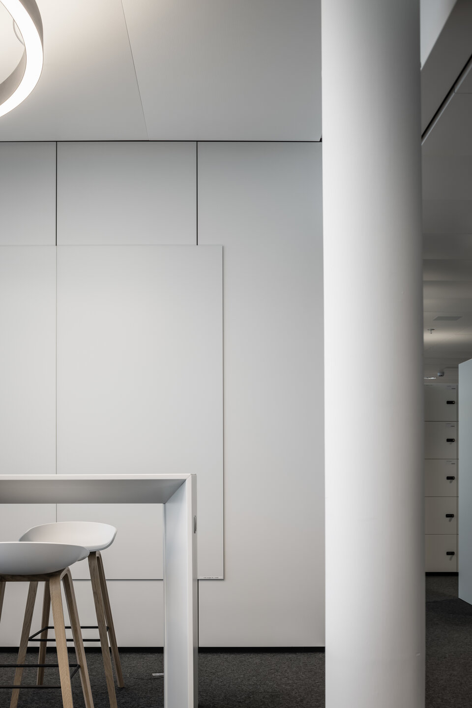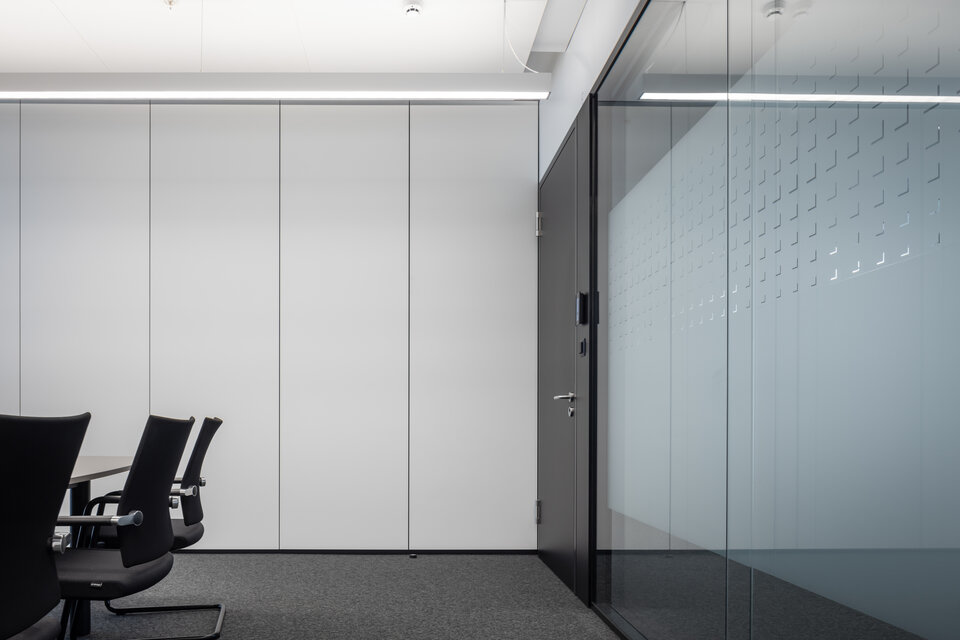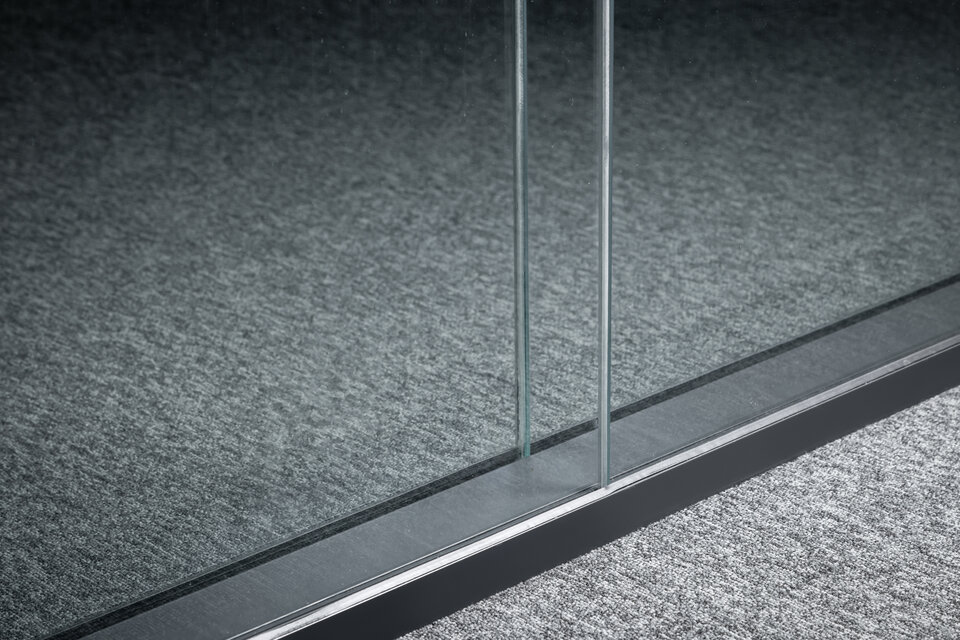 Dank des hohen Glasanteils und der schmalen Aluminium-Profile schaffen die Glastrennwände eine lichtdurchflutete, offene Arbeitsumgebung. Die ständerlose Ganzglaskonstruktion verstärkt die Transparenz, gleichzeitig wird dank exzellenter Schalldämmung eine ruhige, konzentrierte Atmosphäre in den Büroräumen gewährleistet. Das wohlige Ambiente wird durch einflüglige Holztüren HTB 68 mit Schalterpaneele/Installationspaneele ergänzt.