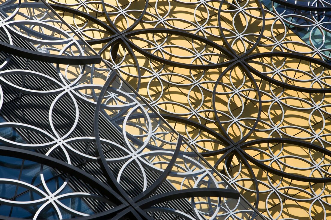Die Lindner Fassaden GmbH lieferte in enger Abstimmung mit Architekt und Baumanagement die außergewöhnliche Gebäudehülle der Library. Die Elementfassade wird optisch noch durch Aluminiumringe ergänzt, von denen die Größten Durchmesser von bis zu 6,5 Meter erreichen.