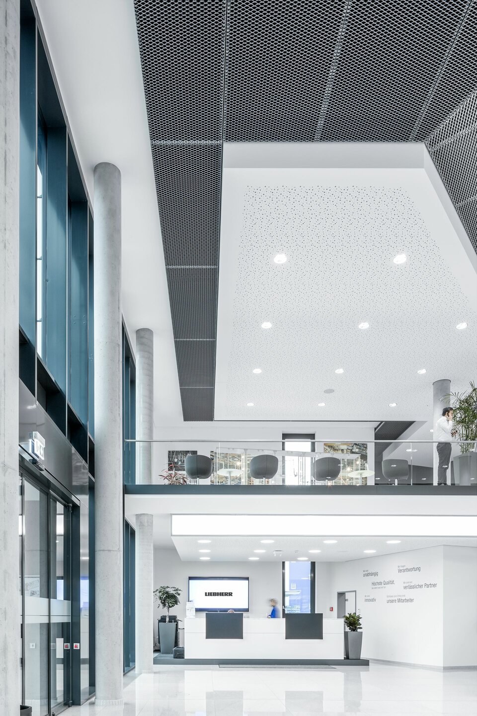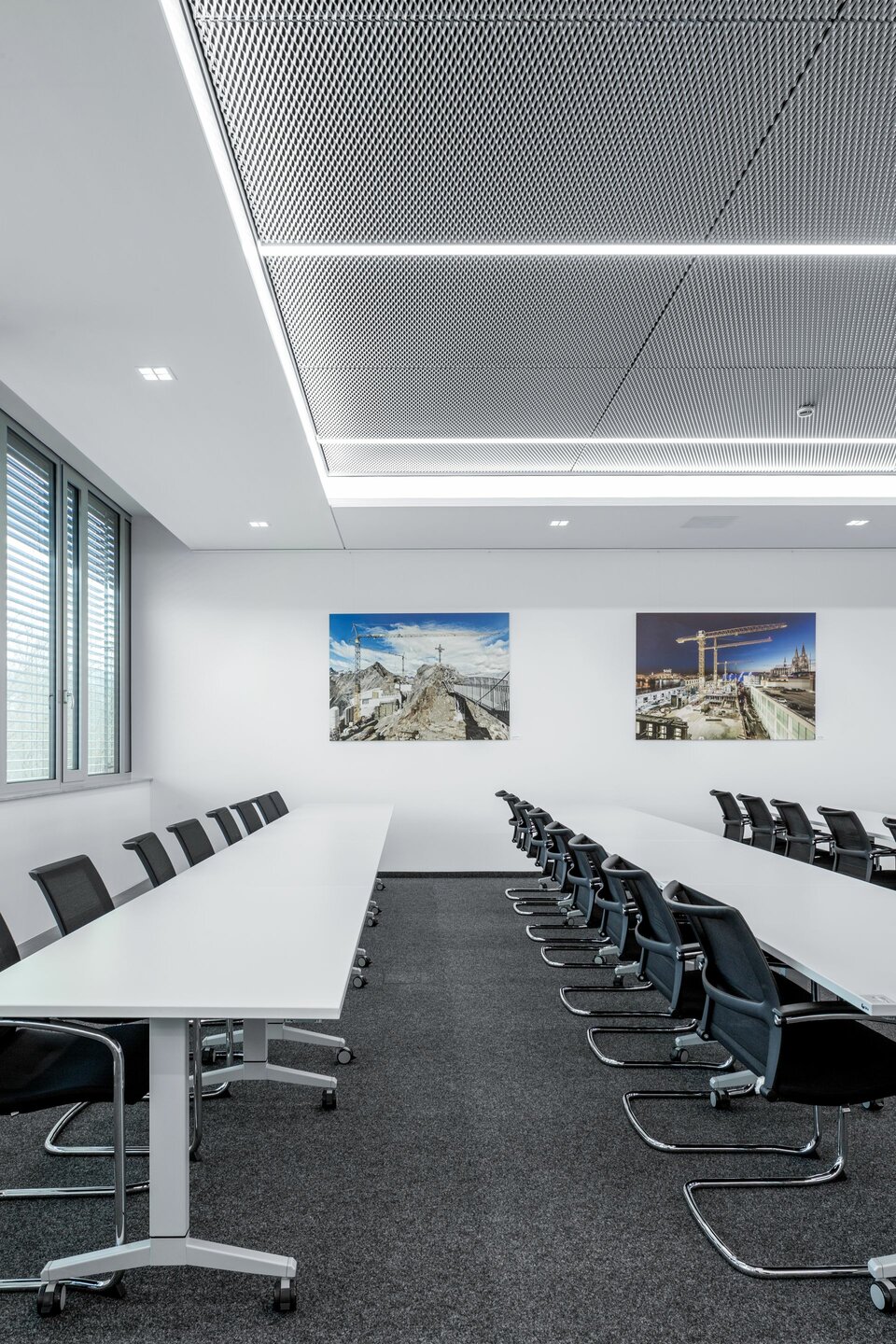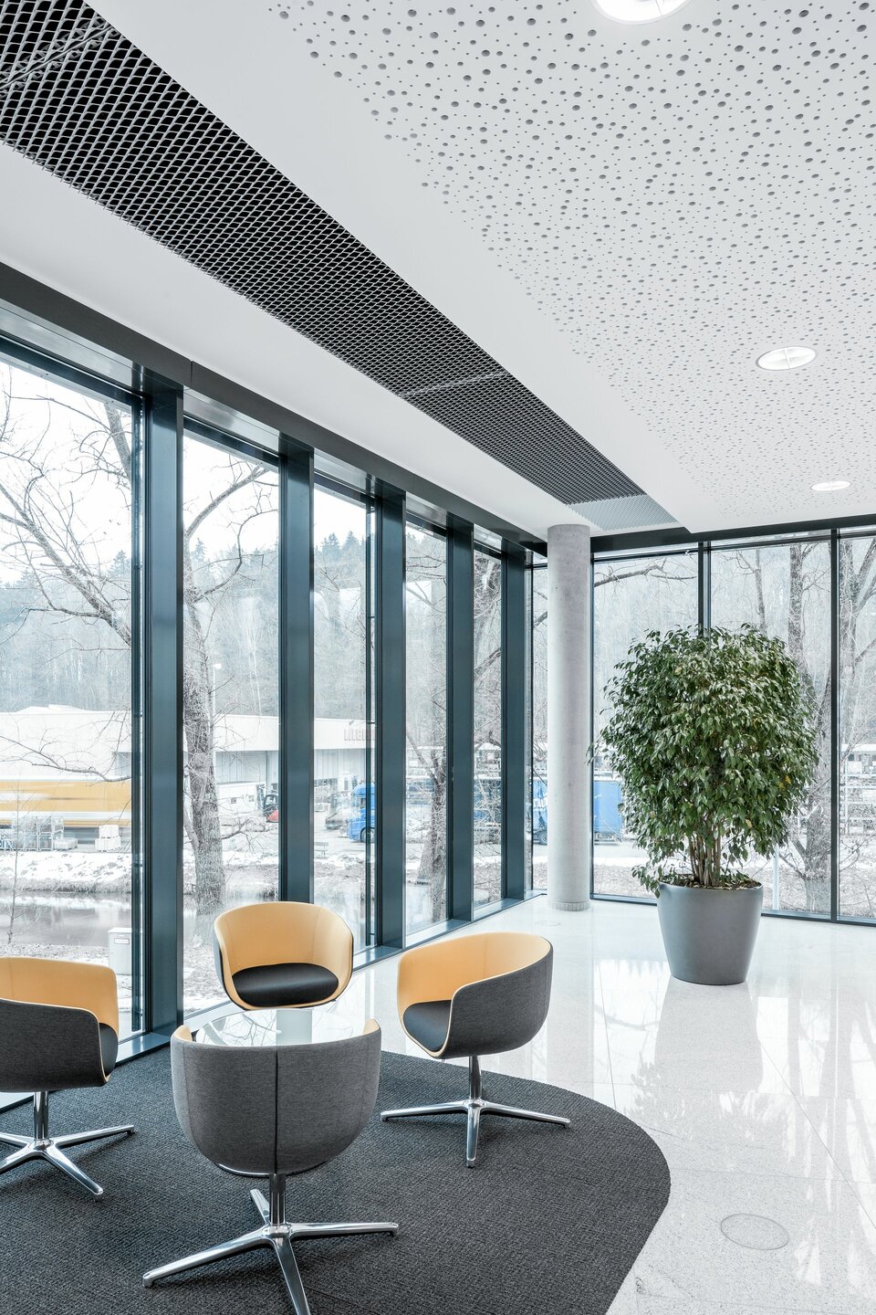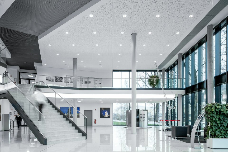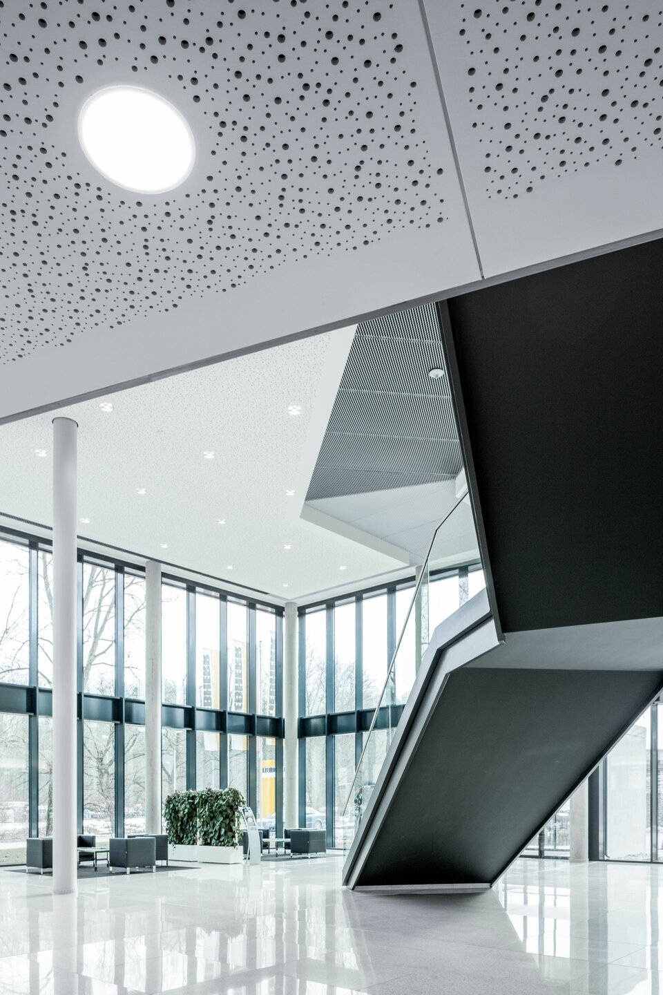 Die Lindner Group stattete die Büroflächen im neuen Vertriebs- und Verwaltungszentrum großflächig mit Bandrasterdecken aus und realisierte im Foyer im Erdgeschoss Streckmetalldecken und akustisch optimierte Lochdecken aus Gipskarton. Als Übergang zwischen Streckmetall und Gipskarton verwendete man als besonderes Highlight LED-Lichtstreifen. Auch die Einhängeheiz-/kühldecke vom Typ Plafotherm® E 213 im Personalbüro und die Streckmetalldecke im Tagungszentrum setzte Lindner um.