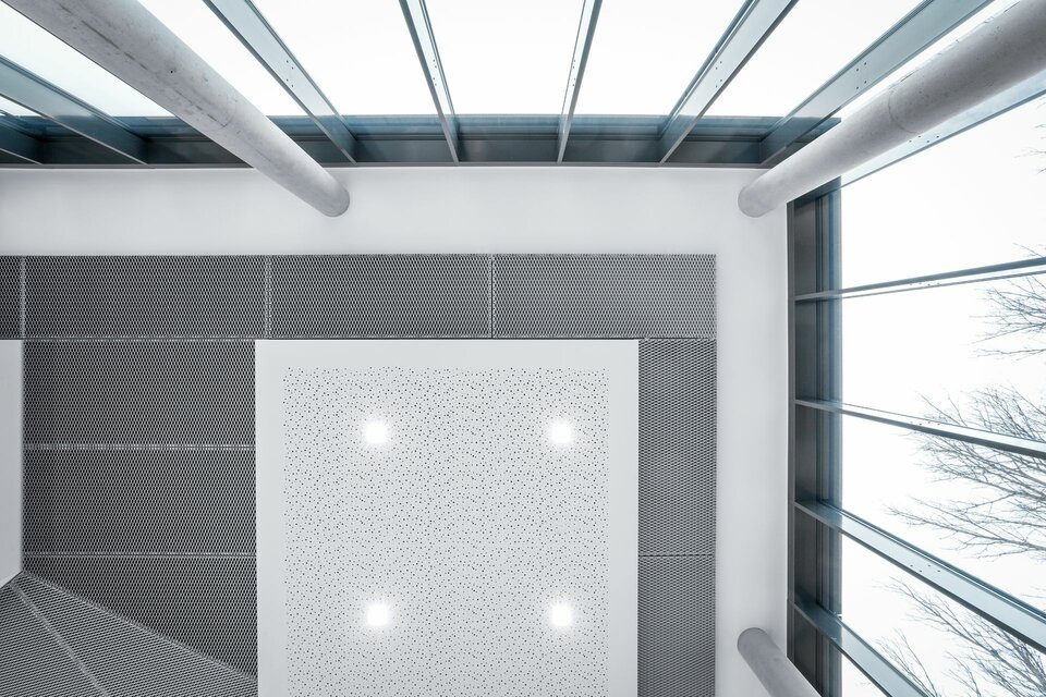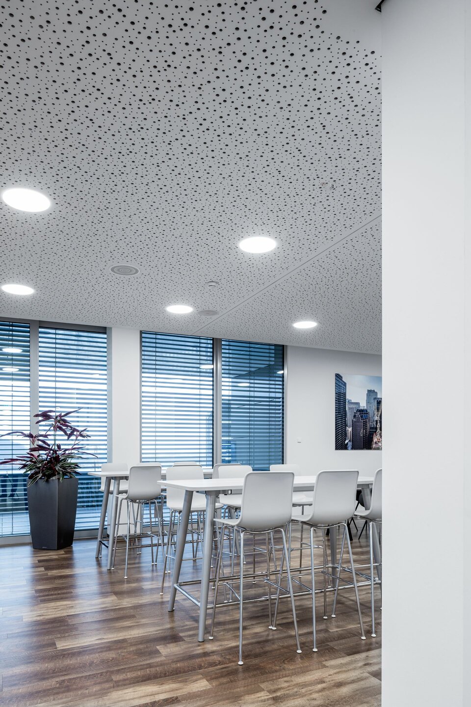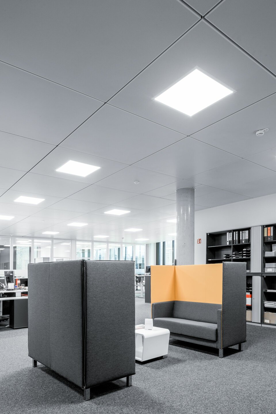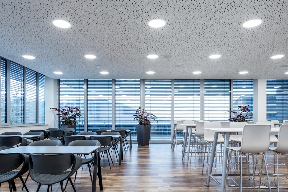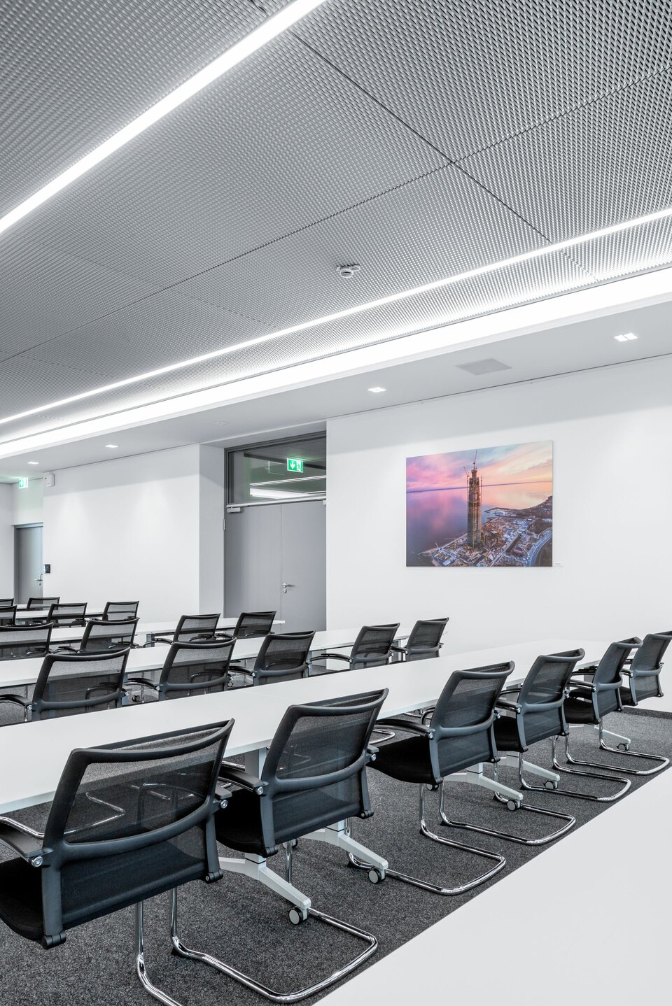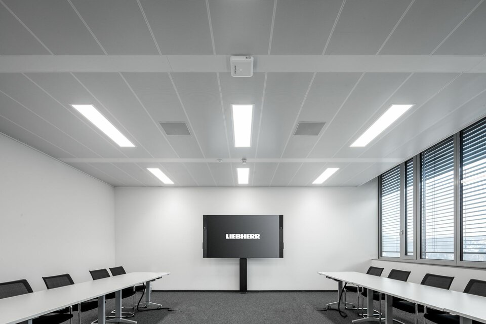 Die Lindner Group stattete die Büroflächen im neuen Vertriebs- und Verwaltungszentrum großflächig mit Bandrasterdecken aus und realisierte im Foyer im Erdgeschoss Streckmetalldecken und akustisch optimierte Lochdecken aus Gipskarton. Als Übergang zwischen Streckmetall und Gipskarton verwendete man als besonderes Highlight LED-Lichtstreifen. Auch die Einhängeheiz-/kühldecke vom Typ Plafotherm® E 213 im Personalbüro und die Streckmetalldecke im Tagungszentrum setzte Lindner um.
