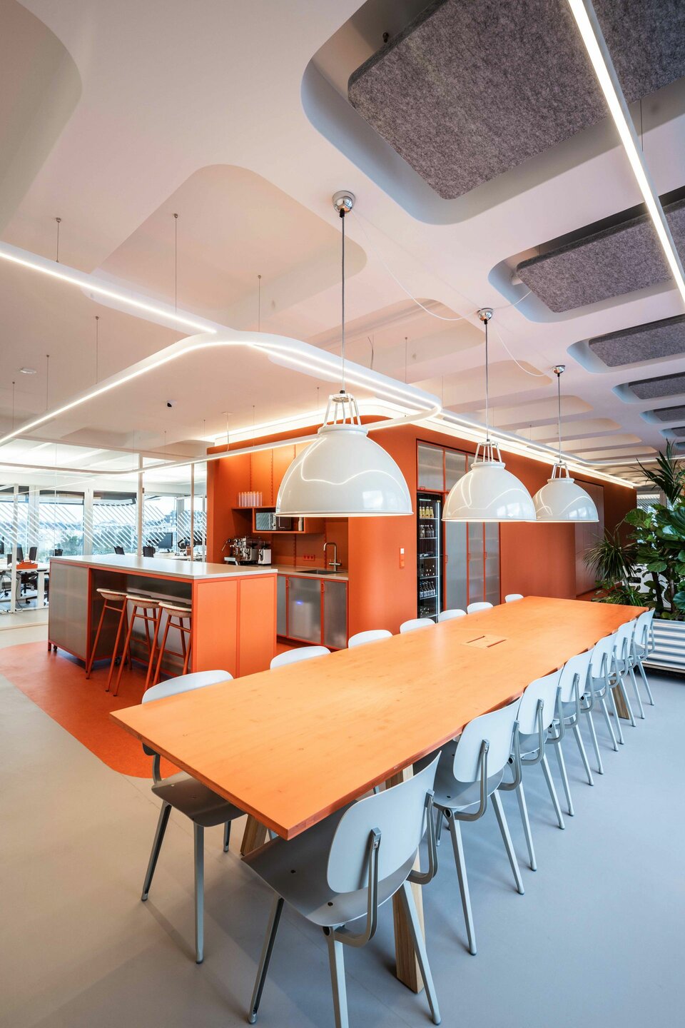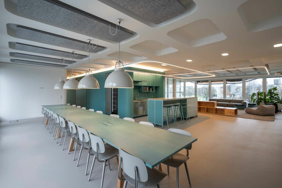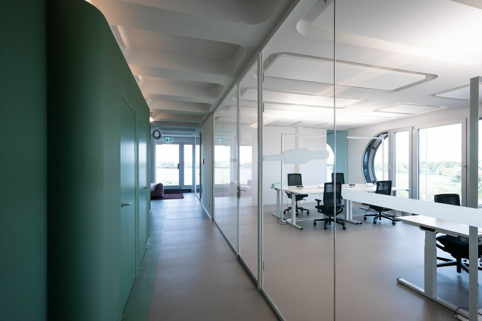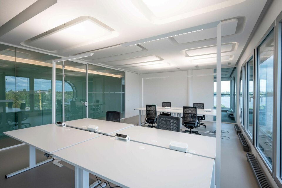 Der Bestandsbau von 2007 ist bekannt für seine „schwimmenden Augen“, die sich als Designelement in der Fassade und in den Innenräumen durchziehen, so auch als Aussparungen in den Betondecken. Diese Aussparungen nutzten die Architekten, um die Akustik bzw. die Nachhallzeit im Raum zu optimieren. Dabei musste aber beachtet werden, dass die Betonkernaktivierung der Decke nicht geschwächt werden durfte. Lindner empfahl hierfür die Mute+® Schallabsorber: Diese lassen sich perfekt in die Deckenaussparungen einfügen und sorgen dank einer vorhergehenden Berechnung und Simulation auch für optimale Raumakustik. Im Hinblick auf nachhaltiges und zirkuläres Bauen konnte Lindner BAID ebenfalls effektiv unterstützen. Mute+® sind leicht rückbaubar und bestehen aus schadstoffgeprüften Materialien. Die Glastrennwände im Bestand waren zum Teil noch sehr gut erhalten. So entschied man sich, einen Teil der Glaselemente nach einer Reinigung mit neuen Profilen der Lindner Life Pure 620 weiterzuverwenden. Weitere Büroflächen wurden mit neuen Lindner Life Stereo 125 Trennwänden separiert, die ebenfalls sehr gut rückbaubar und wiederverwendbar sind. Im Rahmen des Mieterausbaus kümmerte sich Lindner ebenso um Sanierung und Fresh-up der vorhandenen Büroflächen sowie der Teeküchen, Sanitärräume, offenen Meeting-Points und Lounges.