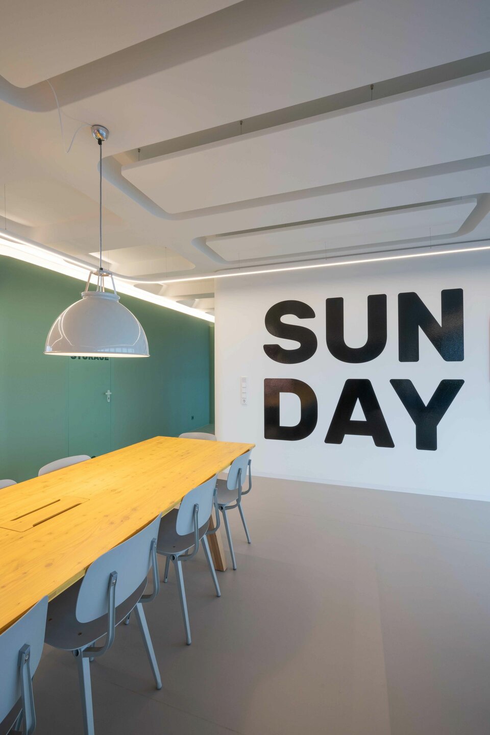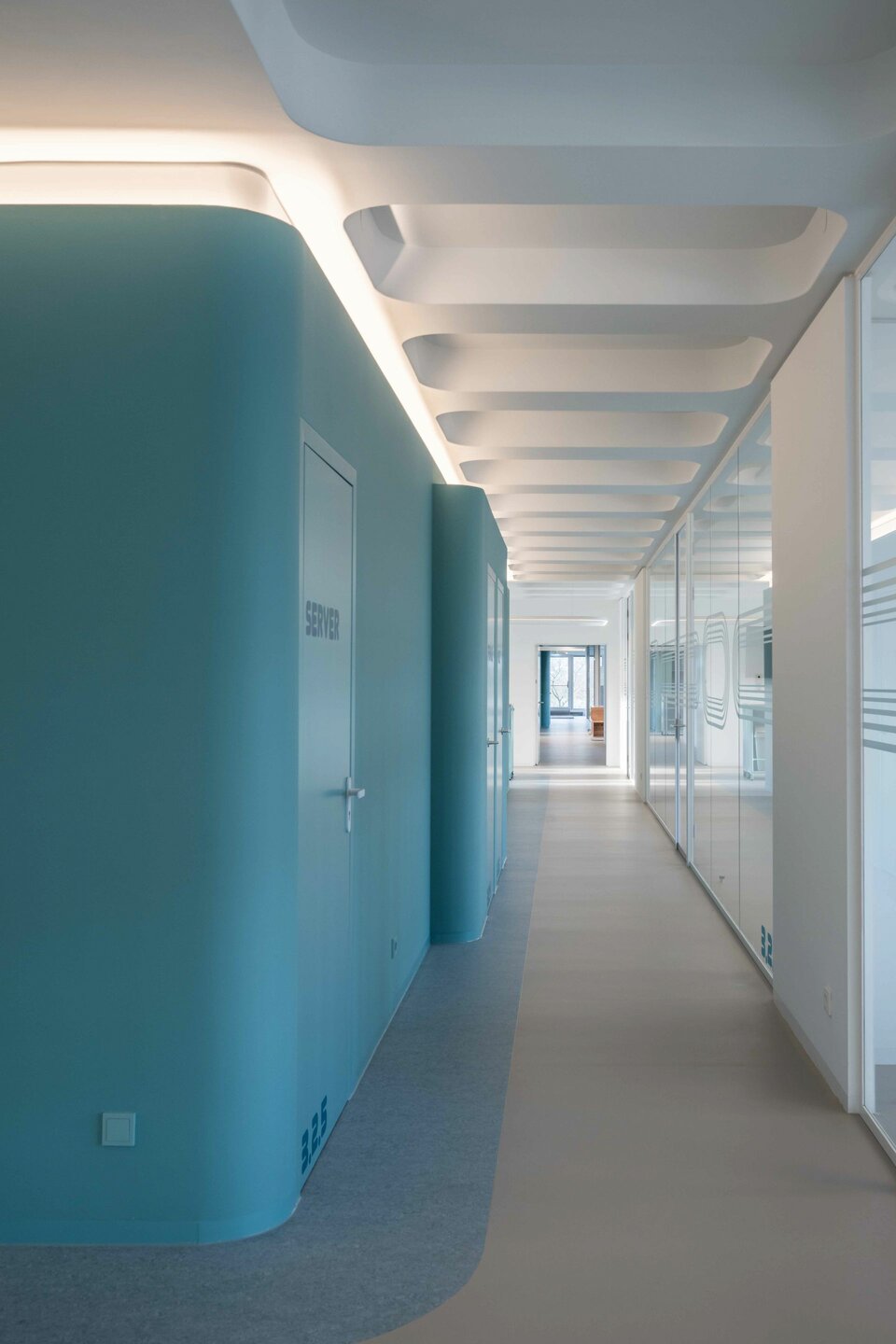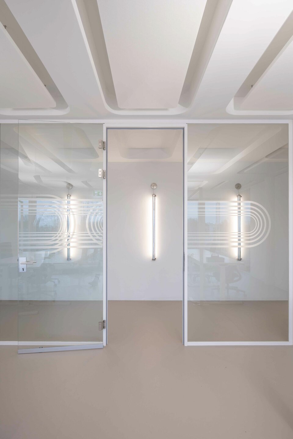 Der Bestandsbau von 2007 ist bekannt für seine „schwimmenden Augen“, die sich als Designelement in der Fassade und in den Innenräumen durchziehen, so auch als Aussparungen in den Betondecken. Diese Aussparungen nutzten die Architekten, um die Akustik bzw. die Nachhallzeit im Raum zu optimieren. Dabei musste aber beachtet werden, dass die Betonkernaktivierung der Decke nicht geschwächt werden durfte. Lindner empfahl hierfür die Mute+® Schallabsorber: Diese lassen sich perfekt in die Deckenaussparungen einfügen und sorgen dank einer vorhergehenden Berechnung und Simulation auch für optimale Raumakustik. Im Hinblick auf nachhaltiges und zirkuläres Bauen konnte Lindner BAID ebenfalls effektiv unterstützen. Mute+® sind leicht rückbaubar und bestehen aus schadstoffgeprüften Materialien. Die Glastrennwände im Bestand waren zum Teil noch sehr gut erhalten. So entschied man sich, einen Teil der Glaselemente nach einer Reinigung mit neuen Profilen der Lindner Life Pure 620 weiterzuverwenden. Weitere Büroflächen wurden mit neuen Lindner Life Stereo 125 Trennwänden separiert, die ebenfalls sehr gut rückbaubar und wiederverwendbar sind. Im Rahmen des Mieterausbaus kümmerte sich Lindner ebenso um Sanierung und Fresh-up der vorhandenen Büroflächen sowie der Teeküchen, Sanitärräume, offenen Meeting-Points und Lounges.