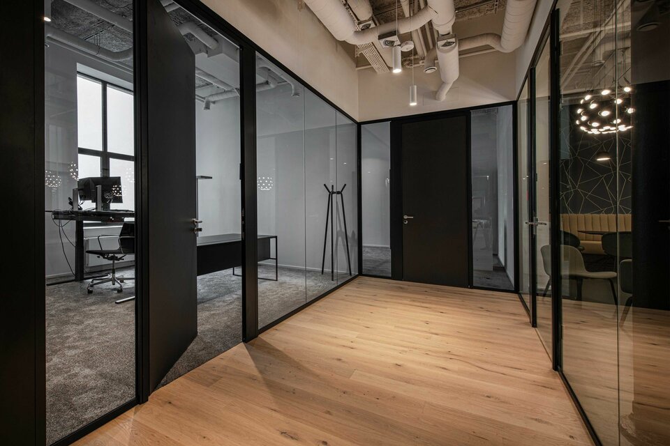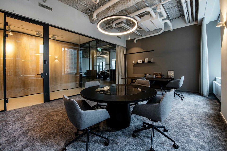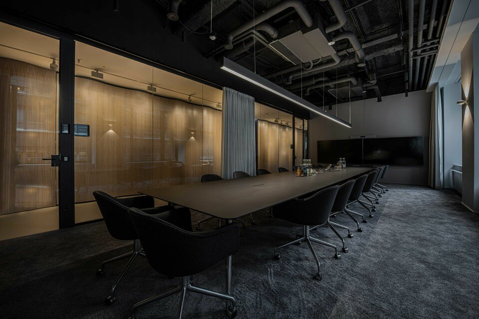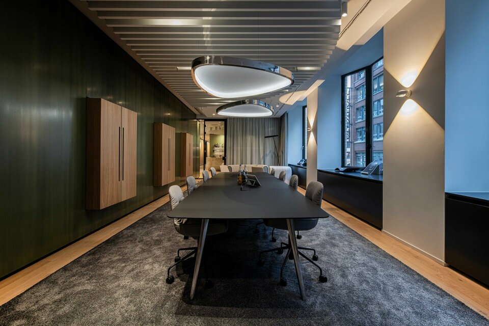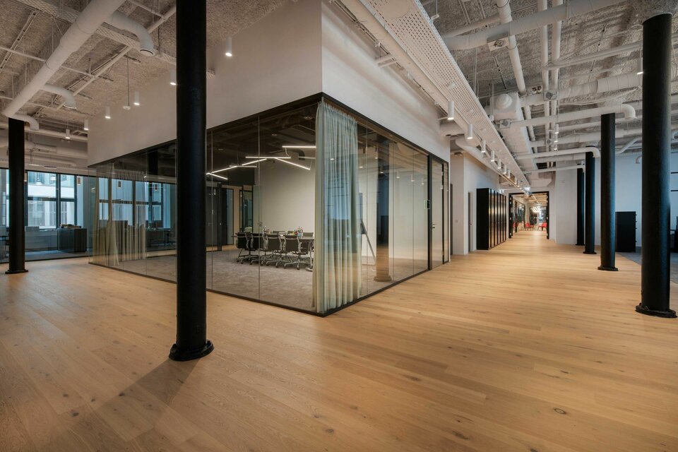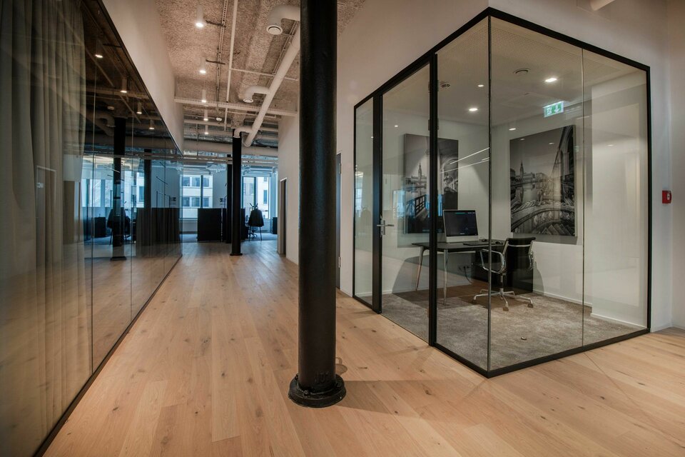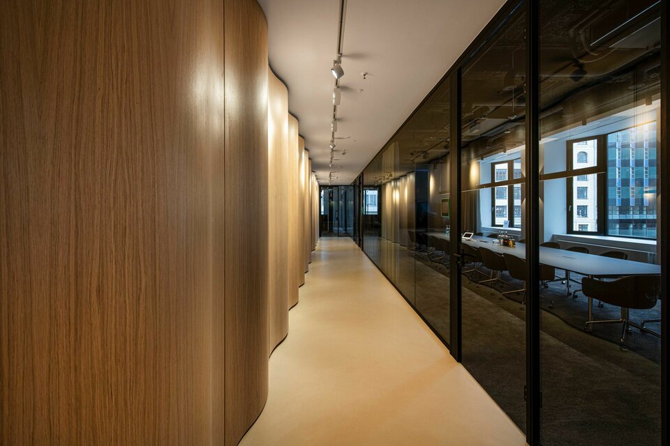 Einzelne Besprechungsräume und Rückzugsorte wurden mit der Lindner Life Pure Glastrennwand und passenden Glas- oder Holztüren separiert. Zusätzlich sorgen Lamellendecken aus perforierten Leichtbauplatten mit integrierten Lichtleisten für bessere Akustik und optimales Licht in den offenen Bereichen. Lindner war im Kaufmannshaus nicht nur für Lieferung und Montage von Ausbausystemen zuständig, sondern war von Anfang bis Ende Partner für die gesamte Abwicklung des Mieterausbaus, sowie in Teilen für die Ausführungsplanung des Ausbaus.