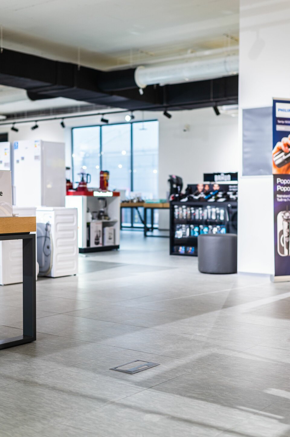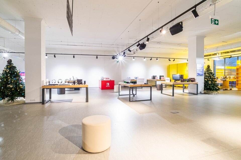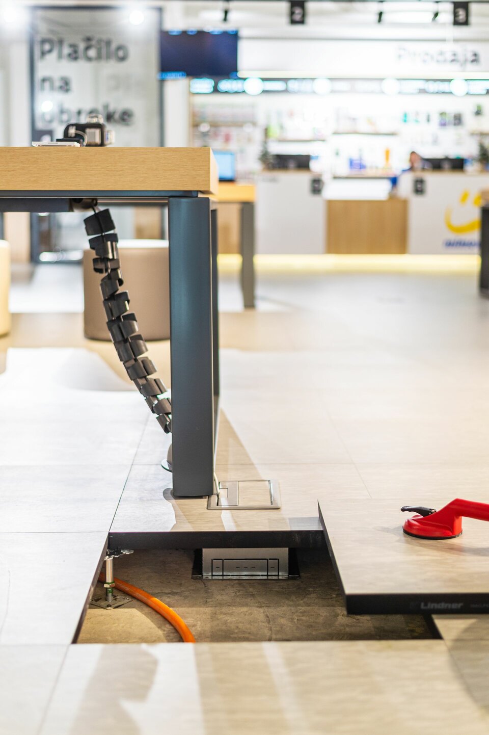 Lindner hat zum Innenausbau dieser Fläche mit Doppelbodensystemen des Typs LIGNA beigetragen. Die Bodenplatten werden dabei mittels Stützen vom Rohboden aufgeständert. Bei diesem Projekt wurde ein Hohlraum von 100 mm geschaffen, in dem diverse Installationen wie z. B. Kabeltrassen geschickt verborgen werden können. Der Aufbau als Doppelboden erlaubt es zudem, einzelne Platten an jeder beliebigen Stelle aus der Bodenfläche zu entfernen und somit auf den darunter liegenden Hohlraum Zugriff zu erlangen. Dies begünstigt Wartungsarbeiten sowie räumliche Veränderungen in der Verkaufsfläche. Zusätzliche Flexibilität wird über Elektranten und Kabelauslässe erreicht, welche nahtlos in die Bodenplatten eingearbeitet sind und somit schnelle Zugriffe auf die technischen Installationen ermöglichen.
