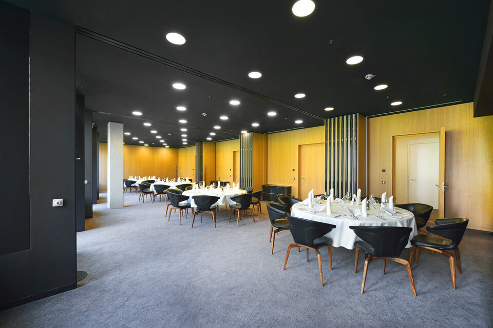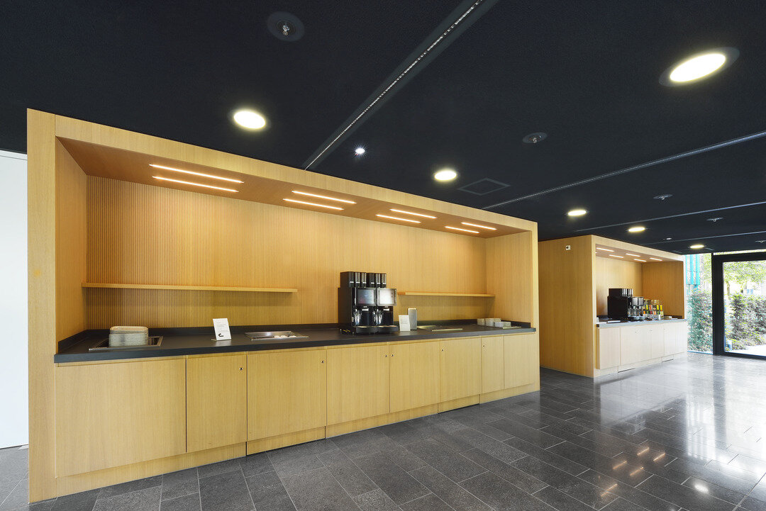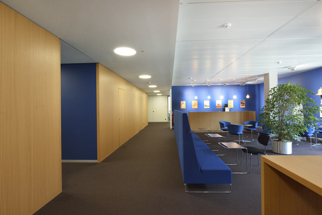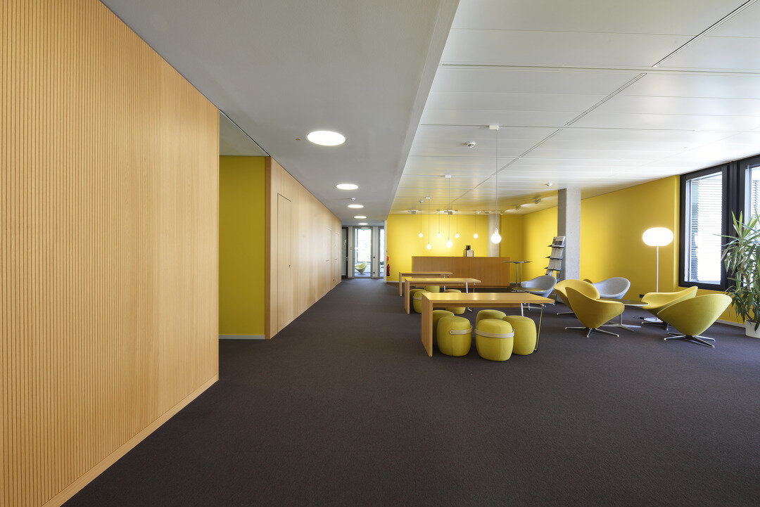 Die Optik der Räumlichkeiten ist geprägt von einem Zusammenspiel von Gipskarton oder auch Metall mit dem Naturwerkstoff Holz. Der warme Charakter des Holzes bringt eine gewisse Wohnlichkeit in die Flächen des Verwaltungsgebäudes. Für die facettenreichen Holzarbeiten wurde die Lindner Objektdesign GmbH beauftragt. Der Leistungsumfang bei diesem Projekt umfasst unter anderem Holzwandverkleidungen, welche vor allem in Flurbereichen und Versammlungsstätten im Gebäude installiert wurden. Sie sind akustisch wirksam und erfüllen – je nach Bedarf – Brandschutzanforderungen bis hin zur Klasse A2. Weitere ausgeführte Tischlerarbeiten bestehen aus mobilen Trennwandanlagen, WC-Trennwandsystemen, Handläufen, Einbauküchen und auch dem Empfangstresen.
