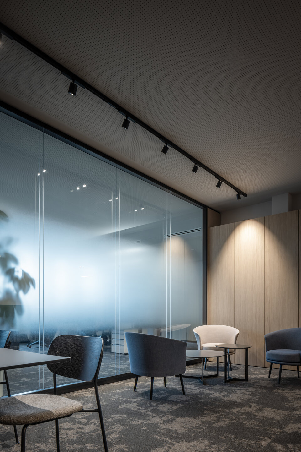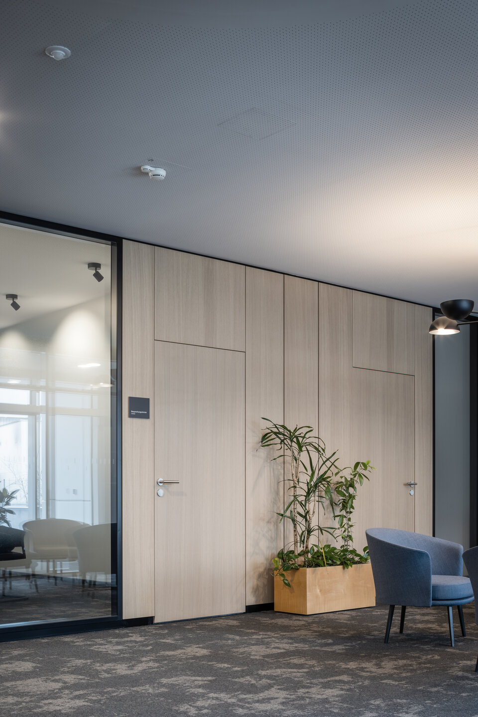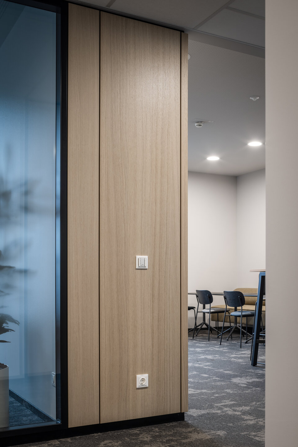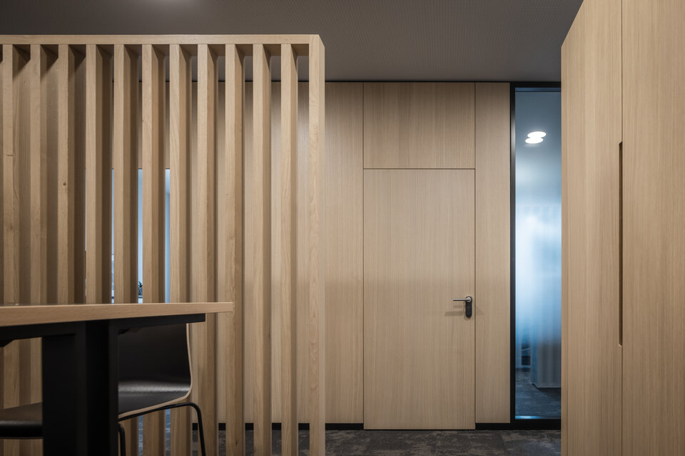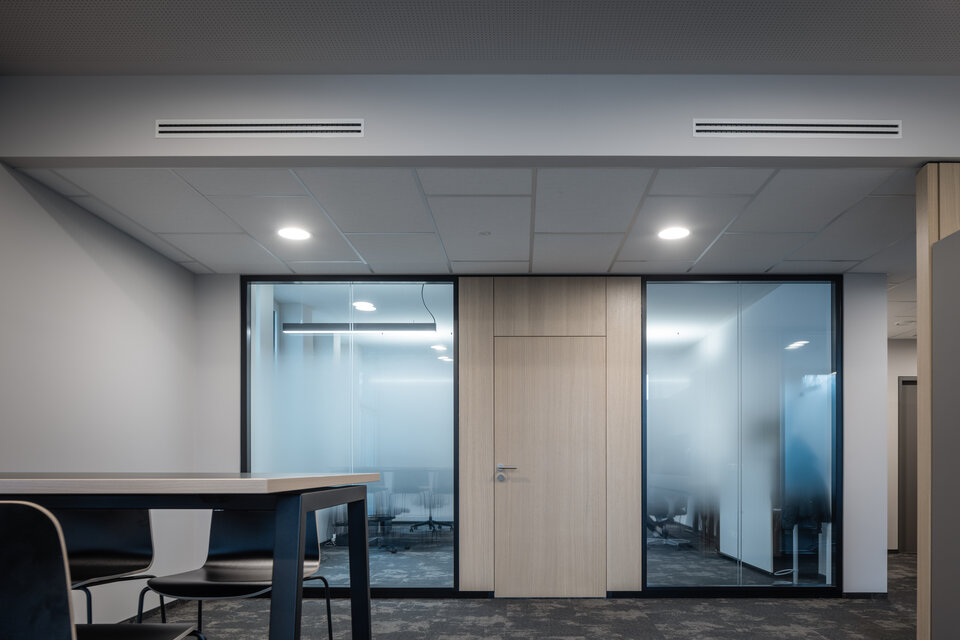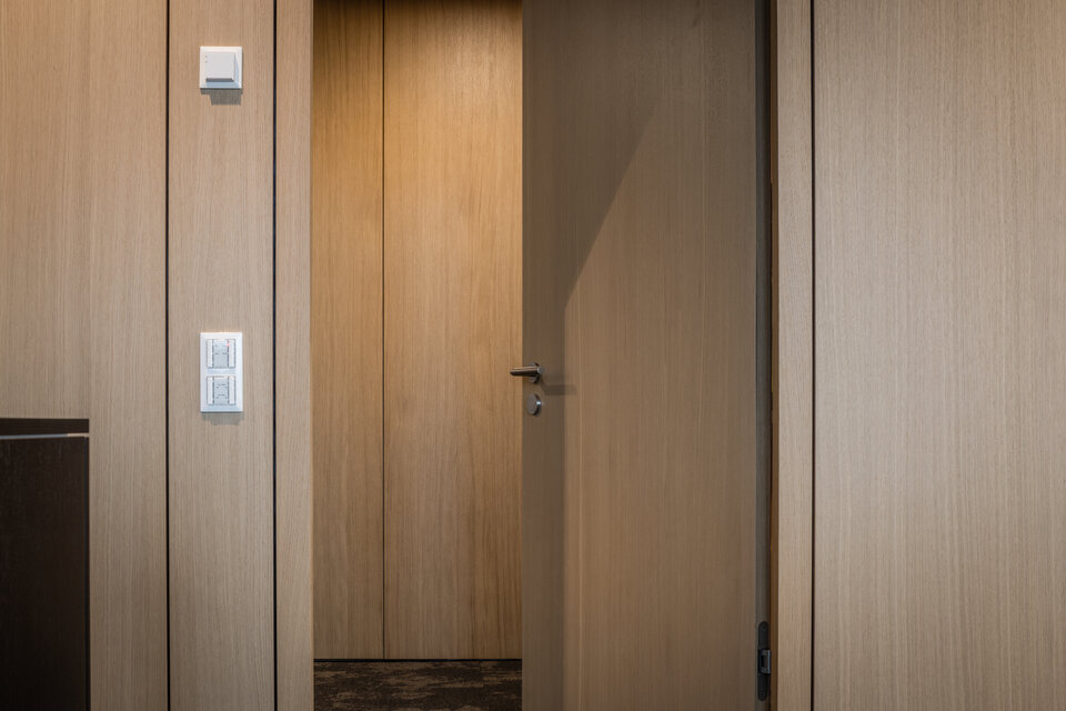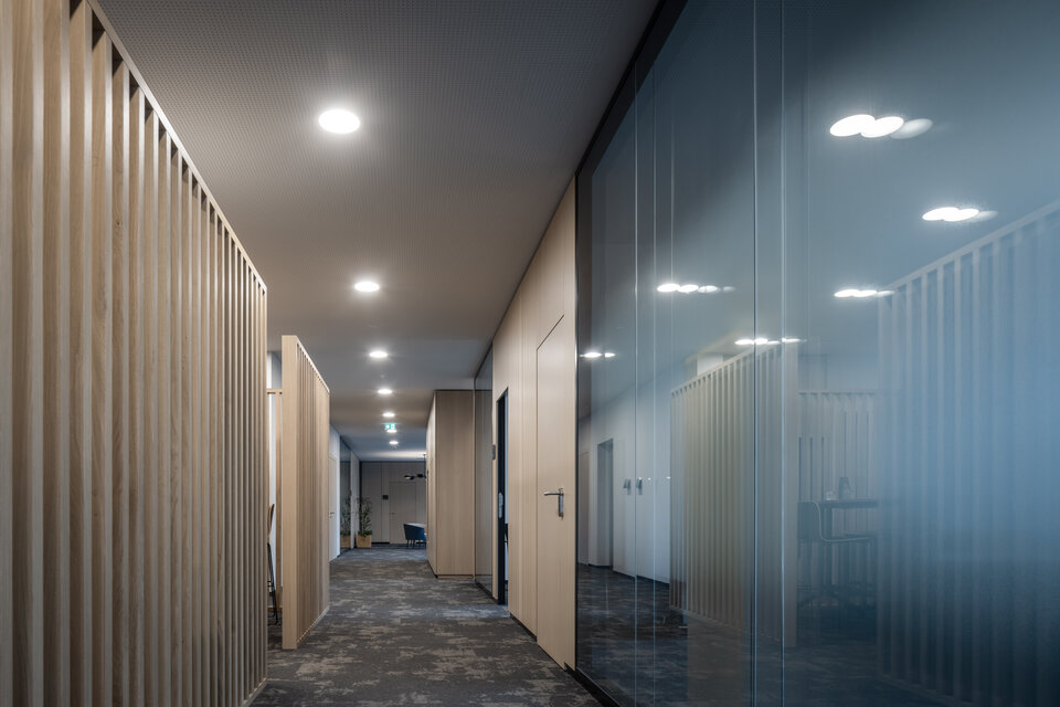Die Lindner Life Stereo 125 Glastrennwände sorgen für eine helle, transparente Atmosphäre – ohne dabei auf effektiven Schallschutz zu verzichten. Ergänzend bringen Lindner Logic 100 Timber Holztrennwände eine warme, natürliche Eleganz in die Räume und fügen sich harmonisch in das moderne Design ein. Die HTB 68 und HTB 41 Türen mit Schalterpaneelen integrierten sich optisch perfekt in das Gesamtkonzept und bieten darüber hinaus komfortable Steuerungsmöglichkeiten für Licht und Technik.
