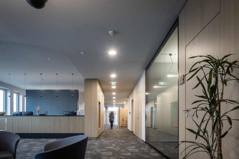 Die Hans Künz GmbH hat ihr Industrieareal in Hard um ein modernes Bürogebäude erweitert, das die traditionelle Maschinenbaukompetenz mit einer zukunftsweisenden Arbeitswelt verbindet. Statt fester Bürokonzepte setzt das Gebäude auf ein flexibles Layout und ein angenehmes Arbeitsklima mit kurzen Wegen, warmen Holzdecken und lichtdurchfluteten Räumen. Die offene, galerieartige Gestaltung schafft fließende Übergänge zwischen Arbeits- und Kommunikationsbereichen. Interner Austausch und das Miteinander werden in den Vordergrund gestellt; gleichzeitig sind aber auch Konzentration und ruhiges Arbeiten möglich.