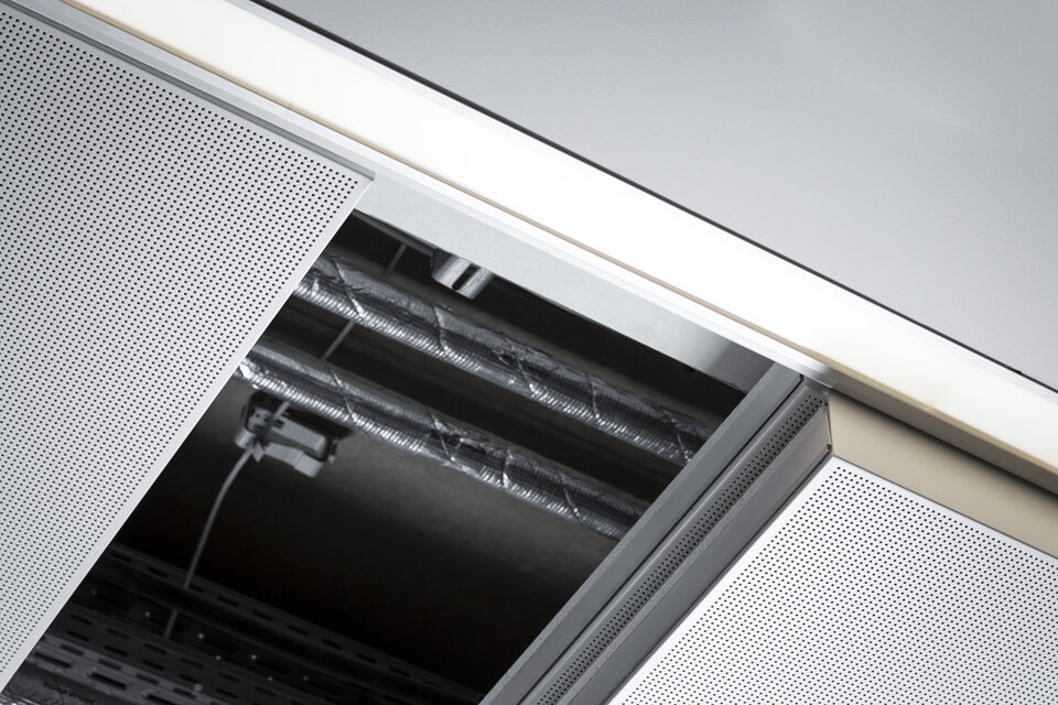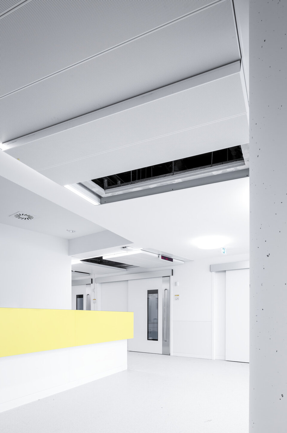 Die frei gespannte Metall-Brandschutzunterdecke bietet nicht nur die Feuerwiderstandsklasse F30, sondern überzeugt insbesondere durch ihre Revisionsmöglichkeit: Die einzelnen Deckenelemente lassen sich werkzeuglos absenken und horizontal verschieben. Dadurch entstehen großflächige Revisionsöffnungen von bis zu ca. 3.000 x 2.000 mm – ganz ohne zusätzlichen Deckenhohlraum. Dies gewährleistet eine schnelle und unkomplizierte Wartung der darüberliegenden technischen Installationen. Kombiniert wurden die Brandschutzdecken mit den Einbauleuchten T38 12.