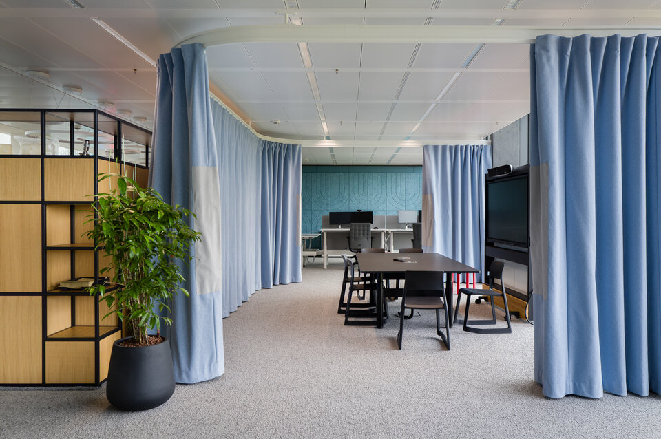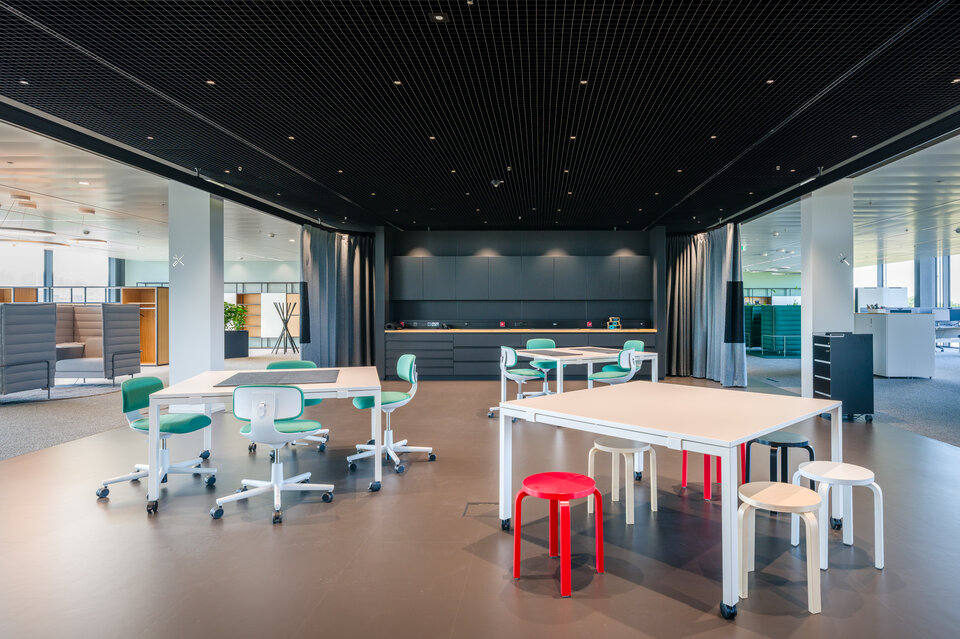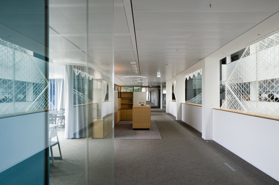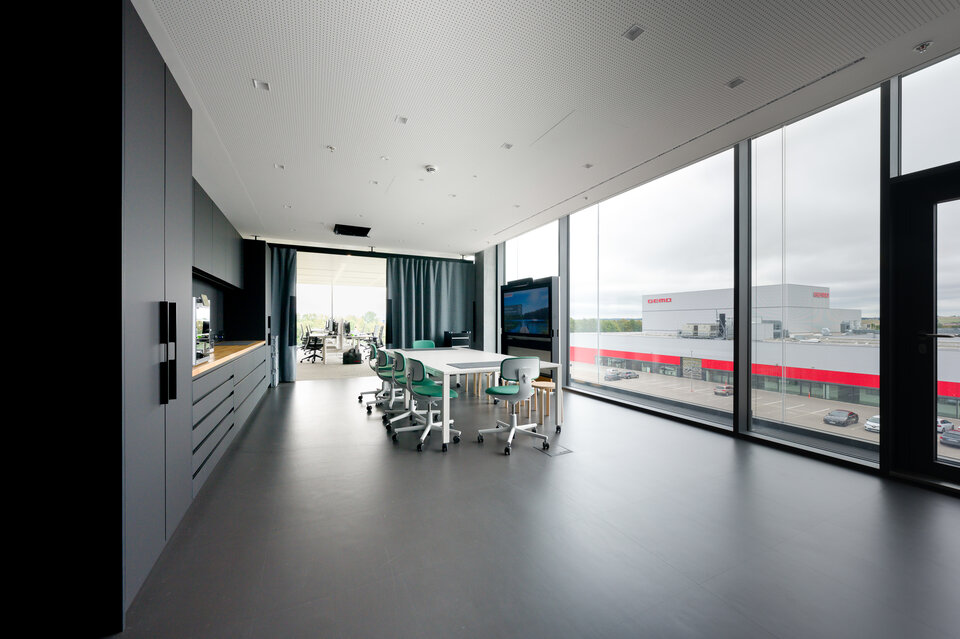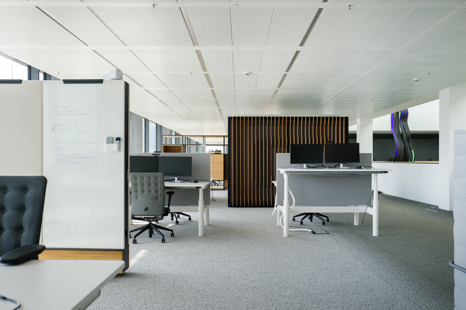 Das System wird durch die Plafotherm® B 100 Linearbandraster-Heiz-/Kühldecke ergänzt. Aktive und passive Klimazonen ermöglichen eine effiziente Regulierung des Raumklimas, während die sichtbaren Bandraster die Integration technischer Installationen erleichtern. Durch die Befestigung von Trennwänden am Linearbandraster ist eine flexible Raumaufteilung möglich.