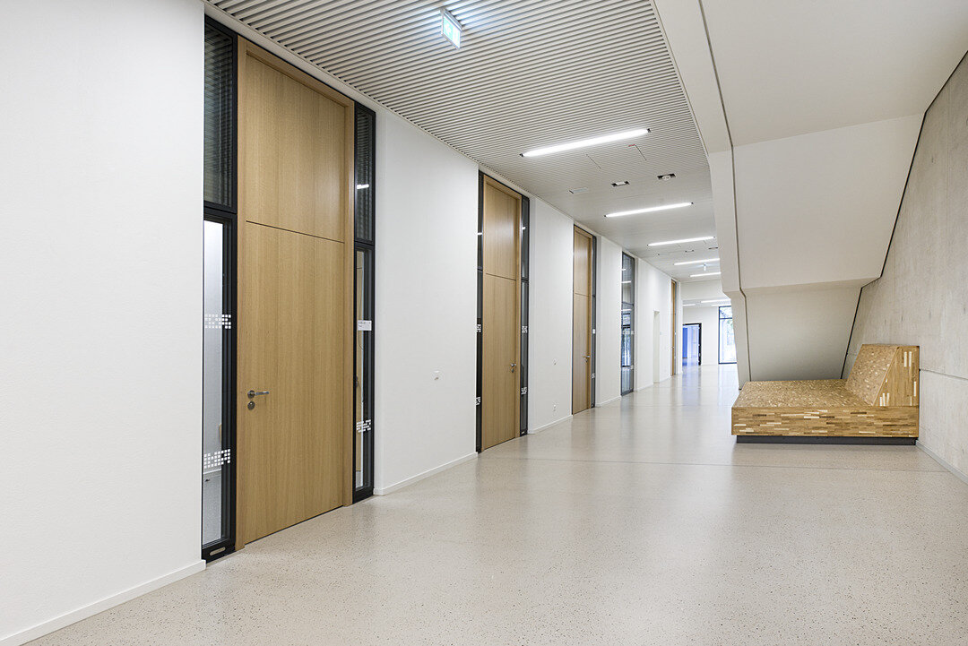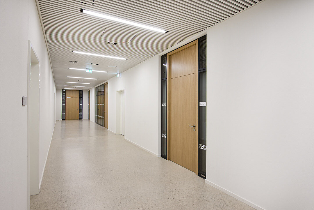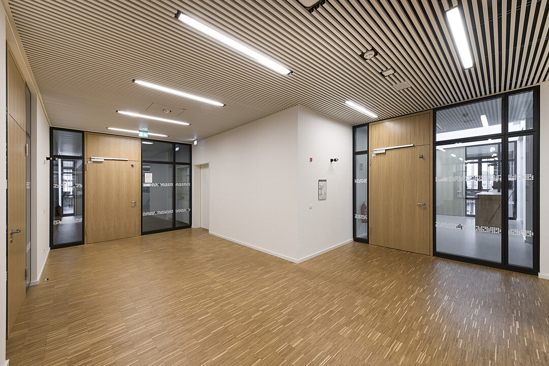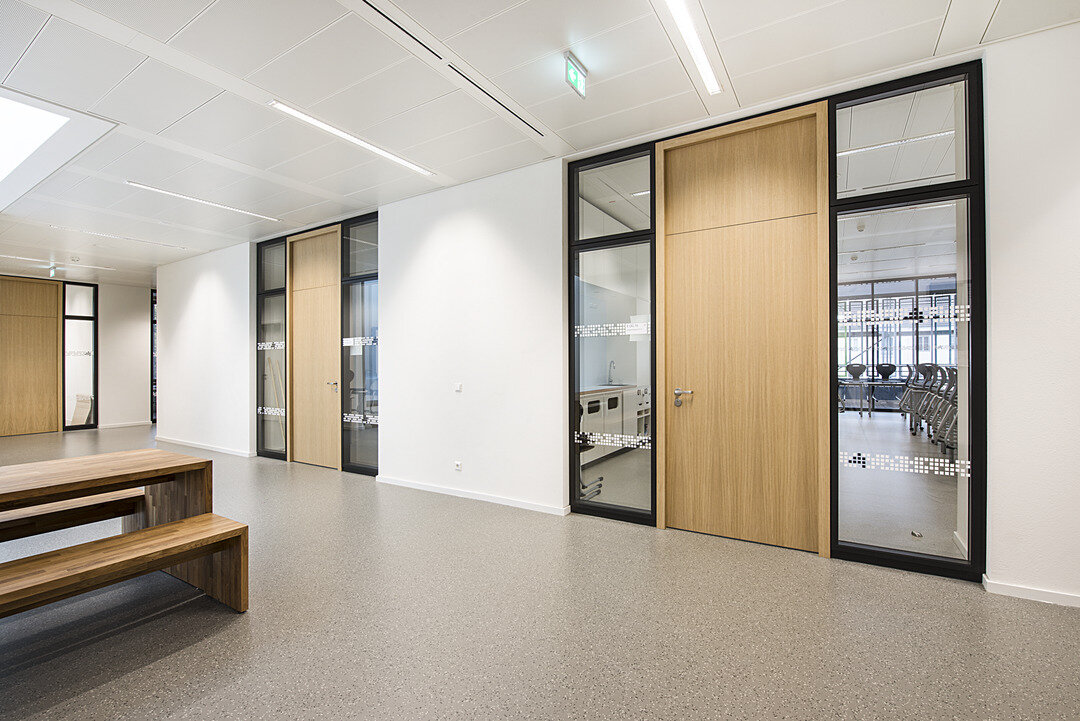 Die Türen und Trennwände weisen den Bestimmungen im Schulbau entsprechend Brand-, Rauch-, Schallschutz auf, ebenso wie die Brüstungsverglasung hin zum zentral gelegenen Atrium und die Sichtfenster als Verbindungselement zwischen den einzelnen Fachräumen und Fluren.