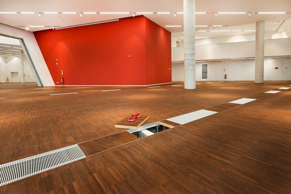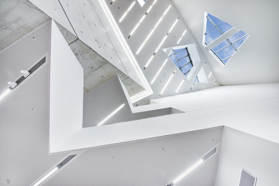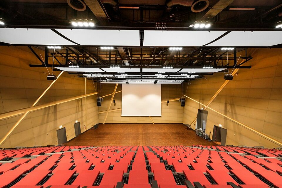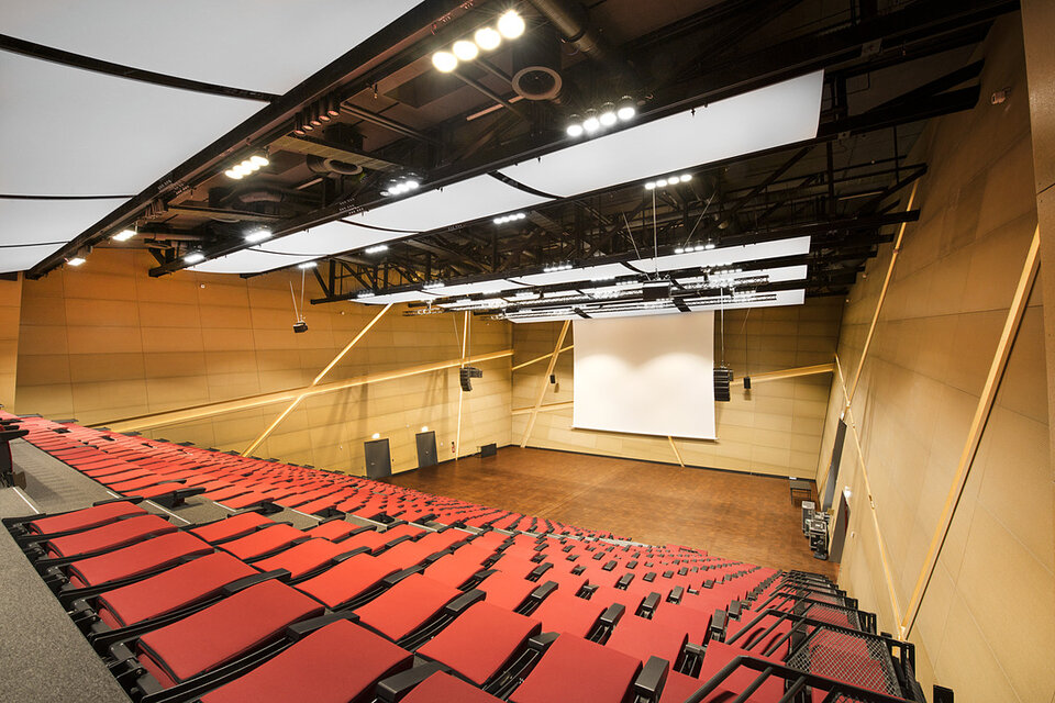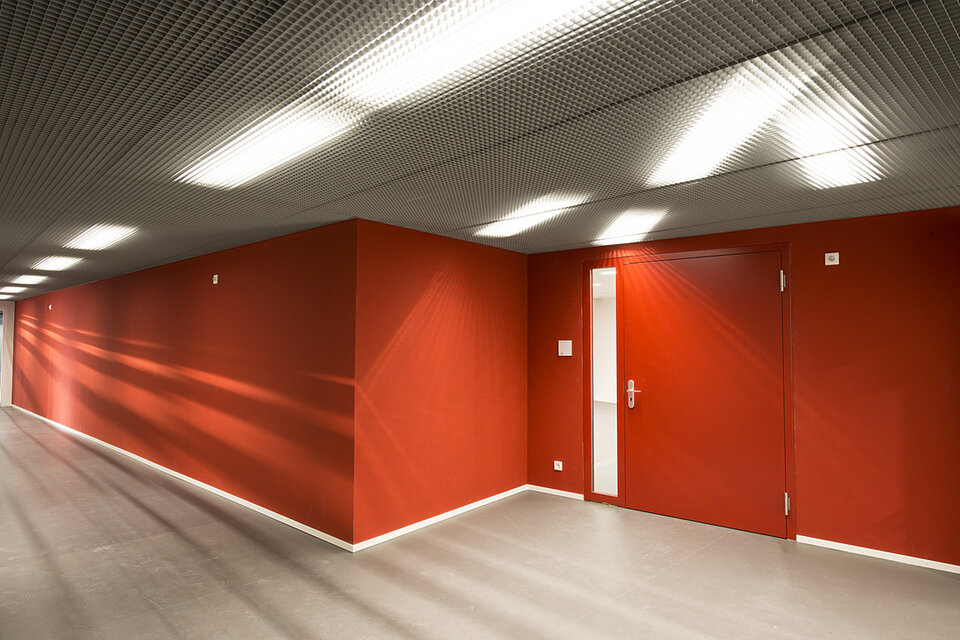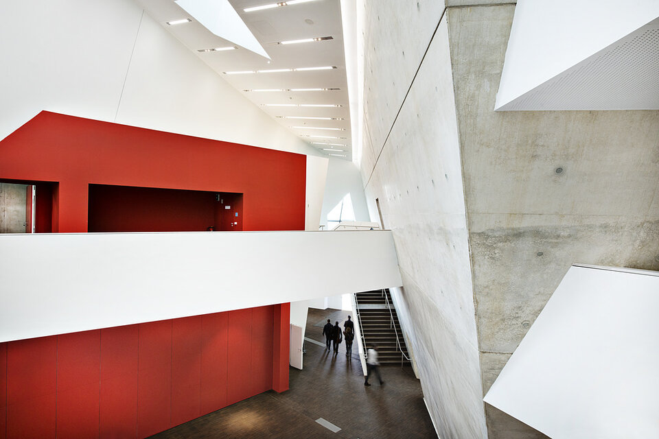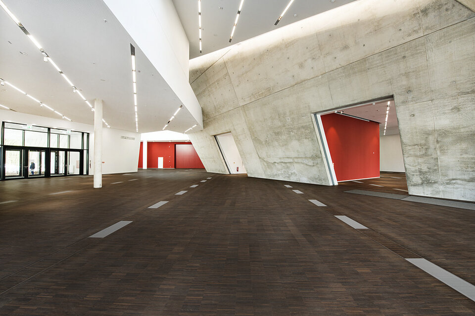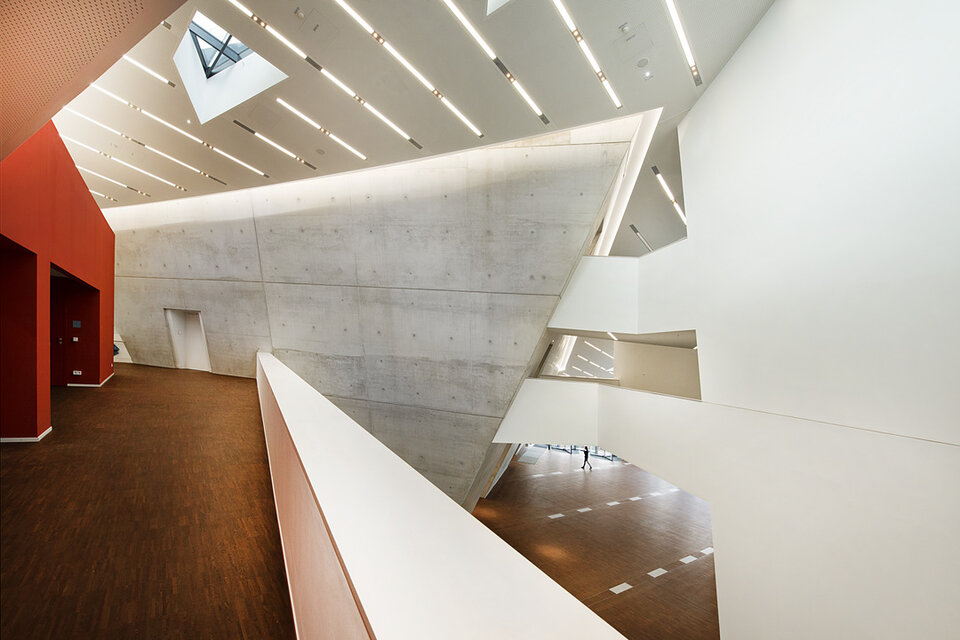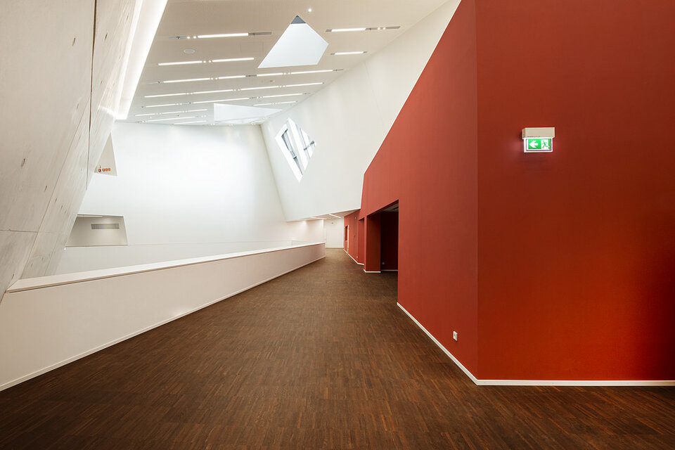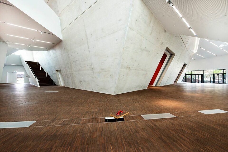 Die Lindner Group konnte mit mehreren Leistungsbereichen seine Kompetenz in den Innenausbau mit einbringen. So erhielt die Lindner AG den Auftrag für Trockenbauarbeiten an Decken und Wänden des Gebäudes, welche aufgrund der anspruchsvollen Raumgeometrien ein hohes Maß an Komplexität aufwiesen. Der Neubau wurde vollflächig mit Hohl- bzw. Doppelbodensystemen aus dem Hause Lindner ausgestattet, sodass alle technischen Installationen und Leitungswege dezent im Bodenhohlraum verborgen werden konnten. Als Belag wurde für einen Großteil der Bereiche Parkett aus Raucheiche gewählt. Lindner erbrachte darüber hinaus alle Objekttüren im Zentralgebäude. Die Lindner Objektdesign GmbH war verantwortlich für die Erstellung der Wandverkleidungen im Audimax, von denen im Rahmen der akustischen Optimierung ca. 1.000 m² schallreflektierend und ca. 800 m² schallabsorbierend ausgeführt wurden.