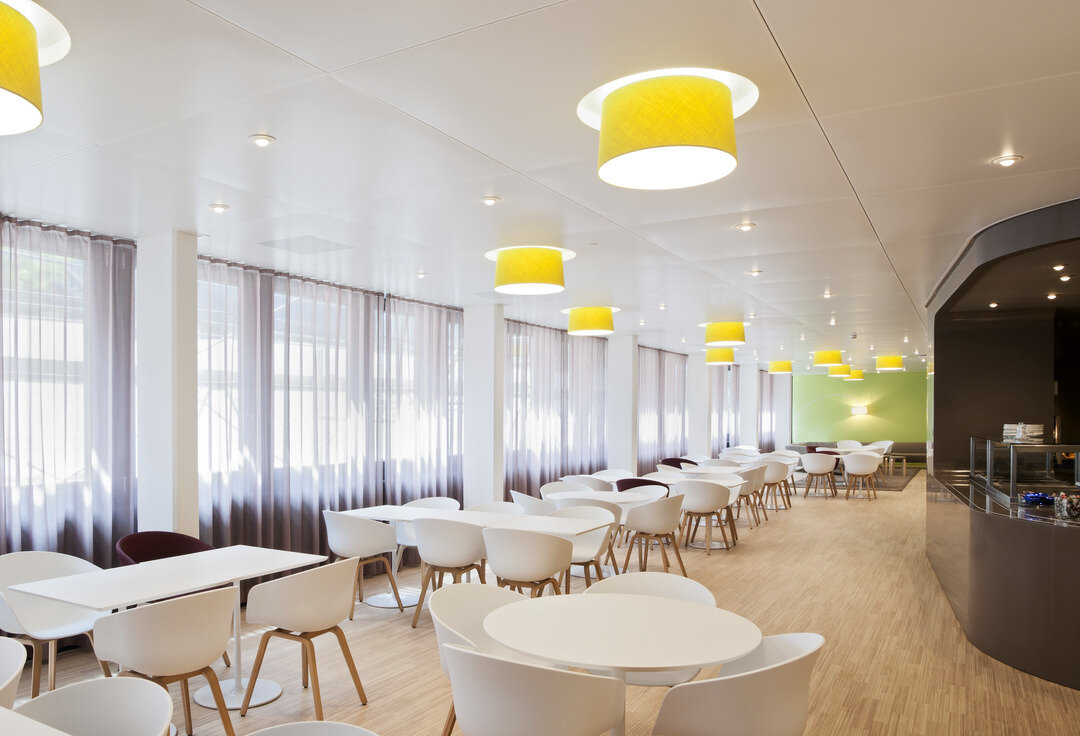 Auch die Niederlassung in der Berner Monbijoustraße dient als Anlaufstelle für die Anliegen und Bedürfnisse von Bestandskunden und neuen Interessenten. Neben den selbst genutzten Flächen offeriert die Mobiliar in dieser modern sanierten Liegenschaft auch Mietflächen. Dank eines ausgefeilten Energiekonzepts kann ein wesentlicher Teil des Energiebedarfs durch selbst produzierten Solarstrom gedeckt werden. Auch im Bezug auf die Klimatisierung legte man Wert auf Effizienz: Hybrid-Deckensegel aus dem Hause Lindner sorgen für eine behagliche Tempererierung aller Bürobereiche des Gebäudes. Für die Kantine hingegen wählte man ein Einhänge-Deckensystem mit Heiz- und Kühlfunktion.