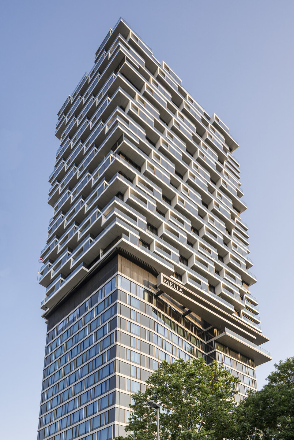 Genauso markant ist die Skybar im 15. Obergeschoss mit einer großzügigen Freiterrasse gestaltet. Der untere Gebäudeteil wurde mit einer eher dezenten, aber nicht weniger hochwertigen Stahl-Pfosten-Riegel-Fassade umhüllt. Für das Sockelgebäude wählte man eine hinterlüftete Glasfaserbetonbekleidung, kombiniert mit Blechbekleidungen und Lochfenster.