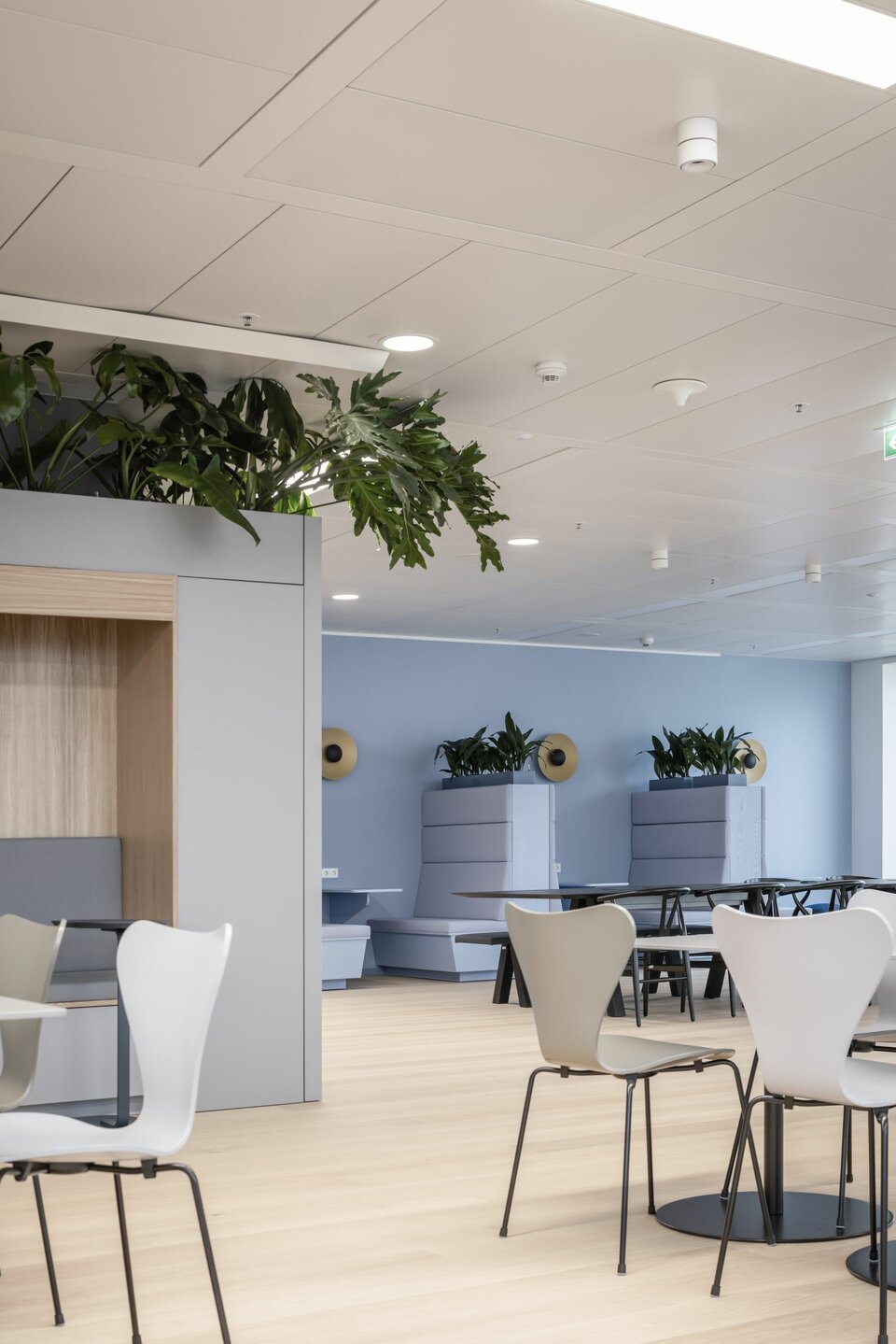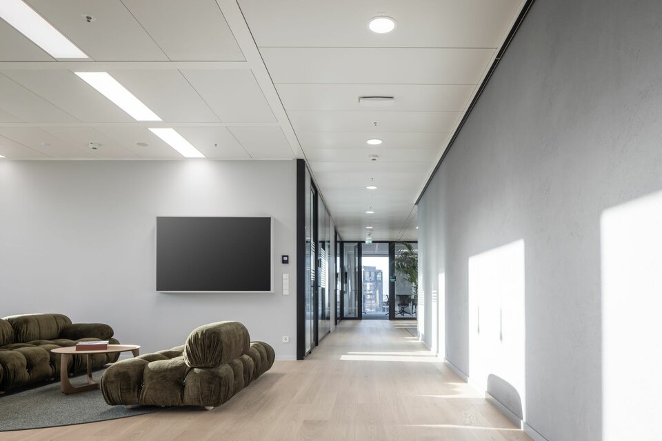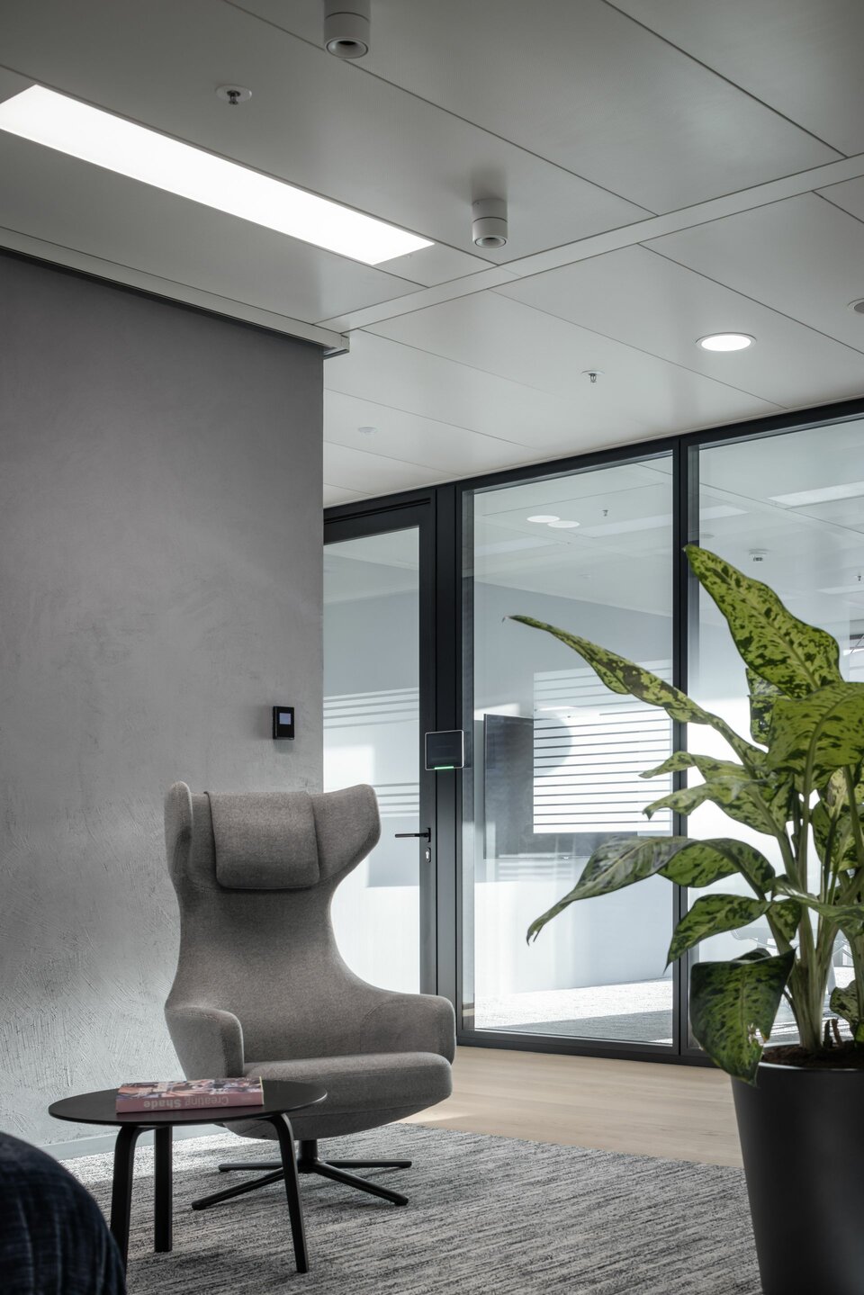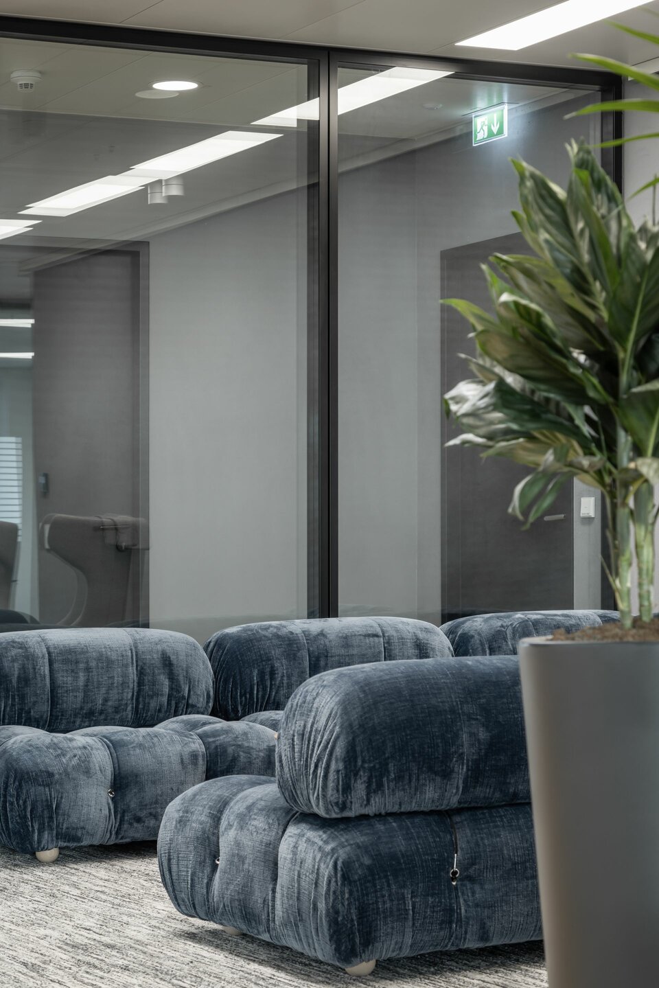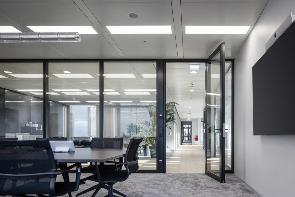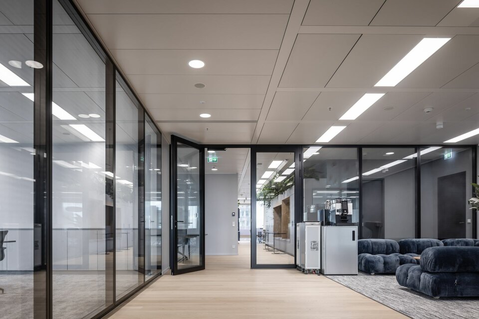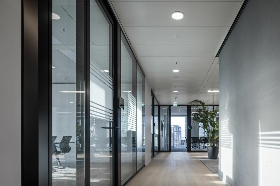 Auf den Stockwerken 10 bis 12 zeichnete sich Lindner maßgeblich durch die Gestaltung der Wandsysteme aus: Der Auftrag umfasste die Montage von Vollwandelementen aus Holz und Metall, die Integration von eleganten Glastrennwänden sowie die Installation von hochwertigen Türelementen aus Aluminium. Diese maßgeschneiderte Kombination aus Funktionalität und ästhetischem Design sorgt nicht nur für eine elegante Separation der Büroflächen, sondern unterstützt auch die akustischen Ansprüche an die Büroumgebung. Lindners Kompetenz im Innenausbau trug damit erheblich zur Schaffung einer effektiven und zugleich komfortablen Arbeitsatmosphäre auf den Etagen bei.