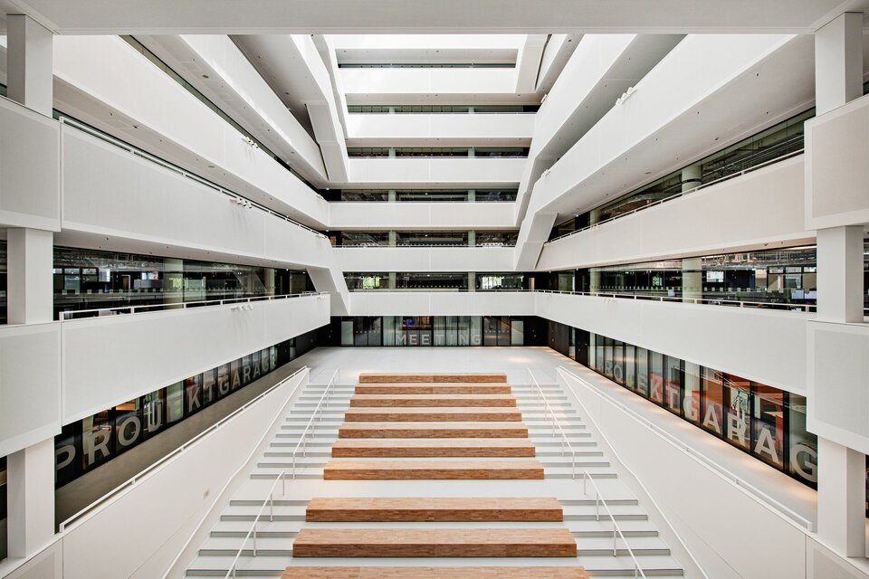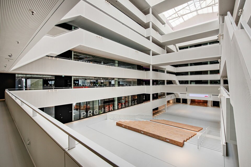 Im Zuge eines umfassenden Umbaus wurde ein bestehendes Logistikgebäude der Otto Group in Hamburg in ein modernes Bürogebäude verwandelt. Nach Fertigstellung umfasst das Gebäude neun oberirdische Geschosse sowie ein Untergeschoss und bietet eine Bruttogrundfläche von rund 47.900 m². Ein zentrales Element dieses Projekts ist das nachträglich integrierte Atrium, das in die bestehenden Decken eingeschnitten wurde und sich über alle acht Etagen erstreckt.