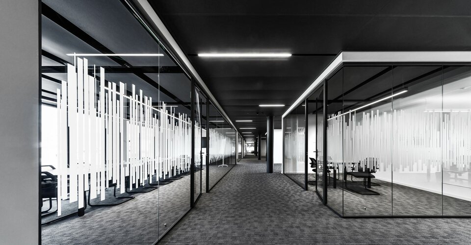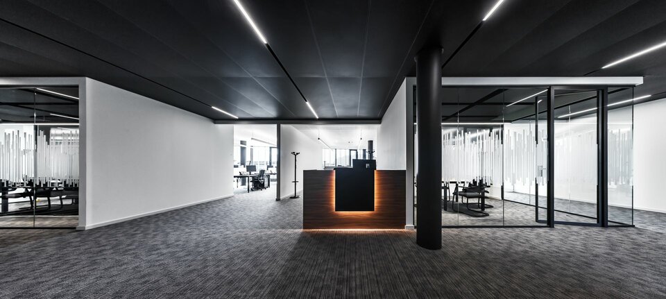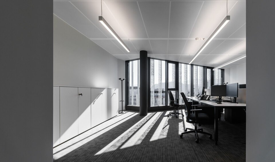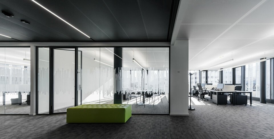 Beim Ausbau des Bürokomplexes wurde die Lindner Group mit der Fertigung hochwertiger Deckensysteme beauftragt. In Zusammenarbeit mit Fkontract wurden 6.000 m² der innovativen Lindner Plafotherm® Heiz- und Kühldecken verbaut. Dank ihrer intelligenten Heiz- und Kühltechnologie tragen die Deckensysteme maßgeblich zu einem angenehmen Raumklima bei. Die Behaglichkeit wird zudem durch AirBox Zu- und Abluftelemente verstärkt, welche für eine optimale Belüftung des Raumes sorgen. Um insbesondere in den Büro- und Besprechungsräumen ein akustisch optimiertes Umfeld zu schaffen, wurden die Deckenplatten zusätzlich mit Akustikeinlagen ausgestattet. Ausgeführt mit tiefmatter MOODline Pulverbeschichtung in Grau und Weiß schaffen die Deckensysteme in den Büroräume auch ein visuelles Highlight.