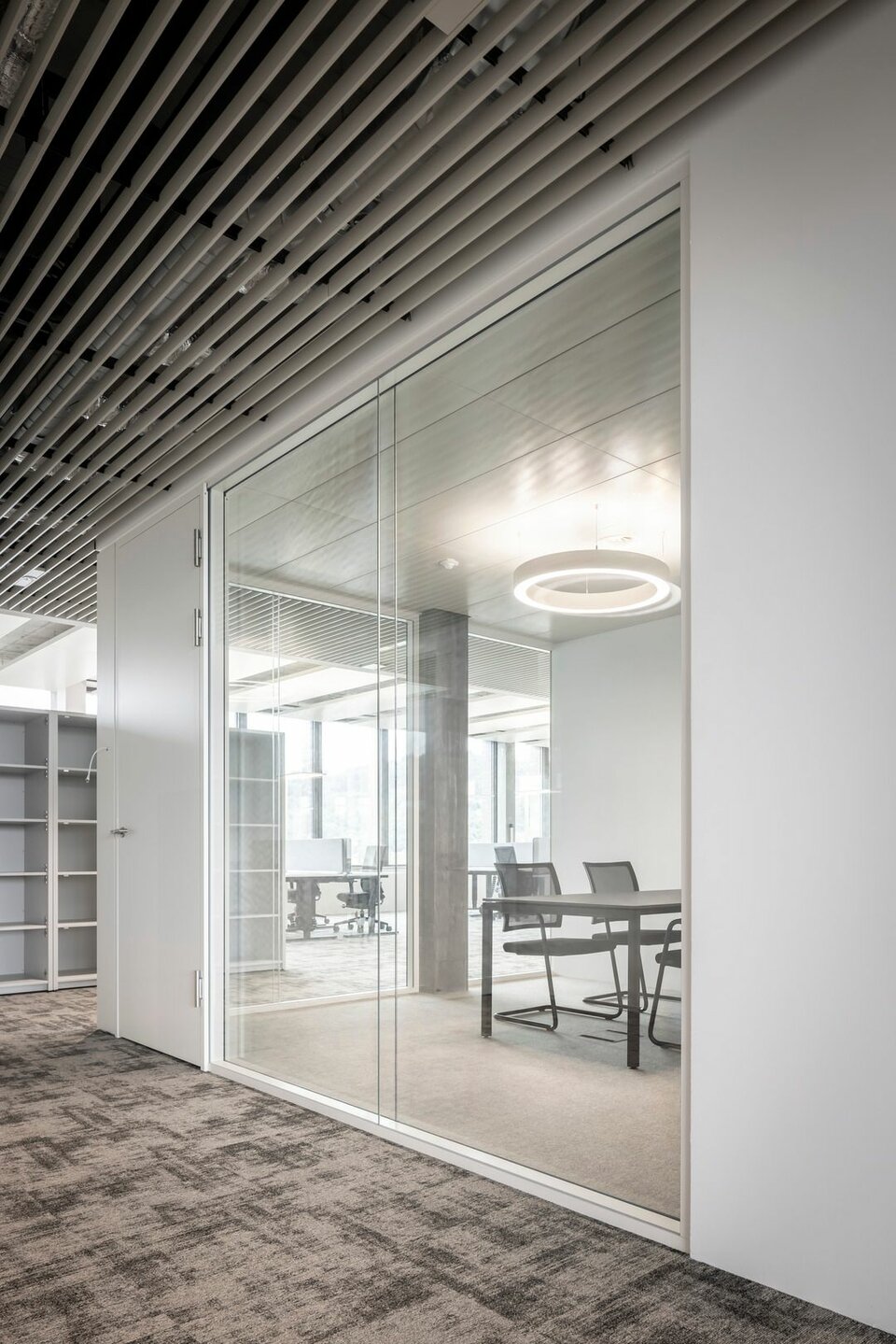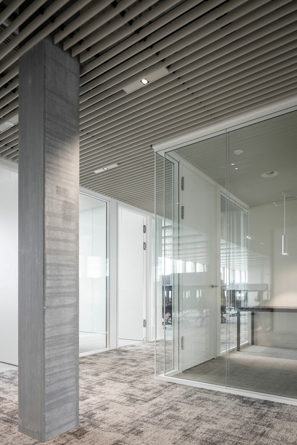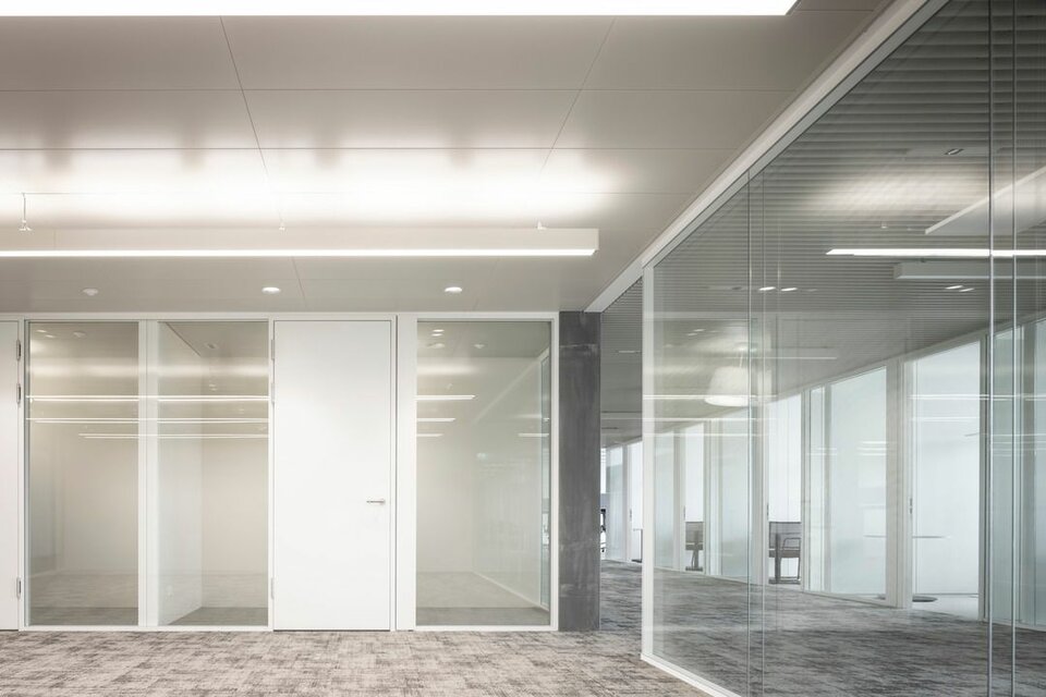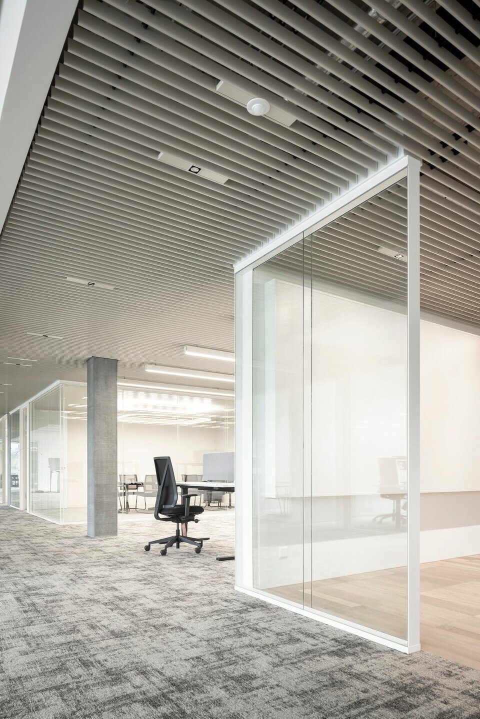 Für die räumliche Abtrennung einzelner Büros und Besprechungsräumen wählte man die Lindner Life Clear. Die ständerlose Ganzglaskonstruktion mit schmalen Aluminiumprofilen entwickelte Lindner eigentlich für das Polizei- und Justizzentrum Zürich. Da es sich hier ebenfalls um ein Projekt in der Schweiz handelte, entsprach die Life Clear bereits den strengen lokalen Anforderungen in Bezug auf Brandschutz, Erdbebensicherheit aber auch Akustik. Passend zu dem vollflächigen Glastrennwandsystem fertigte das Lindner Türenwerk in Ostrov raumhohe Holztüren in weißem HPL-Dekor. Ergänzend wurden revisionierbare Schalterpaneele eingebaut. Zwischen den einzelnen Räumen kamen zum Teil auch Holztrennwände bzw. klassischer Trockenbau zum Einsatz, ergänzt durch etliche Sonderwandabschlüsse, die im Wandsystem verdeckt integriert wurden. In den Eingangsbereichen mit erhöhten Brandschutzanforderungen verbaute Lindner Glastrennwandelemente vom Typ Lindner Life Stereo 125 und Holztüren mit einer Stärke von 49 mm und EI30 Prüfung. Zusätzlich setzte man Lindner Bodenschotts ein, was sowohl den erhöhten Brandschutz sicherstellte als auch den Rw-Wert auf 44 dB verbesserte.