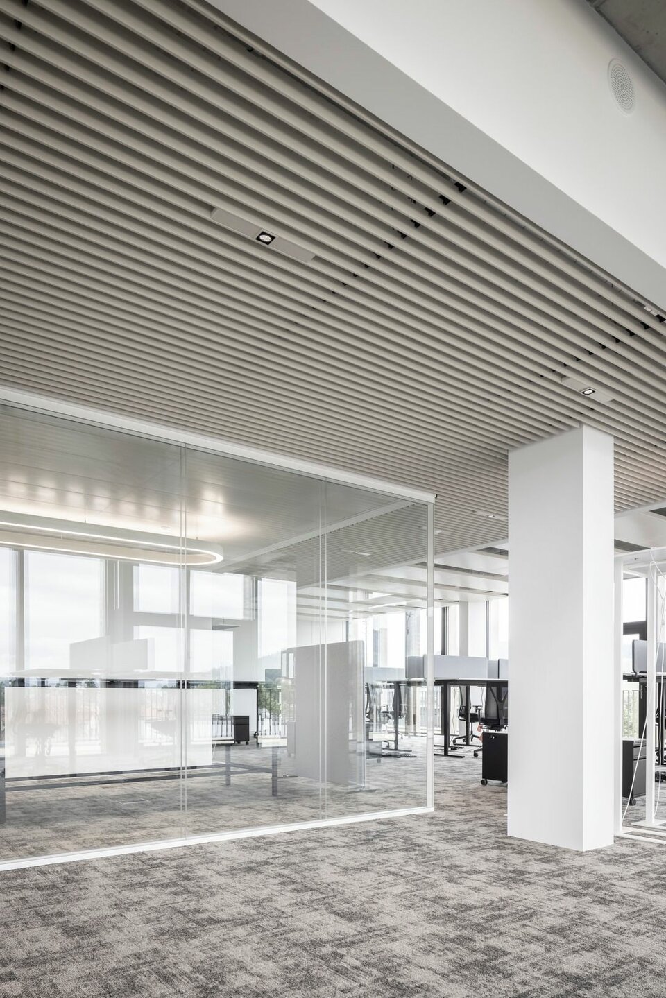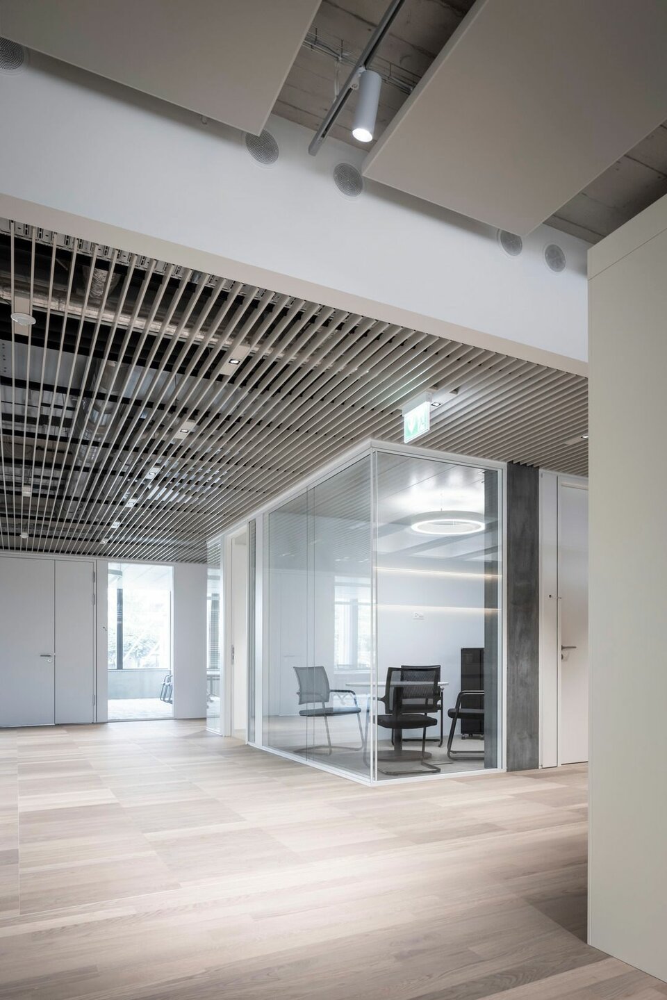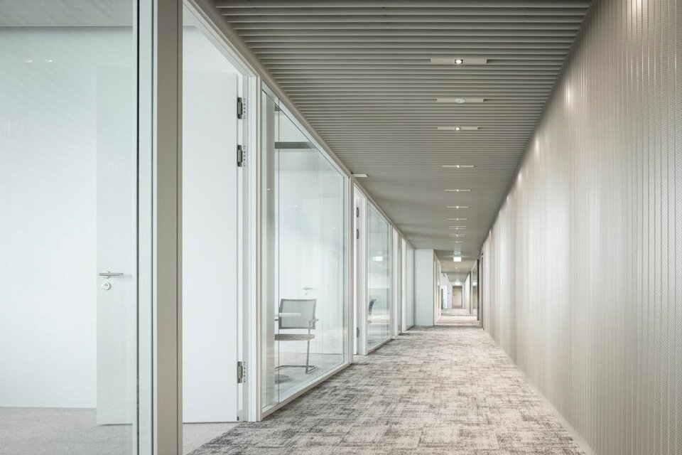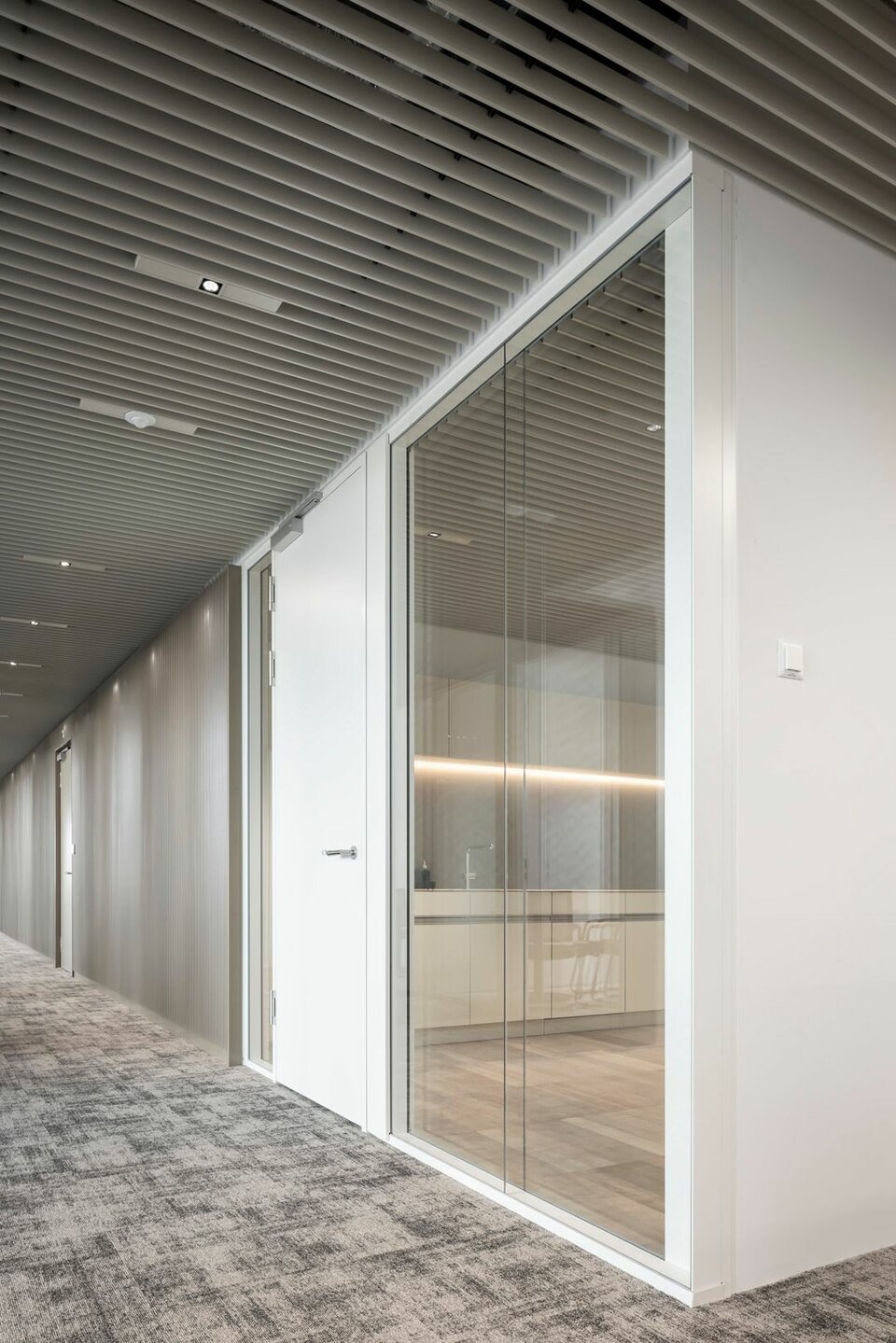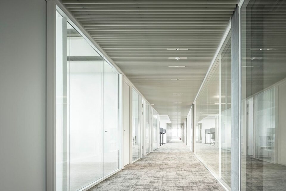 Für die räumliche Abtrennung einzelner Büros und Besprechungsräumen wählte man die Lindner Life Clear. Die ständerlose Ganzglaskonstruktion mit schmalen Aluminiumprofilen entwickelte Lindner eigentlich für das Polizei- und Justizzentrum Zürich. Da es sich hier ebenfalls um ein Projekt in der Schweiz handelte, entsprach die Life Clear bereits den strengen lokalen Anforderungen in Bezug auf Brandschutz, Erdbebensicherheit aber auch Akustik. Passend zu dem vollflächigen Glastrennwandsystem fertigte das Lindner Türenwerk in Ostrov raumhohe Holztüren in weißem HPL-Dekor. Ergänzend wurden revisionierbare Schalterpaneele eingebaut. Zwischen den einzelnen Räumen kamen zum Teil auch Holztrennwände bzw. klassischer Trockenbau zum Einsatz, ergänzt durch etliche Sonderwandabschlüsse, die im Wandsystem verdeckt integriert wurden. In den Eingangsbereichen mit erhöhten Brandschutzanforderungen verbaute Lindner Glastrennwandelemente vom Typ Lindner Life Stereo 125 und Holztüren mit einer Stärke von 49 mm und EI30 Prüfung. Zusätzlich setzte man Lindner Bodenschotts ein, was sowohl den erhöhten Brandschutz sicherstellte als auch den Rw-Wert auf 44 dB verbesserte.