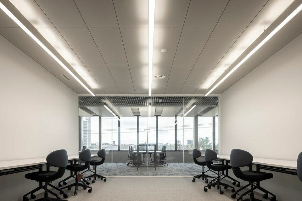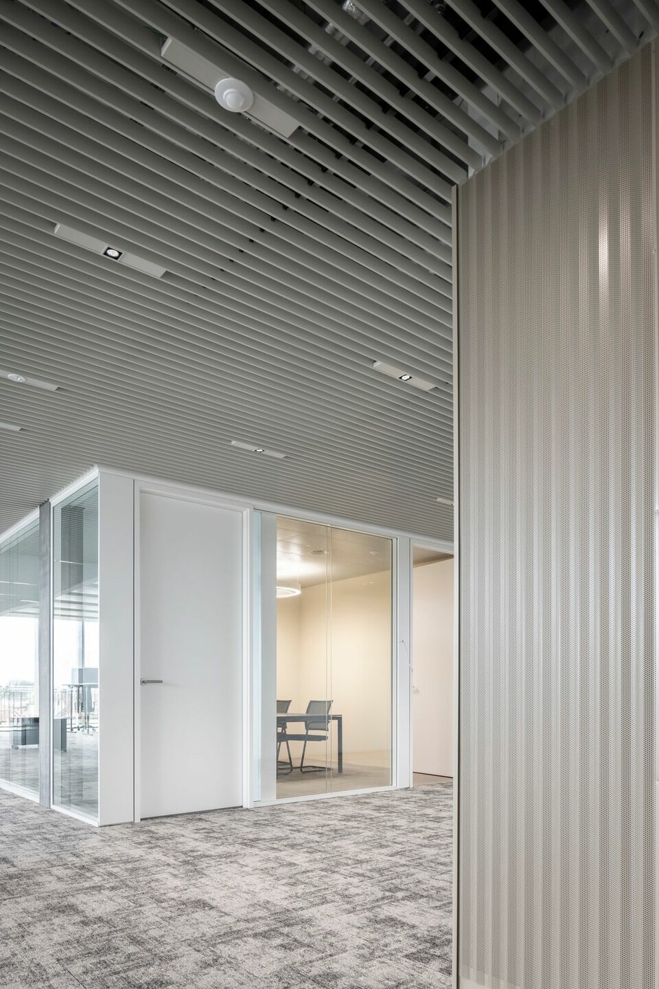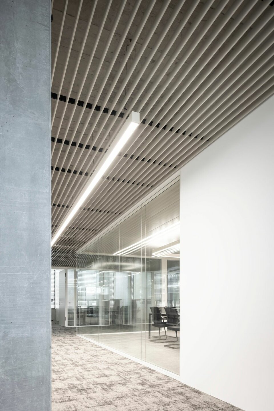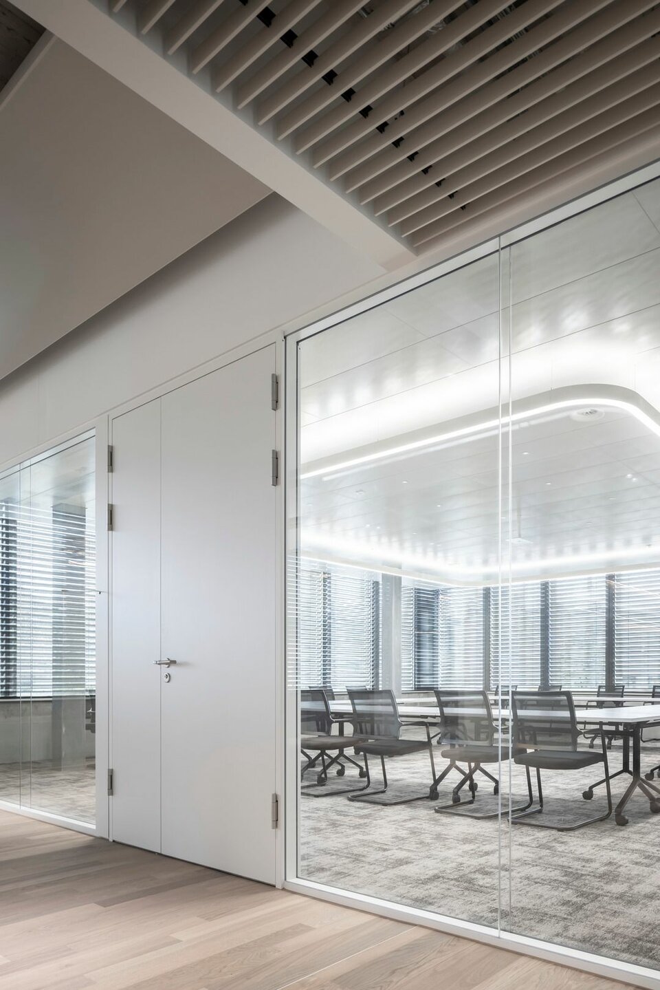 Für die räumliche Abtrennung einzelner Büros und Besprechungsräumen wählte man die Lindner Life Clear. Die ständerlose Ganzglaskonstruktion mit schmalen Aluminiumprofilen entwickelte Lindner eigentlich für das Polizei- und Justizzentrum Zürich. Da es sich hier ebenfalls um ein Projekt in der Schweiz handelte, entsprach die Life Clear bereits den strengen lokalen Anforderungen in Bezug auf Brandschutz, Erdbebensicherheit aber auch Akustik. Passend zu dem vollflächigen Glastrennwandsystem fertigte das Lindner Türenwerk in Ostrov raumhohe Holztüren in weißem HPL-Dekor. Ergänzend wurden revisionierbare Schalterpaneele eingebaut. Zwischen den einzelnen Räumen kamen zum Teil auch Holztrennwände bzw. klassischer Trockenbau zum Einsatz, ergänzt durch etliche Sonderwandabschlüsse, die im Wandsystem verdeckt integriert wurden. In den Eingangsbereichen mit erhöhten Brandschutzanforderungen verbaute Lindner Glastrennwandelemente vom Typ Lindner Life Stereo 125 und Holztüren mit einer Stärke von 49 mm und EI30 Prüfung. Zusätzlich setzte man Lindner Bodenschotts ein, was sowohl den erhöhten Brandschutz sicherstellte als auch den Rw-Wert auf 44 dB verbesserte.