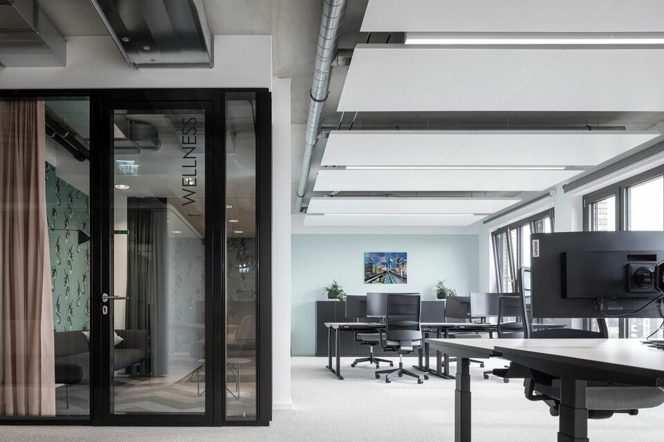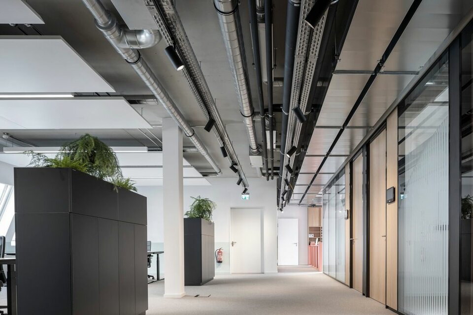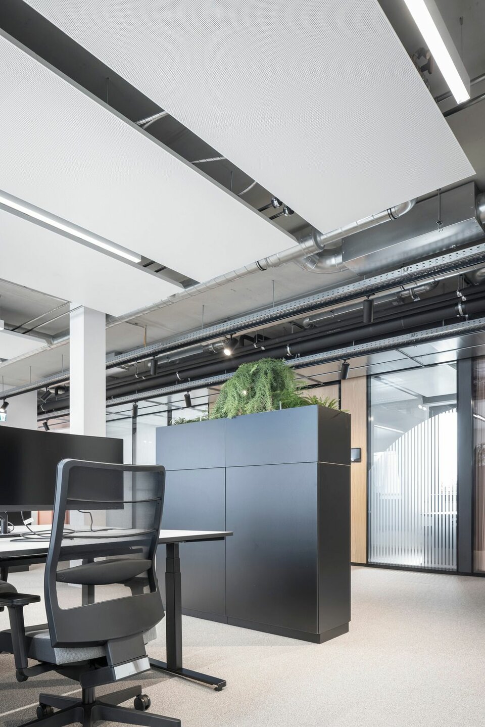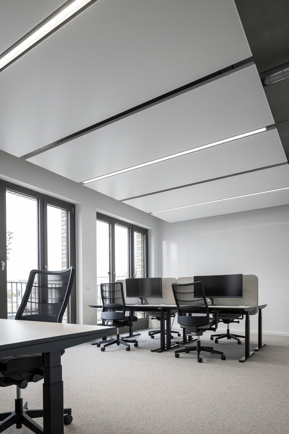 Für optimales Raumklima sorgen zum Beispiel die Heiz-/Kühldeckensegel von Lindner, die in 4 Büroetagen zum Einsatz kamen. Die Deckenplatten wurden dabei in verschiedenen Varianten mit einer 65° Kantung bzw. Maße bis zu 3000 mm eingebaut und zum Teil mit integrierten Leuchten installiert. Dabei sorgen sie dank Strahlung und Konvektion nicht nur für ein angenehmes und schnell anpassbares Raumklima, sondern auch für bessere Akustik in den meist offen gestalteten Arbeitswelten. Dabei ist das Plafotherm® System nicht nur eine effiziente, sondern auch eine wirtschaftliche, energiesparende Lösung.