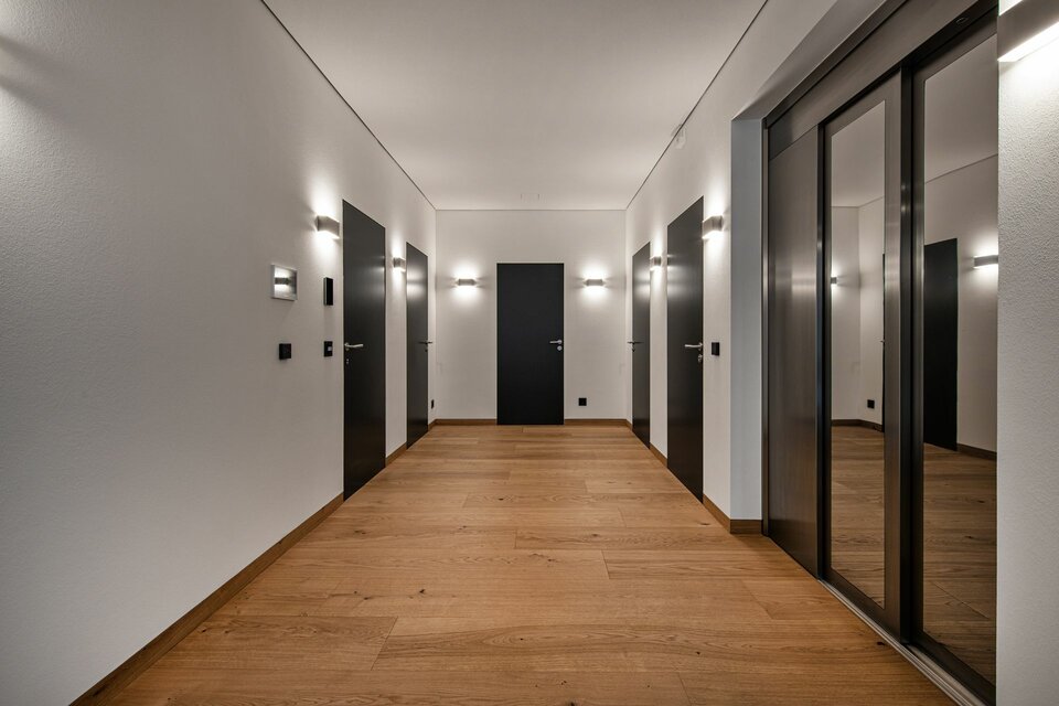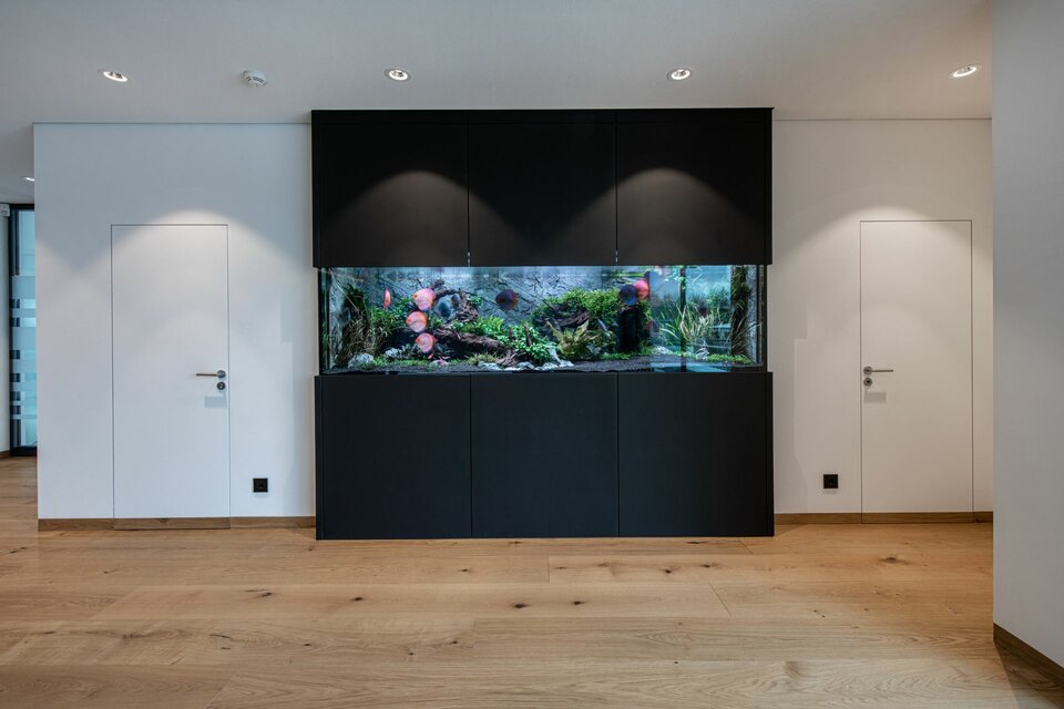 Der Geschäftsbereich Decke stellte eine glatte Gipskartondecke mit Heiz- und Kühltechnik bereit, die auch akustisch wirksam ist und somit für maximale Sprachverständlichkeit sorgt. Weiterhin fand der Hohlboden vom Typ FLOOR and more® comfort in sämtlichen Büroräumen Anwendung und bietet dabei höchsten Begehkomfort und praktischen Platz für Installationen und Leitungen. Für eine warme, gemütliche Optik wurde das Bodensystem um ein Lindner Parkett in der Variante Eiche mit langen Meterdielen ergänzt. Feuerschutztüren in F30 komplettieren den Innenausbau und verbinden dabei Sicherheit mit Ästhetik. Ein weiteres Highlight: die Ummantelung des Aquariums aus Lindner Bodenleder.