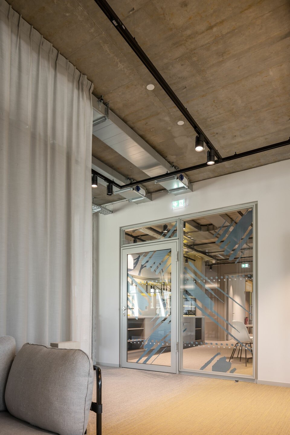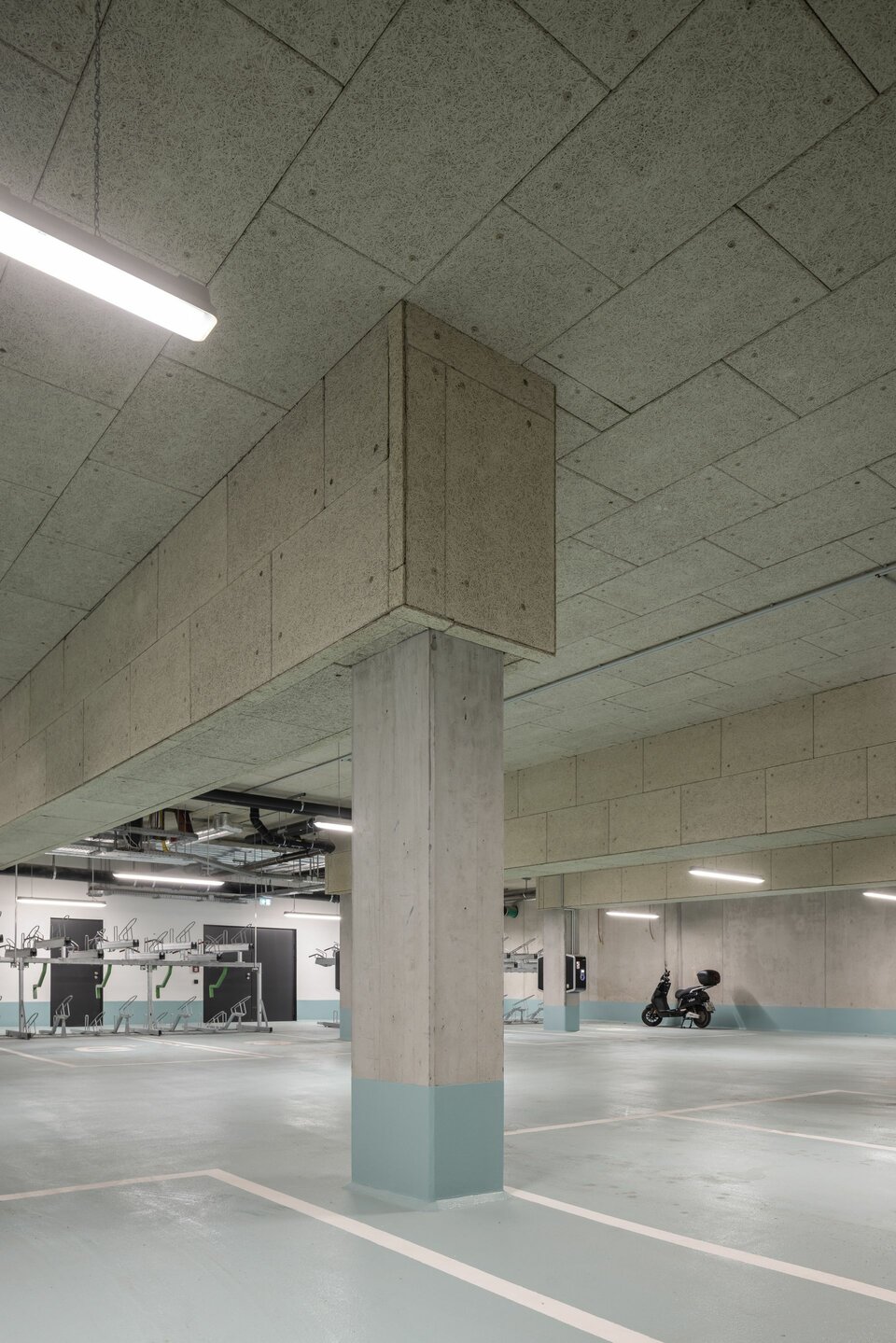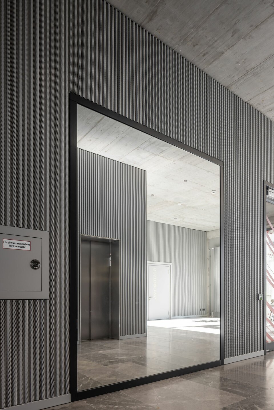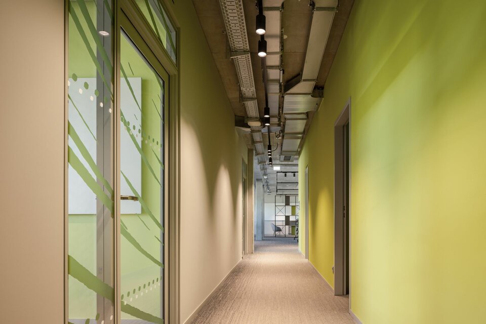 Lindner war in allen sieben Stockwerken des Gebäudes tätig. Zu den Aufgabengebieten zählten vielfältige Gewerke, von der Beschichtung der Tiefgarage über Estrich-, Dämm- und Malerarbeiten bis hin zu Beschilderungen und vielem mehr. Dabei zogen auch einige Lindner Produkte in die Innenräume ein: Der Hohlraumboden CAVOPEX und der Doppelboden NORTEC wurden mit hochwertigen Bodenbelägen ausgestattet und in nahezu allen Bereichen verlegt. Für die Trennung der einzelnen Büroräume setzte man auf die Glastrennwand Lindner Life Contour 126 in Kombination mit hochwertigen Innentüren, teilweise mit Brandschutz ausgeführt. Wände und Decken aus Trockenbau ergänzen das Leistungspaket. Das Highlight des Innenausbaus sind die Metallwandbekleidungen in Lamellenbauweise, welche die Aufzugsvorräume zum aufregenden Eye-Catcher machen.