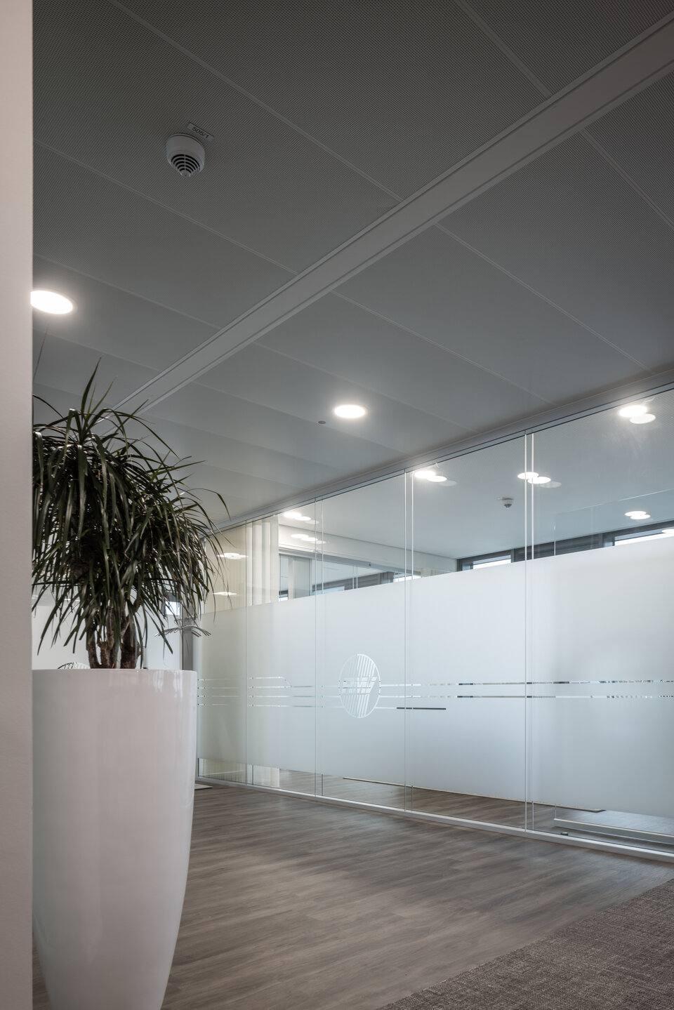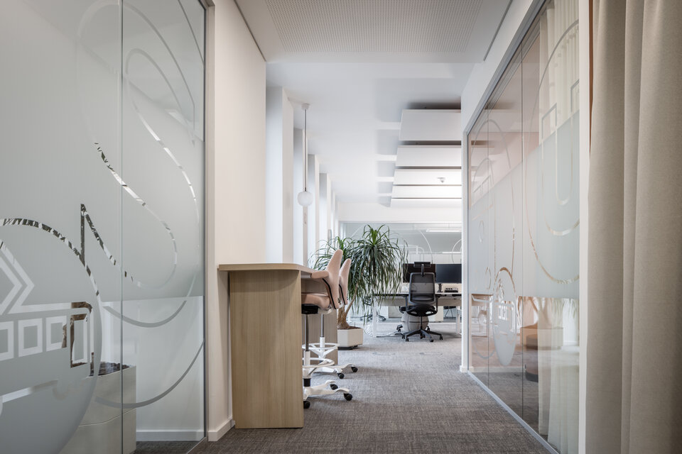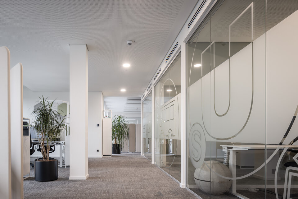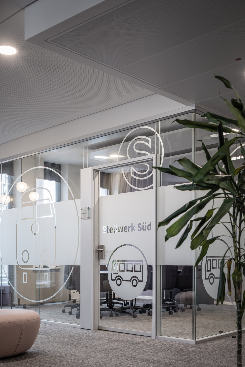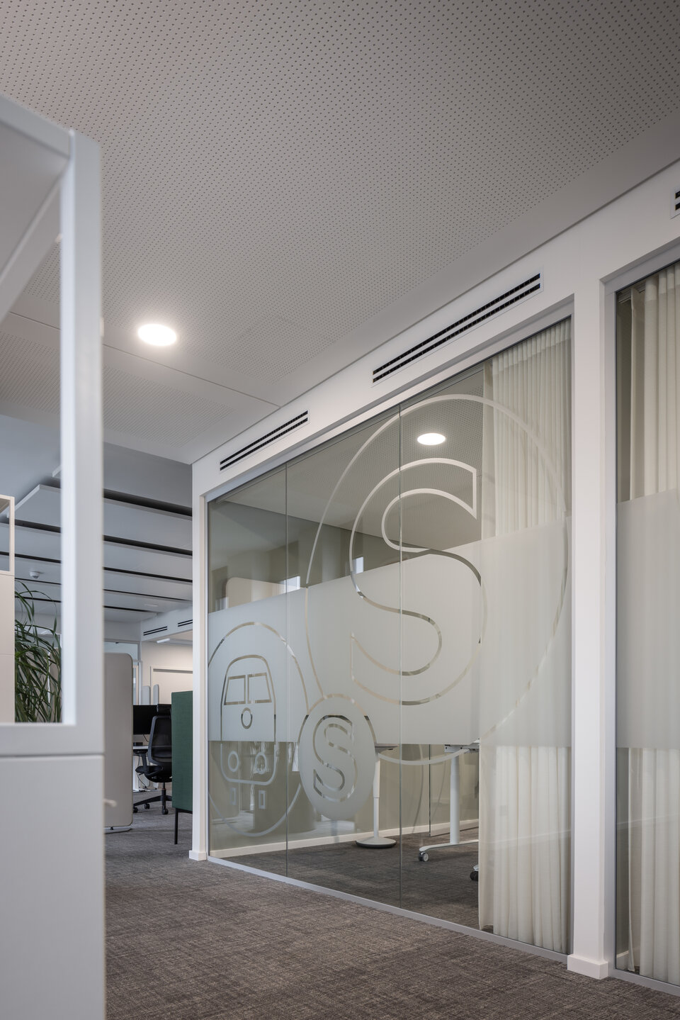 Die Lindner Group war am Ausbau der Büroflächen vom Erdgeschoss bis zum fünften Obergeschoss beteiligt und lieferte passgenaue Produkte, die Funktionalität und Ästhetik vereinen. Die zu den Fluren hin eingesetzten Lindner Life Pure 620 und Life Clear Glastrennwände zeichnen sich durch ihre pfostenfreie Verglasung aus, die lichtdurchflutete Räume schaffen. Ergänzt werden die Trennwände durch filigrane GTB 10 Ganzglastüren oder Schallschutztüren ATB 42 mit umlaufenden Aluminium-Rohrahmen. Um in den maximal transparenten Büroflächen auch ein gewisses Maß an Sichtschutz und Separation zu gewähren, wurden die Glasflächen mit opaken Mustern gestaltet, die unter anderem öffentliche Verkehrsmittel darstellen und somit die Themen des Mieters RMV auch optisch aufnehmen.