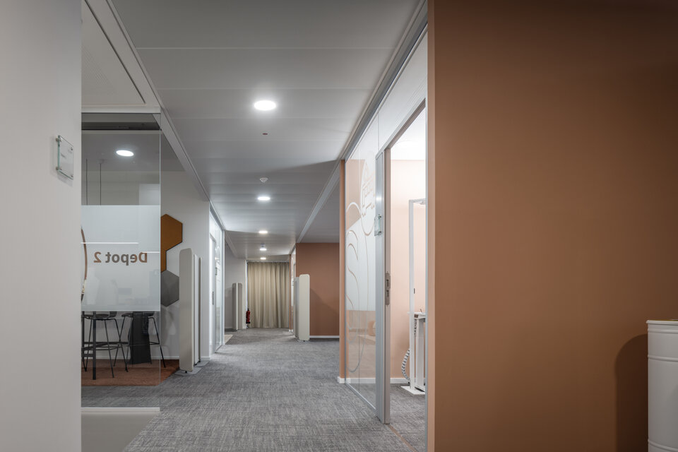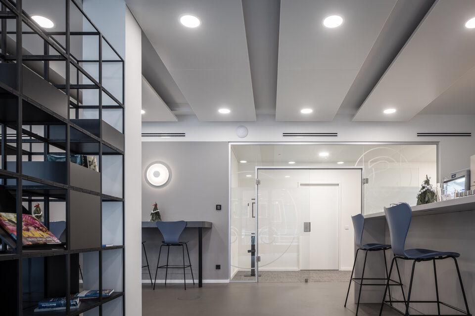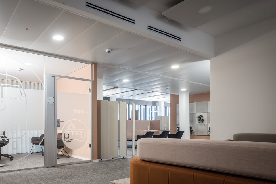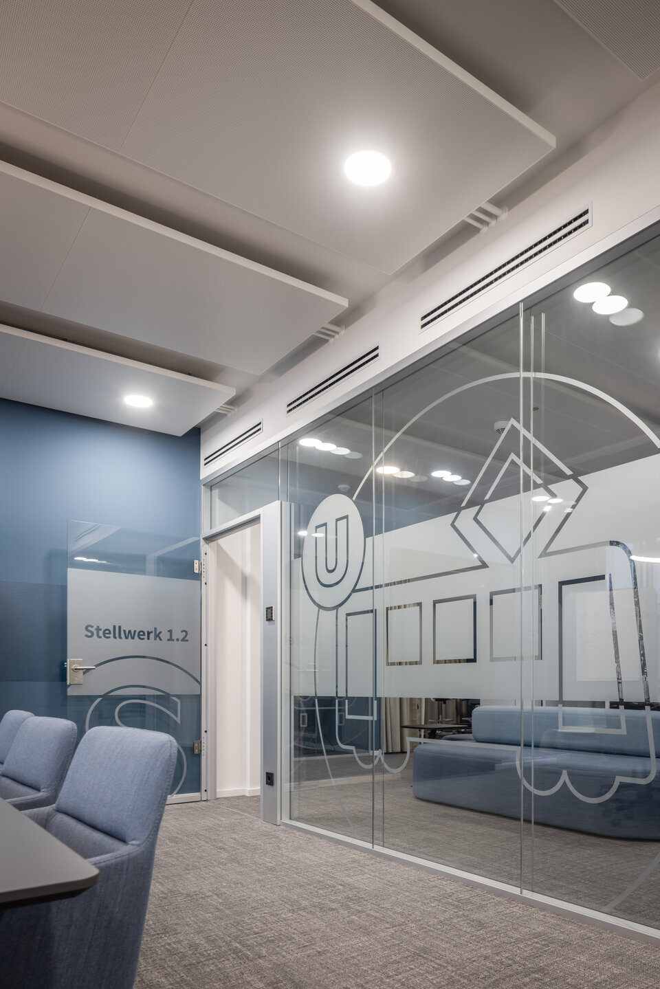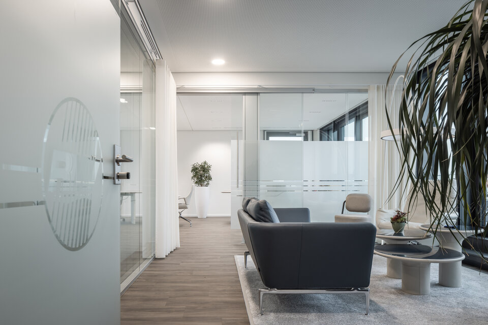Die Lindner Group war am Ausbau der Büroflächen vom Erdgeschoss bis zum fünften Obergeschoss beteiligt und lieferte passgenaue Produkte, die Funktionalität und Ästhetik vereinen. Die zu den Fluren hin eingesetzten Lindner Life Pure 620 und Life Clear Glastrennwände zeichnen sich durch ihre pfostenfreie Verglasung aus, die lichtdurchflutete Räume schaffen. Ergänzt werden die Trennwände durch filigrane GTB 10 Ganzglastüren oder Schallschutztüren ATB 42 mit umlaufenden Aluminium-Rohrahmen. Um in den maximal transparenten Büroflächen auch ein gewisses Maß an Sichtschutz und Separation zu gewähren, wurden die Glasflächen mit opaken Mustern gestaltet, die unter anderem öffentliche Verkehrsmittel darstellen und somit die Themen des Mieters RMV auch optisch aufnehmen.