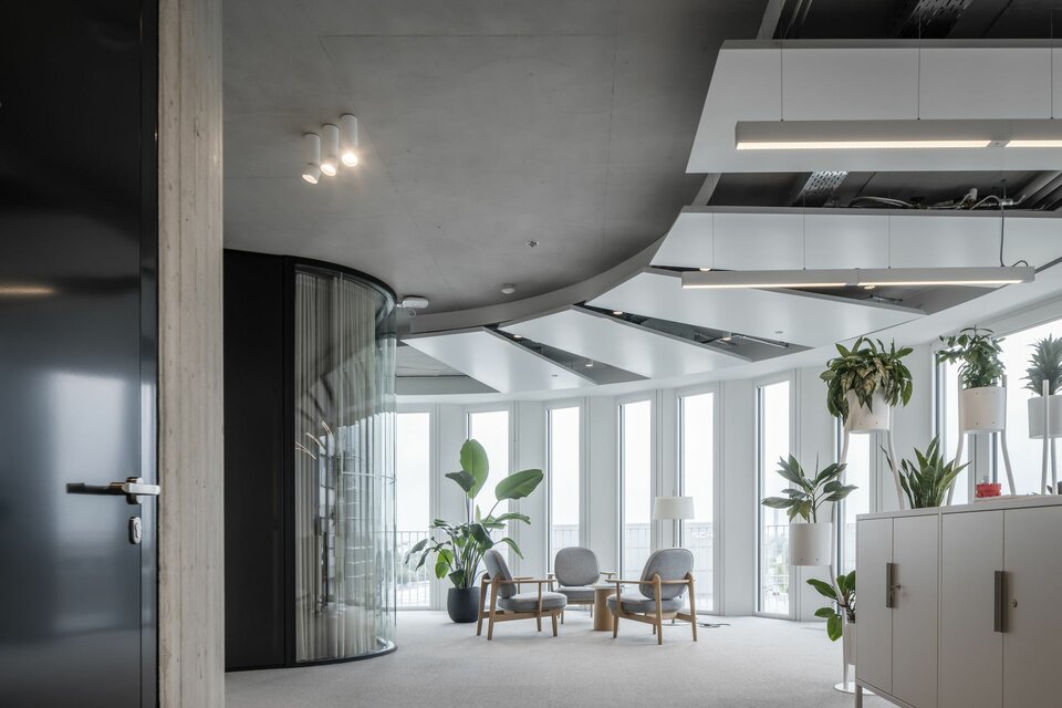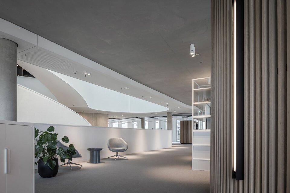 Die Lindner Group übernahm bei der Umsetzung des Schüco One mehrere zentrale Gewerke: Im Bereich Trockenbau kamen moderne, flexible Lösungen zum Einsatz, die die offenen Raumstrukturen und die akustischen Anforderungen unterstützen. Metalldeckensegel sorgen des Weiteren dank hervorragender Schallabsorption und ansprechendem Design für eine angenehme Atmosphäre.