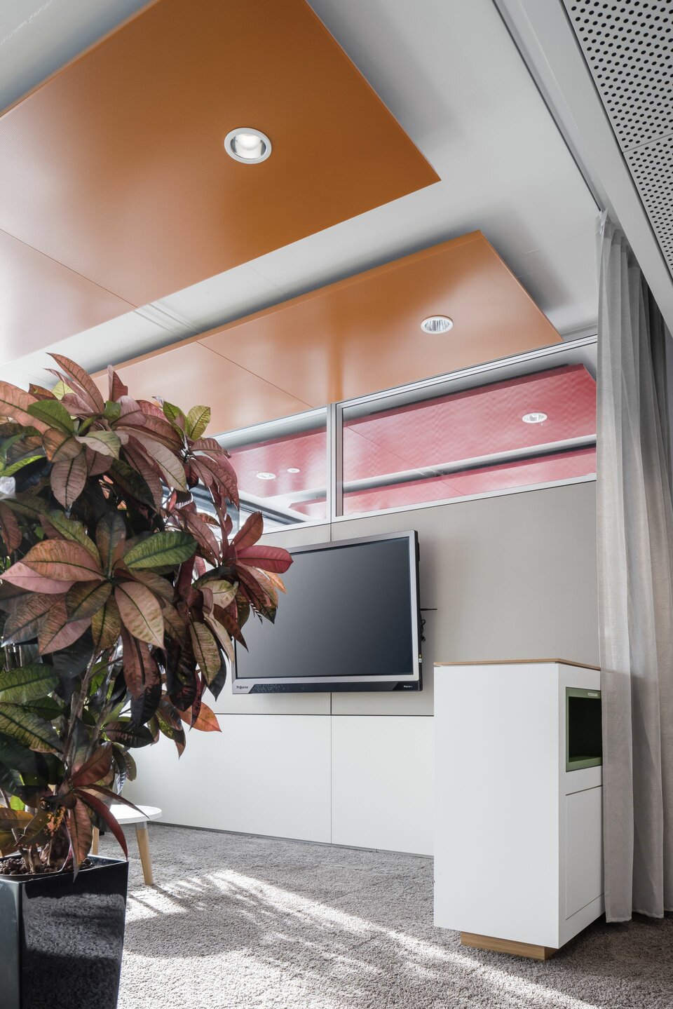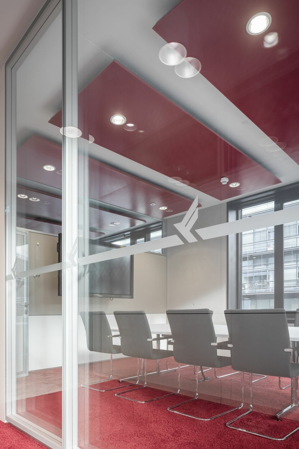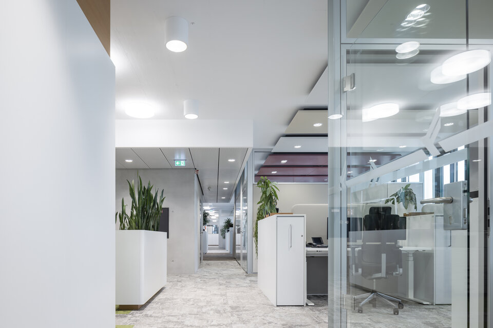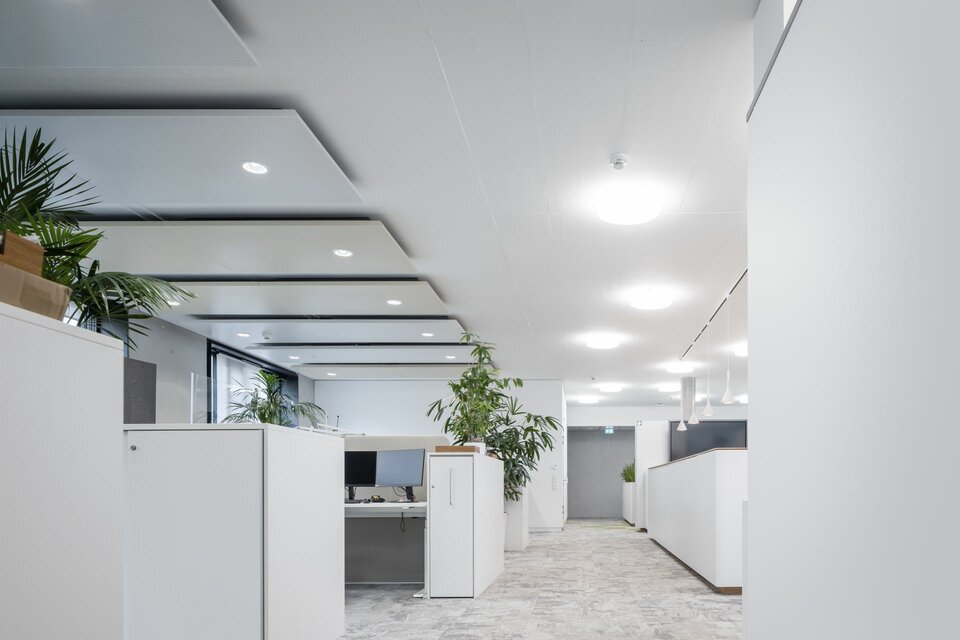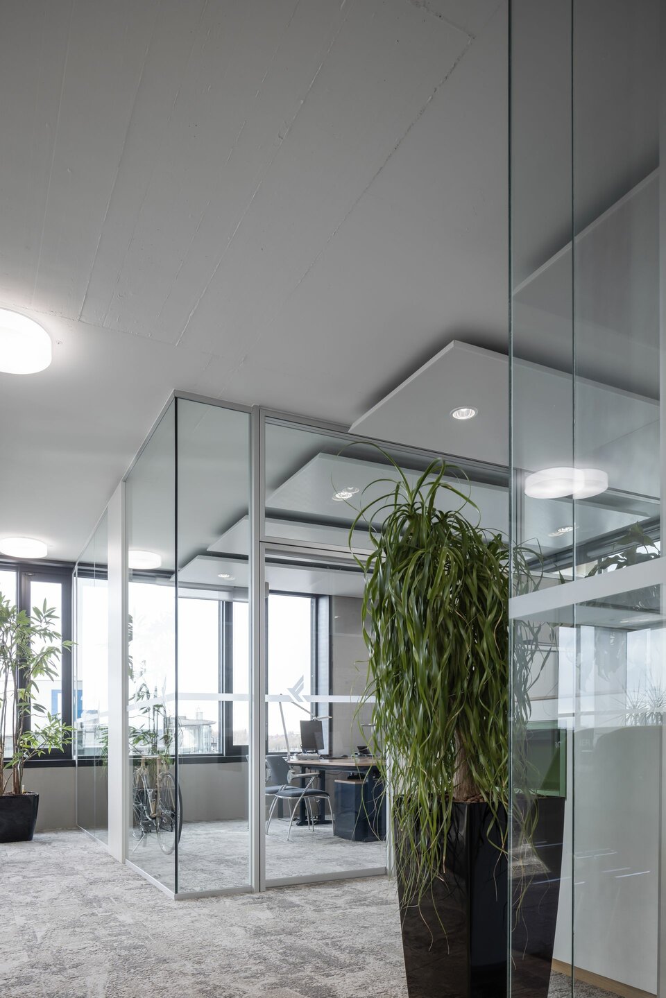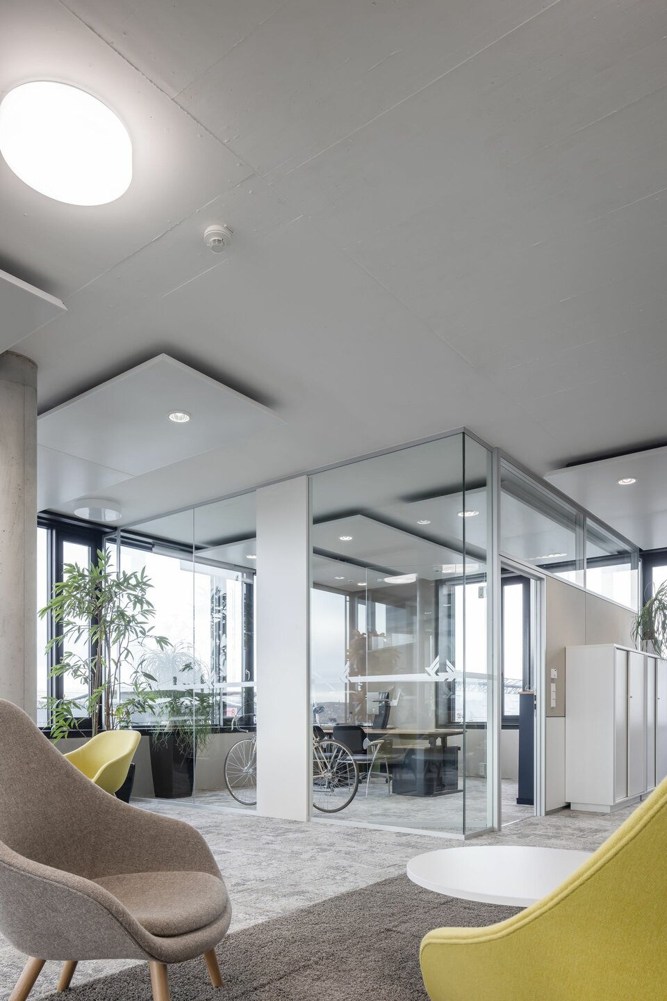 Lindner installierte die Heiz-/Kühldecken Plafotherm® DS 320 und Plafotherm® DS Tabs 125 in verschiedenen Farben: Die Deckensegel stellen damit nicht nur ein optisches Highlight dar, sondern tragen auch maßgeblich zur energieeffizienten Nutzung des Gebäudes bei. Für eine weitere Verbesserung des Brandschutzes und der Akustik sorgen Gipskarton Wand- und Deckensysteme. Lindner Glastrennwände sowie Lindner Logic Trennwände schaffen zudem eine Separierung der Büroflächen und mobile Trennwände ermöglichen mehr Flexibilität in der Raumgestaltung und eine Anpassung der Büroflächen an die Bedürfnisse der Mitarbeiter. Dabei vervollständigt speziell ausgewählte Zusatzazsstattung - wie Überströmelemente - das Gesamtbild. Ganzglastüren wurden ebenfalls in die Raumgestaltung integriert und tragen zur hellen und offenen Atmosphäre der Büroräume bei.