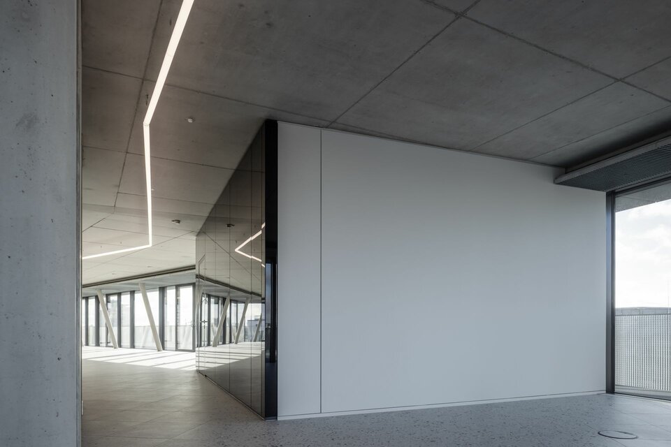 Beim Bau des Bürogebäudes setzte Lindner einmal mehr den eigenen Leitsatz „Bauen mit neuen Lösungen“ um. So wurden im Gebäude zahlreiche Systemtrennwände aus Glas und Metall verbaut, welche mit ihren hochwertigen Oberflächen zur modernen Optik des Innenausbaus beitragen. In Kombination mit passenden Schallschutztüren und Metall-Lamellendecken verbessern sie die Akustik in den Büro-, Besprechungs- und Tagungsräumen. Als Smart Building lässt sich die komplette Gebäudetechnik zudem bequem per Smartphone steuern – ein Alleinstellungsmerkmal, das die Attraktivität des Gebäudes weiter verstärkt. Dazu trägt auch der verbaute Hohlraumboden CAVOPEX bei: Denn das Bodensystem ermöglicht eine versteckte Installation der Smart-Building-Technologie im Bodenhohlraum.
