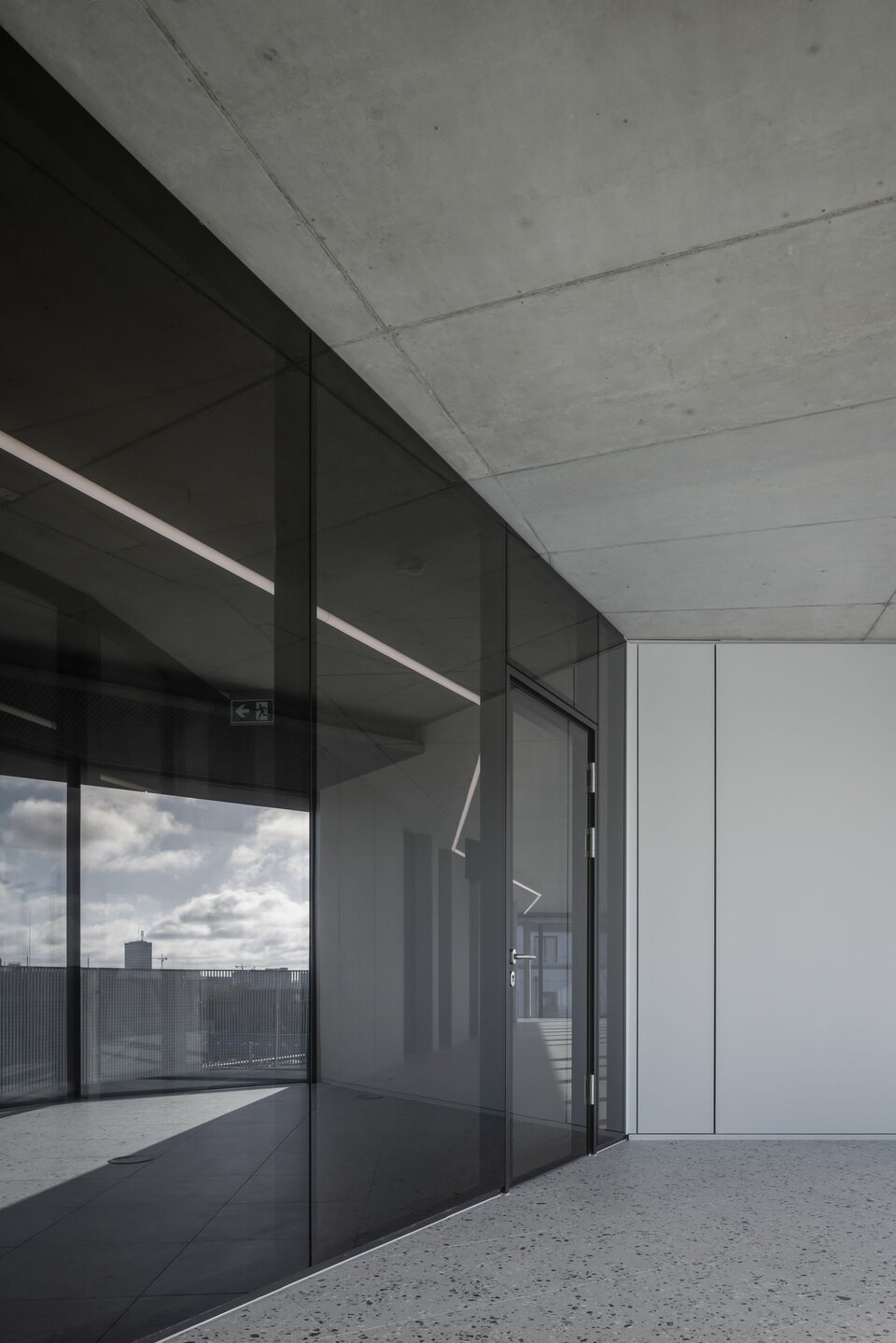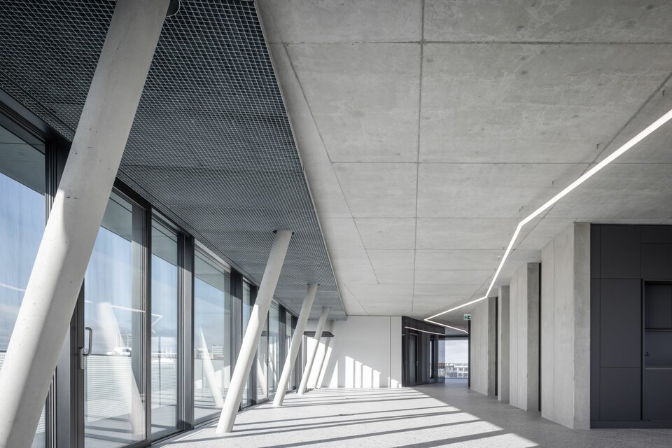 Auf einem Grundstück direkt an der Spree entstand in den vergangenen Jahren ein Ensemble aus vier Bürogebäuden. Das Terrassenhaus begeistert seither mit einer außergewöhnlichen Architektur und High-Tech Ausstattung. Geprägt von großzügig auskragenden Balkon- und Terrassenflächen ist The Terrace das letzte der vier Gebäude und setzt das auffällige Design des Gebäudekomplexes auch im Inneren fort: Markante Steinfußböden verbinden sich heute harmonisch mit den großflächigen Sichtbetondecken und einem außergewöhnlichen Lichtkonzept.