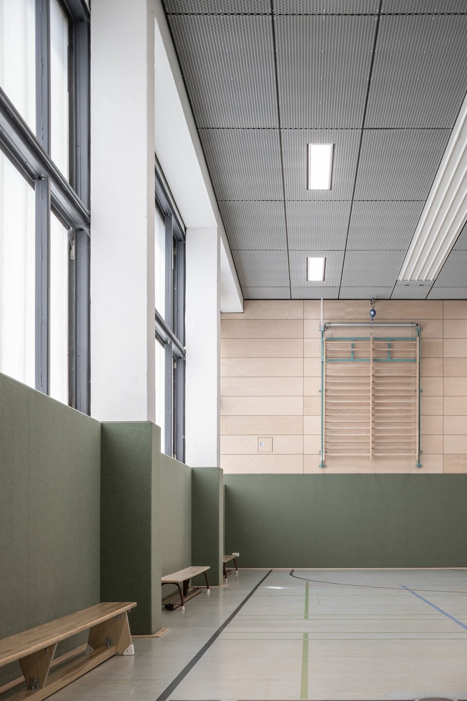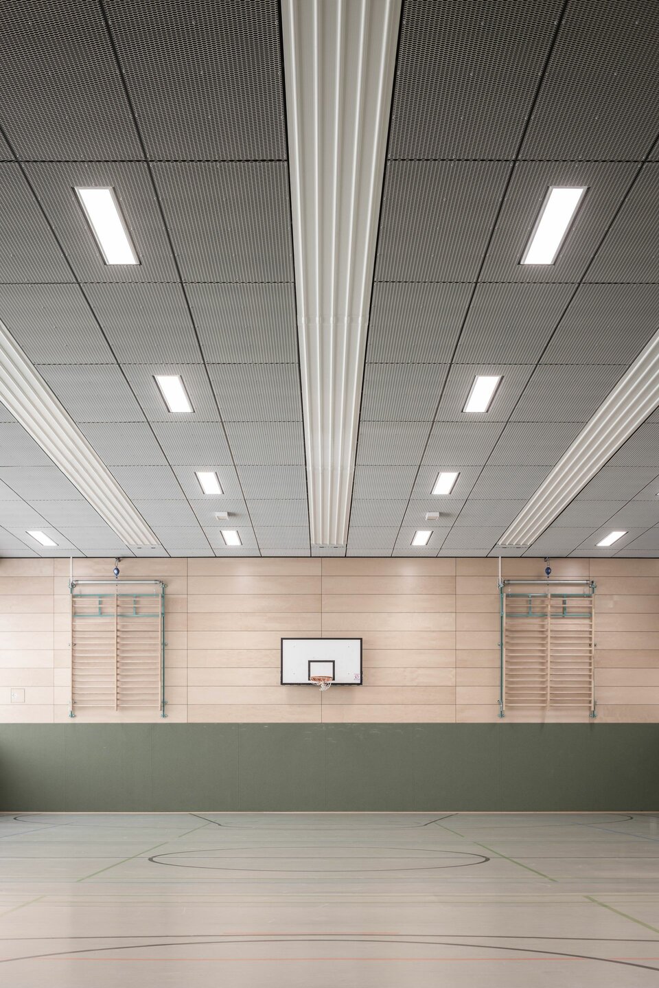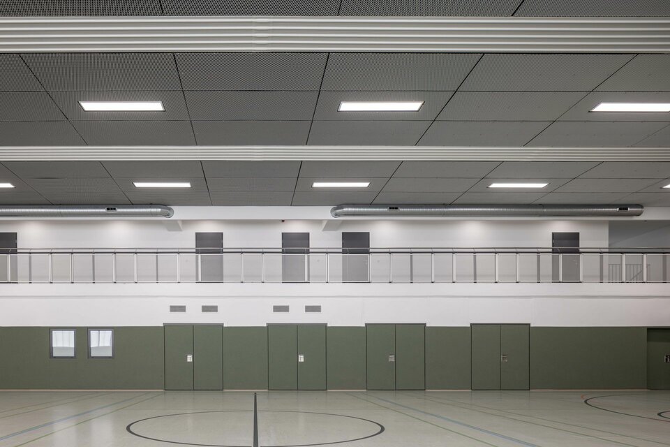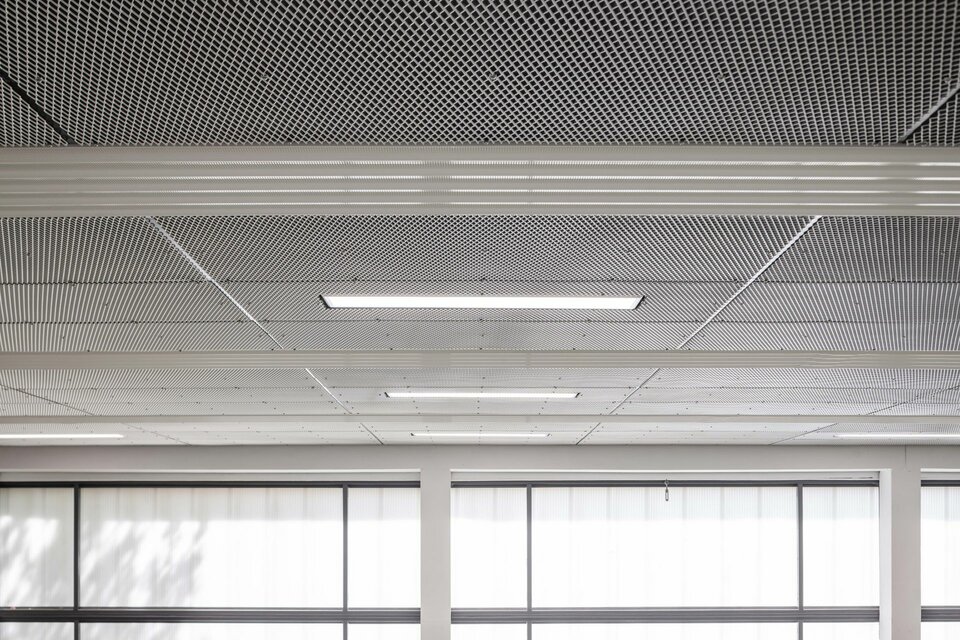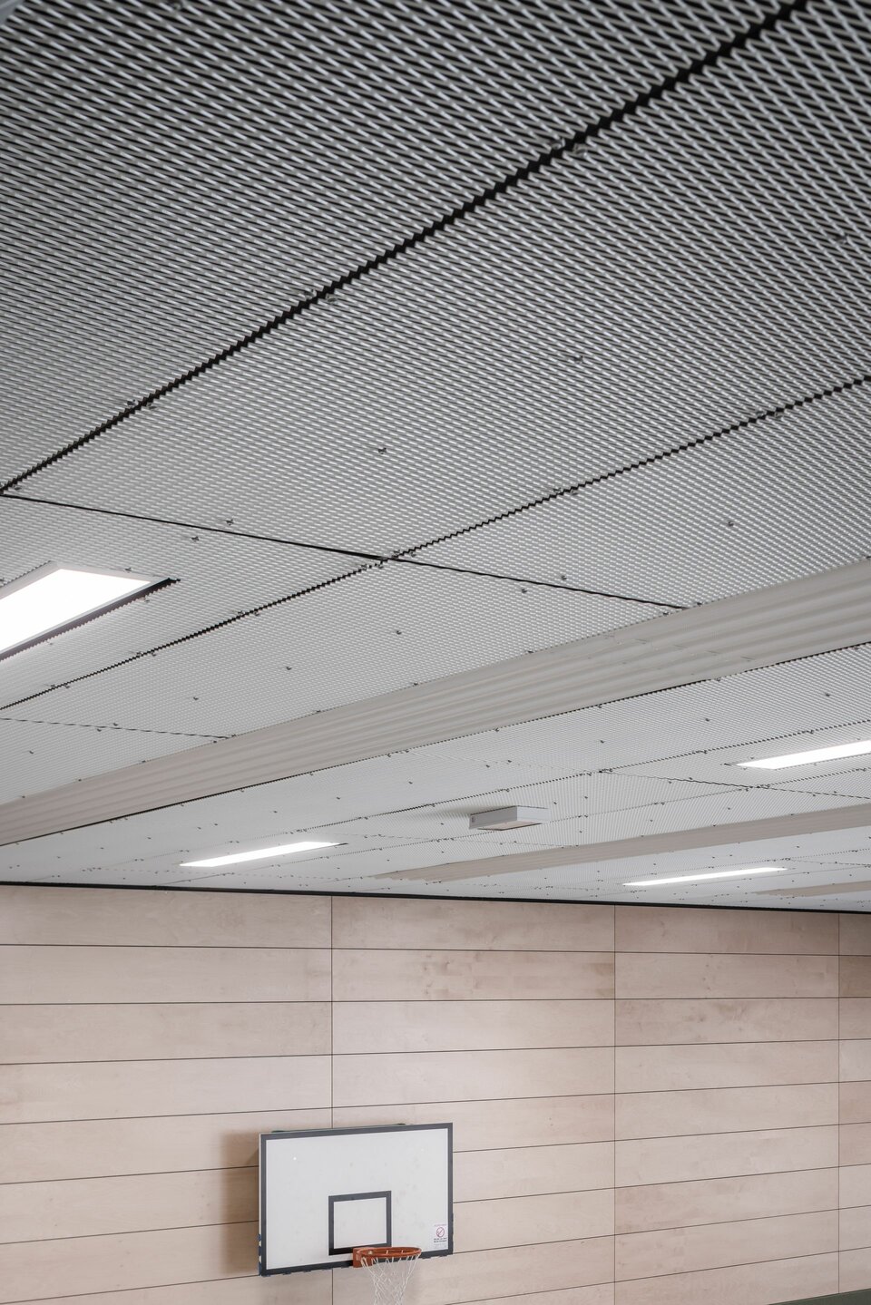 Die Lindner Group stattete die beiden Sportstätten mit je einer ballwurfsicheren Deckenkonstruktion aus: Die Streckmetalldecke LMD-St 213 BWS wird mit Niederhaltern fixiert und erreicht so die gewünschte Ballwurfsicherheitsklasse. Durch die verdeckte Unterkonstruktion entsteht eine homogene Deckenfläche, die ebenso schlicht und elegant wie sicher ist.