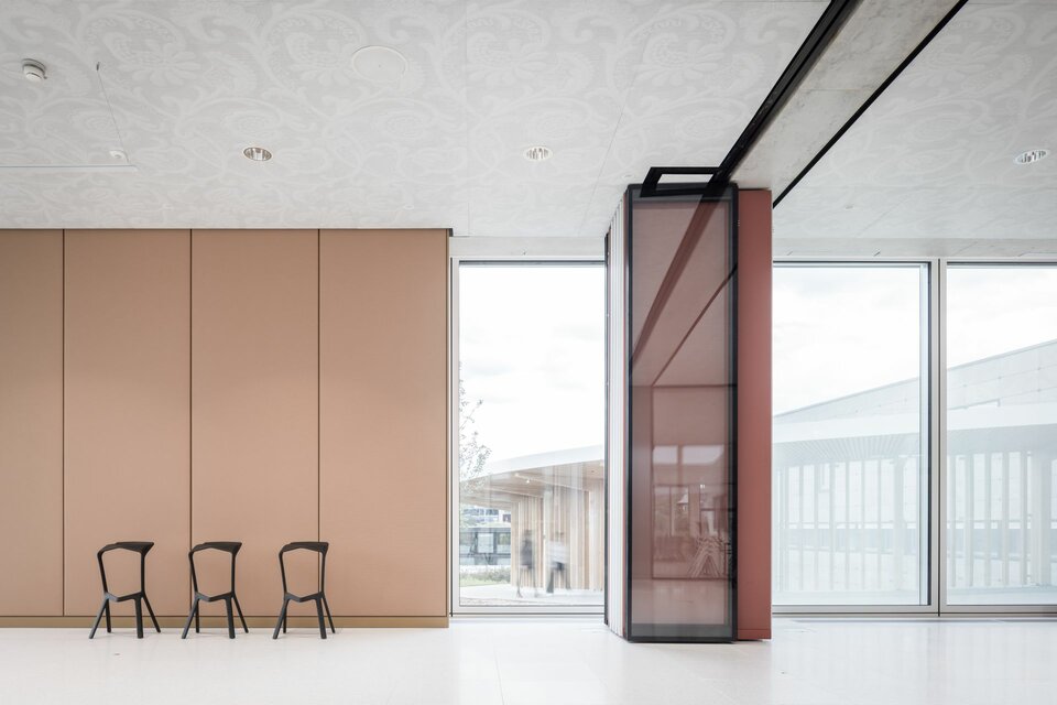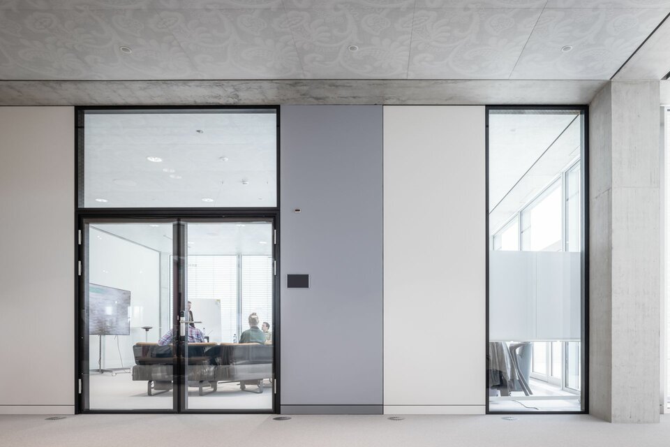 Wie diverse Studien belegen, hat unsere Umgebung einen erheblichen Einfluss auf unsere Kommunikation und Kooperation ‒ das macht einen smarten Innenausbau unabdingbar. Die knappe Bauzeit sowie die hohen architektonischen Anforderungen forderten das Projektteam, letztendlich konnten jedoch alle Wünsche zu vollster Zufriedenheit und in hoher Qualität umgesetzt werden. Dabei stellte Lindner sowohl stapelbare mobile Trennwände als auch eigens gefertigte Systemtrennwände bereit: Die absturzsichere Glastrennwand Lindner Life Freeze 137 trifft auf die Holztrennwand Lindner Logic 100 Timber sowie die Metalltrennwände Lindner Logic 100 Metal und Lindner Logic 100 Metal-Acoustic. Passend zu der kreativen und inspirierenden Lernumgebung wurden die Holztrennwände mit buntem, perforiertem Stoff bespannt und beeindrucken nun in Rot, Gelb, Grün und Blau. Für eine einheitliche Optik bei den mobilen Glastrennwänden und den Systemtrennwänden aus Glas setzte man auf das gleiche Structural Glazing und erzeugte damit ein harmonisches Gesamtbild. Eine weitere Besonderheit wartet bei den Lindner Türsystemen: Bei der Glastür GTB 100 wurde auch der Zargenspiegel mit Glas belegt, sodass eine besonders elegante und filigrane Optik entsteht. Darüber hinaus entwickelte, produzierte und montierte Lindner eine Sonderlösung für das moderne Touch Panel der HSG – der magnetische Bildschirm wird mit einer Metallhalterung in der Wandfuge eingehängt und kann jederzeit schnell und unkompliziert von der Wand genommen und wieder daran befestigt werden.