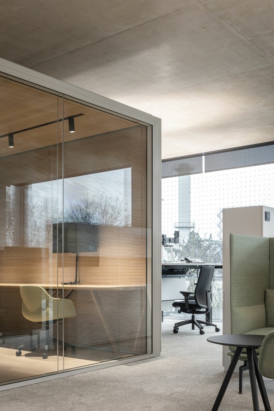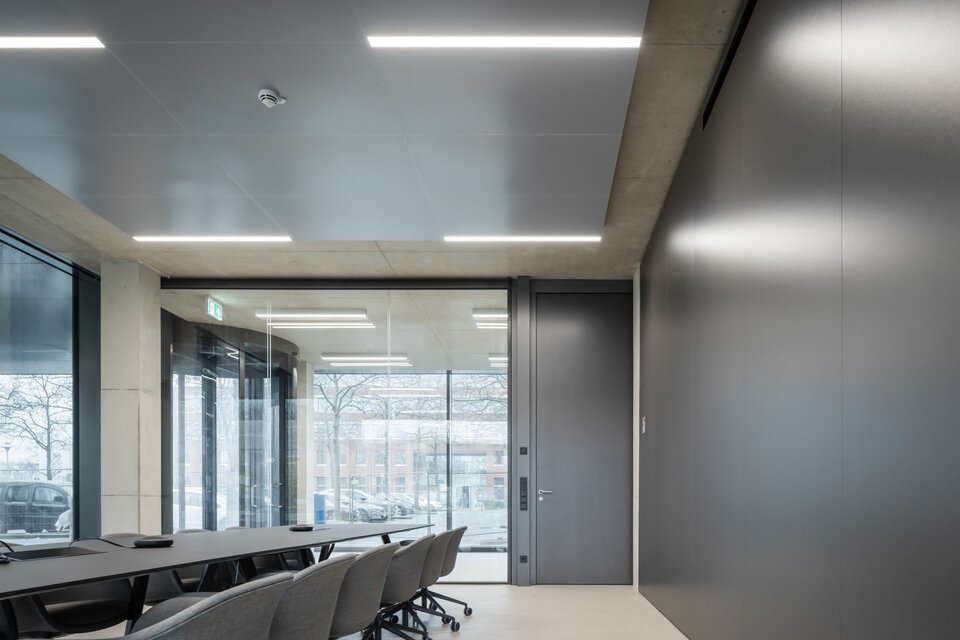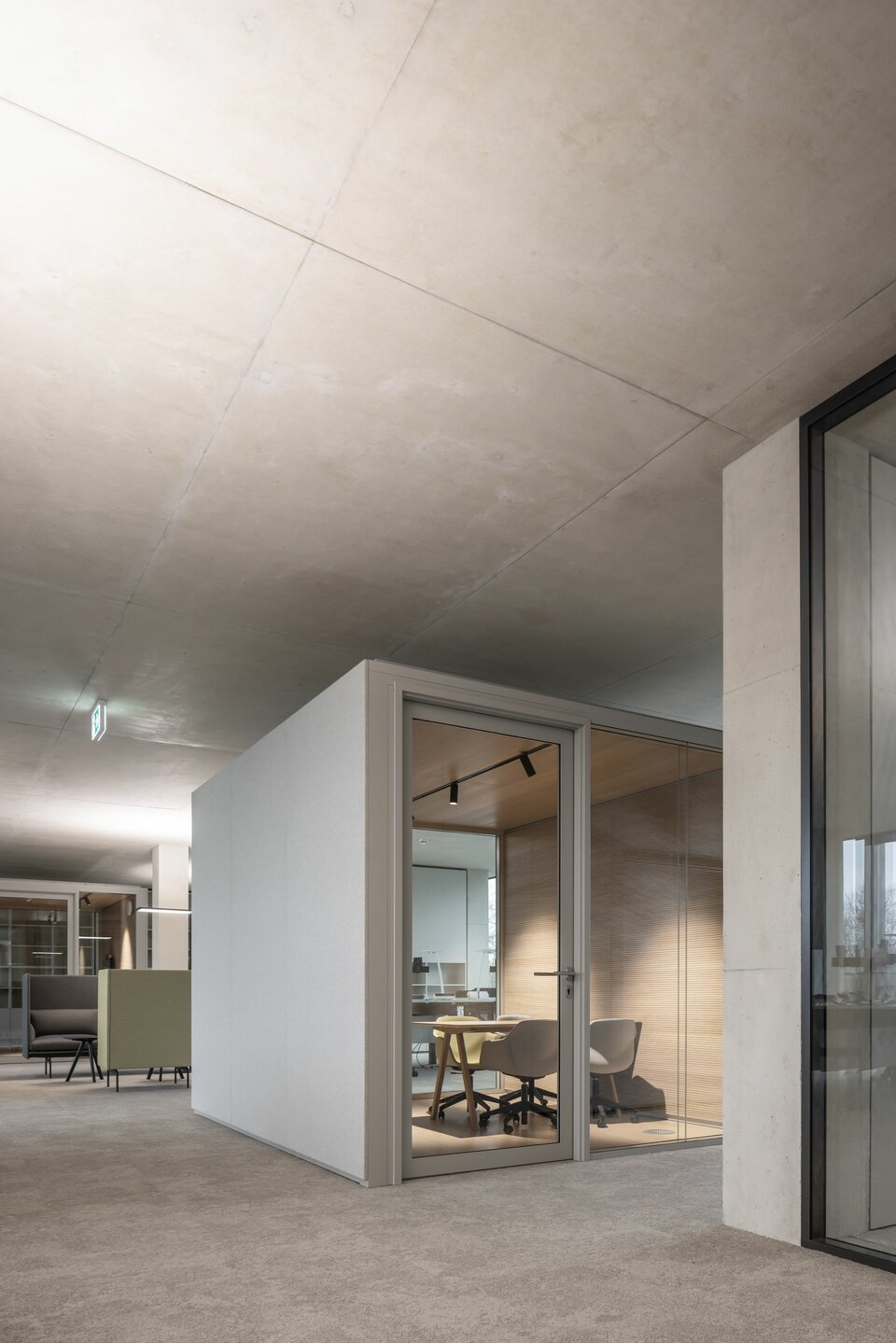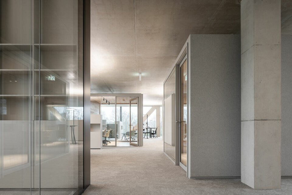 Mit flexiblen, modular aufgebauten Cubes bietet Lindner die ideale Ergänzung in den sonst offenen Raumflächen. Die Raum-in-Raum Systeme ermöglichen ungestörte Gespräche und konzentriertes Arbeiten bei optimalen Raumklima und können individuellen Bedürfnissen angepasst werden. Bei Änderungen und Aufteilungen können die Cubes auch im Raum versetzt oder komplett rückgebaut und in anderen Bereichen wiederverwendet werden. Weitere Systemtrennwände aus Glas tragen mit ihrer transparenten Gestaltung dazu bei, dass das natürliche Licht bestmöglich genutzt wird und die Offenheit der Fläche erhalten bleibt. Integrierte Jalousien bieten zusätzliche Flexibilität und Privatsphäre.