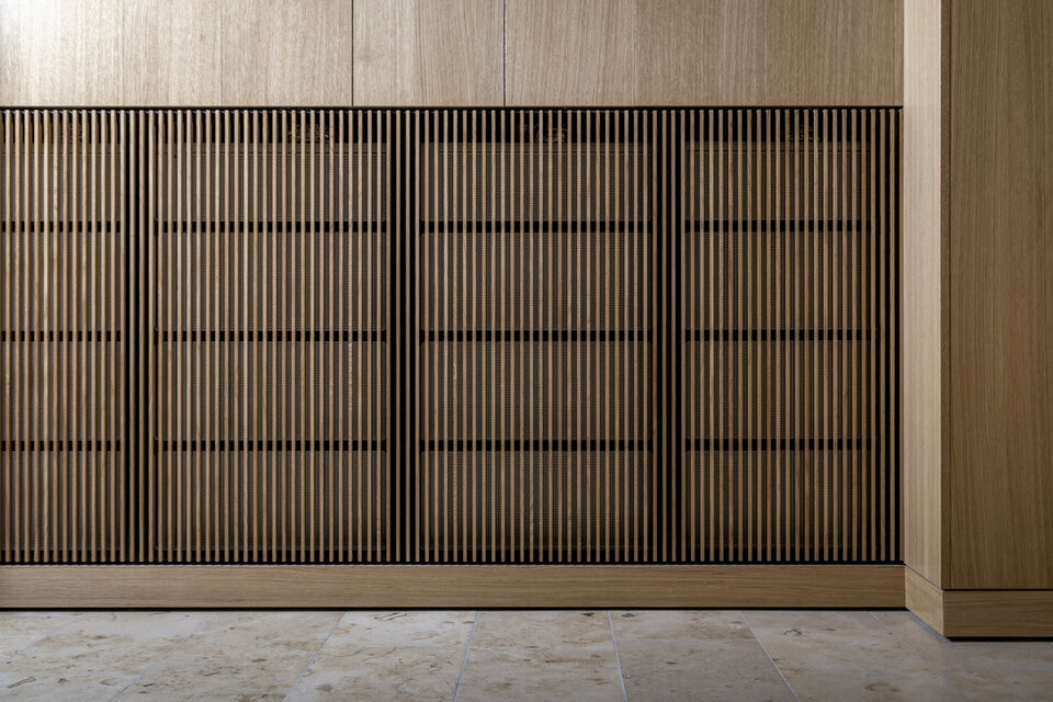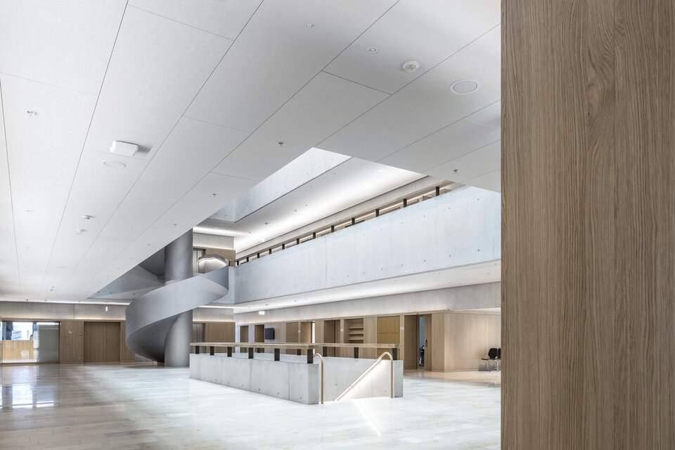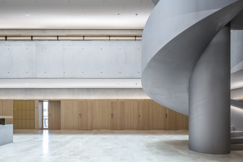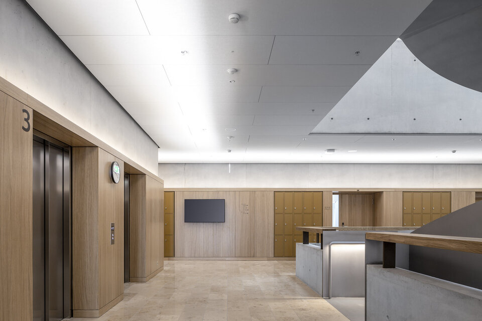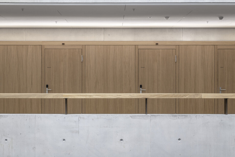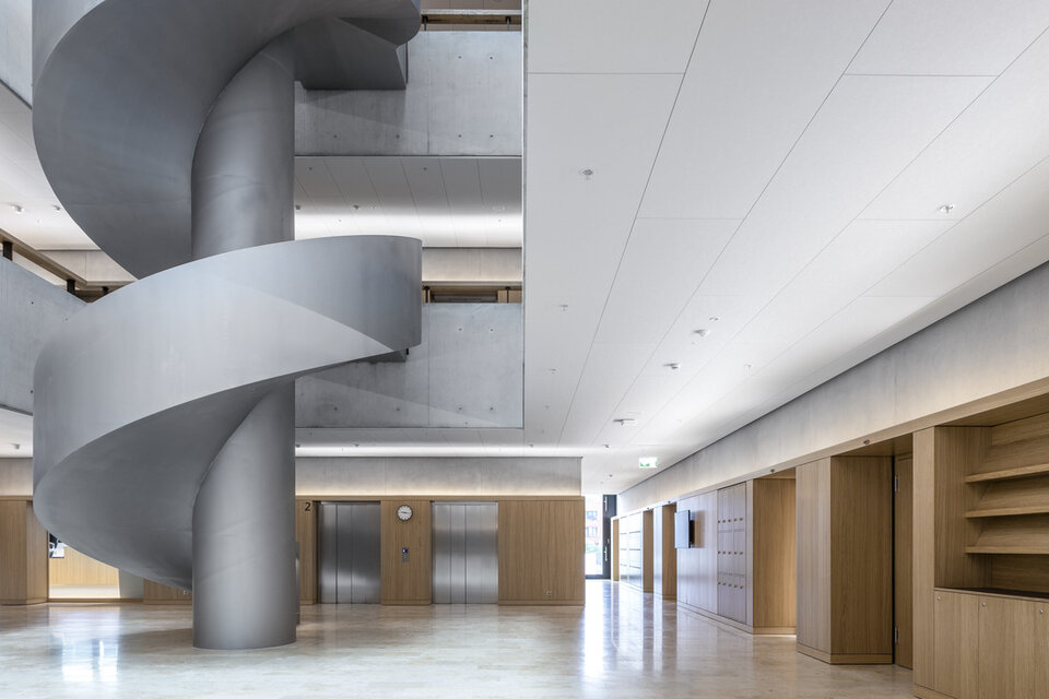 Die Schweizer Niederlassung der Lindner SE konnte zusammen mit dem auf Schreinerleistungen spezialisierten Geschäftsbereich Lindner SE | Objektdesign eine Vielfalt an Leistungen zum Innenausbau des neuen Campus der Hochschule beitragen. Im Hochhaus wurden Lamellen-Wandbekleidungen aus massiver Fichte erstellt. Besonders umfangreich war der Leistungsumfang im Nachbargebäude, wo Wand- und Säulenbekleidungen mit Echtholzfurnier in Eiche bis zu einer Höhe von acht Metern und teilweise mit Brandschutzanforderung RF1 (A2) ausgeführt wurden. Hier wurden auch zahlreiche Laibungen für Türen und Aufzüge sowie Lichtvouten angearbeitet. Außerdem wurden diverse Einbauelemente geschaffen, darunter Nischen für Automaten, Müllsortierung, Wasserspender, Schwarzes Brett, Prospekthalter, Feuerlöschkästen und Infoscreens. An vereinzelten Stellen entschied man sich für eine Metall-Wandbekleidung. Lindner erbrachte zudem Metalldecken, sowohl im Systemaufbau als Einhängedecke wie auch als Rasterdecke.