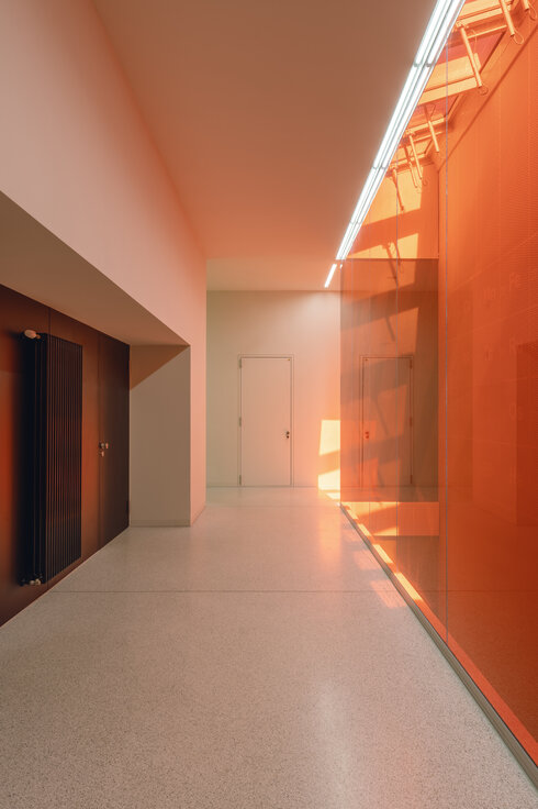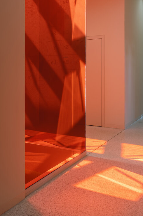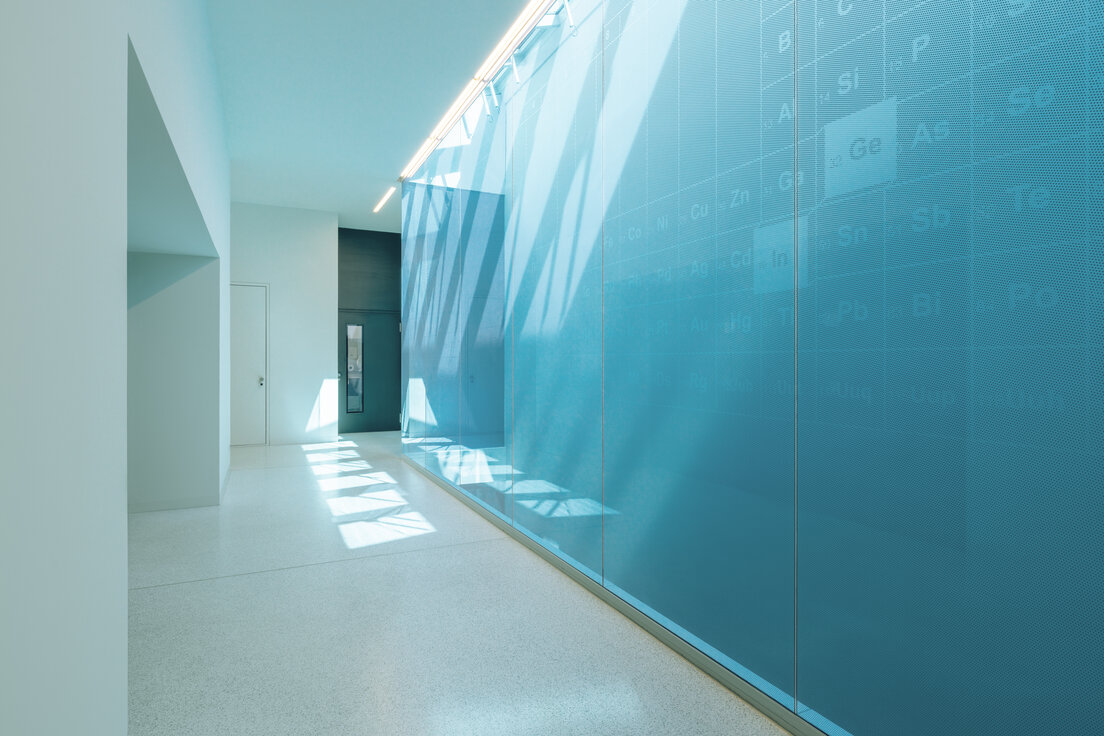 Beim Innenausbau spielte die Lindner Group mit der Umsetzung von absturzsicheren Verglasungen der Lichthöfe eine wichtige Rolle. Hierfür verbaute Lindner die Ganzglaswand Lindner Life Pure 620 inklusive aller Metallverkleidungen der einzelnen Geschosskanten. Die Lindner Life Pure 620, erhältlich in verschiedenen Glasstärken, besticht durch ihre pfostenfreie Verglasung, die die offene und transparente Optik zusätzlich verstärkt. Dies ermöglicht maximale Helligkeit und vermittelt ein Gefühl von Weitläufigkeit. Als besonderer Eyecatcher wurden die Verglasungen verschieden farbig mit dem Periodensystem bedruckt. Dabei war darauf zu achten, dass ein exakter, durchgängiger Verlauf von Scheibe zu Scheibe entstand. Der Höhentransport der Einzelkomponente wurde mittels eines Spinnenkrans im Lichthof realisiert. Auch hier war exaktes Arbeiten und gute Abstimmung im Team nötig, um einen reibungslosen Einbau und ein beeindruckendes Ergebnis zu schaffen.