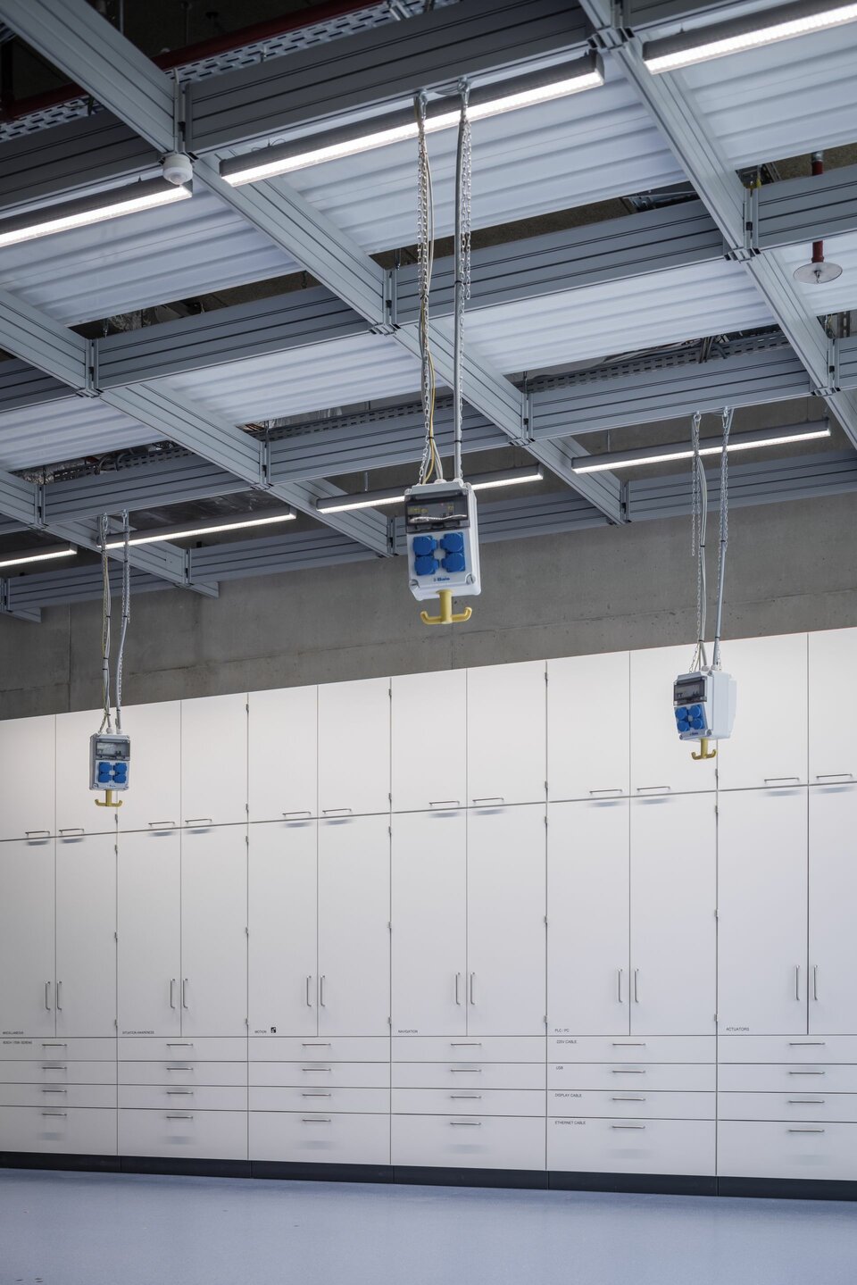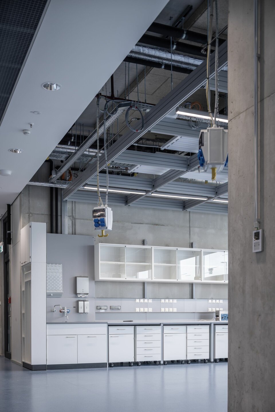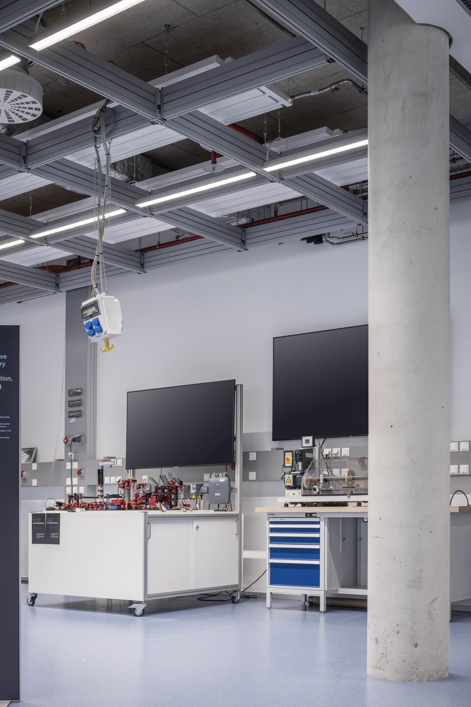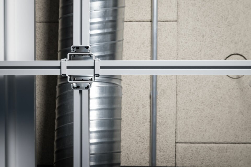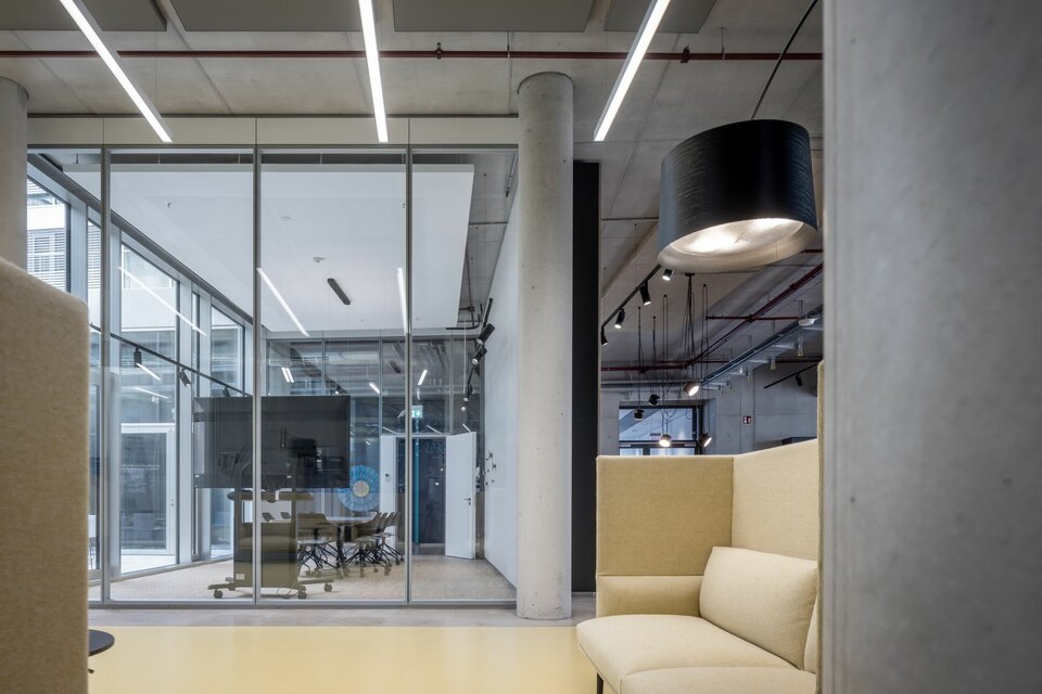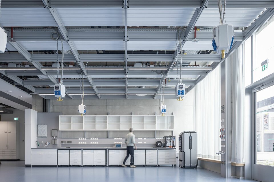 Für maximale Flexibilität in der Raumgestaltung und in der technischen Ausstattung, wählte man das Installationsraster Lindner Click & Load als Abhängesystem für Leuchten, mobile Stromzugänge und Haustechnik. Das patentierte Tragsystem aus leichten Aluminiumprofilen lässt sich flexibel anpassen und mit wenig Aufwand montieren und überzeugt gleichzeitig mit hohen Traglasten. Click & Load lässt sich auch einfach mit anderen Raumtrennsystemen kombinieren: Im Forschungscampus z. B. mit den Glastrennwänden Lindner Life Freeze und Life Pure in 3,50 m raumhohen Ausführungen, kombiniert mit Glas- und Holztüren sowie weiteren Vollwandsystemen von Lindner.