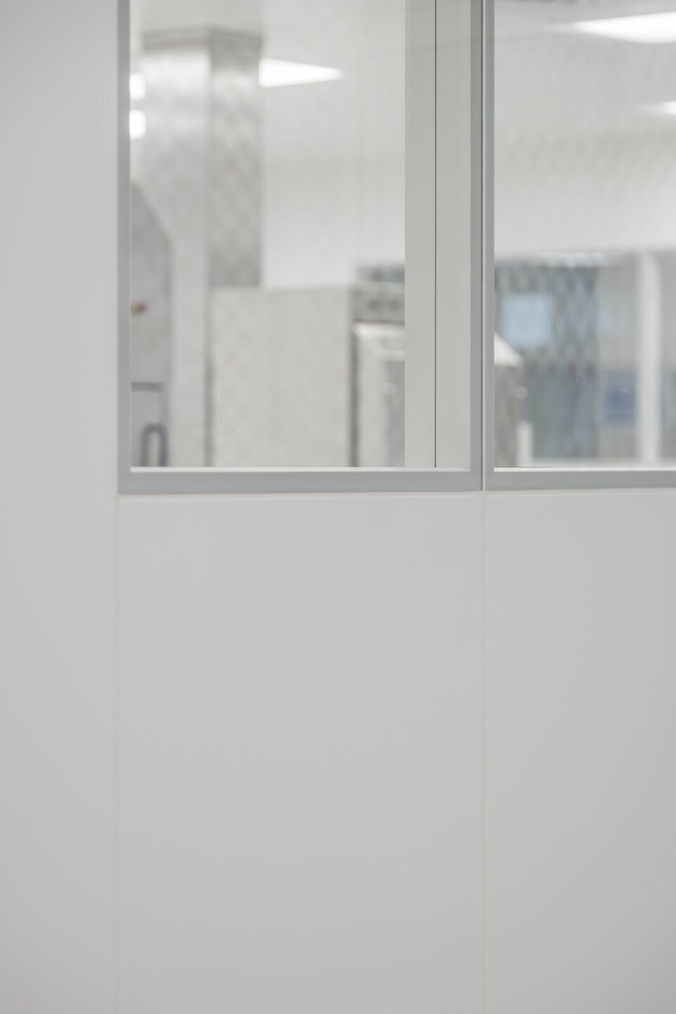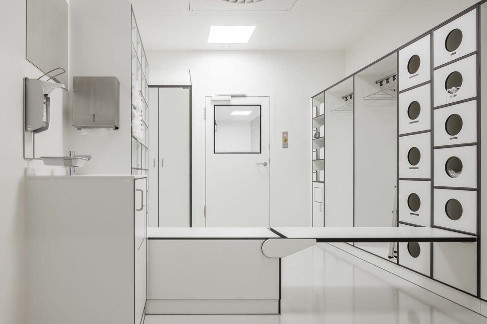Mit der Lindner Cleanlife 619 Glastrennwand wird nicht nur Langlebigkeit, sondern auch eine Schalldämmung bis 40 dB Rw gewährleistet. Ergänzt werden diese Elemente durch Swing MPH Drehflügeltüren, die resistent gegenüber aggressiven Reinigungsmitteln sind und maximale Flexibilität im täglichen Betrieb bieten. Ein spezielles Schleusensteuerungssystem ermöglicht kontrollierte Übergänge zwischen unterschiedlichen Reinraumbereichen, ohne unkontrollierte Luftströme – für Personal und Materialien.