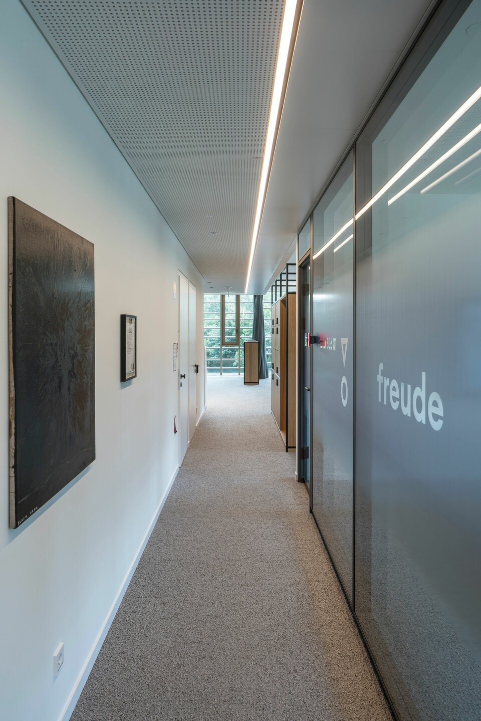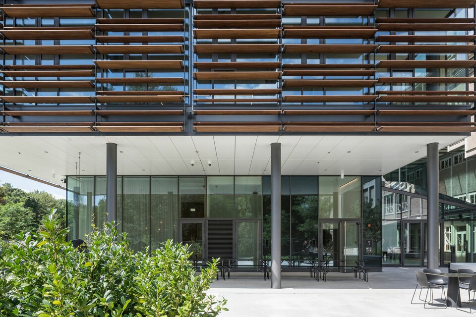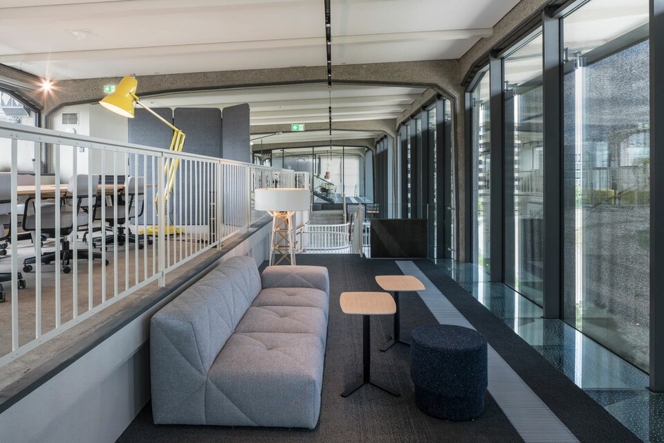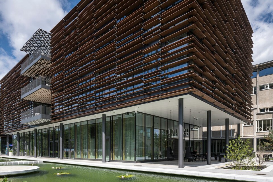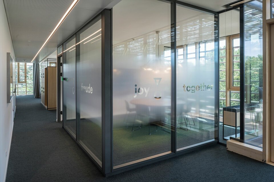 Der Neubau wurde 2021 fertiggestellt und umfasst neben abgeschlossenen Büros auch zahlreiche offene Arbeitsplätze, Projektinseln, eine Bibliothek und Soft-Meeting-Bereiche.