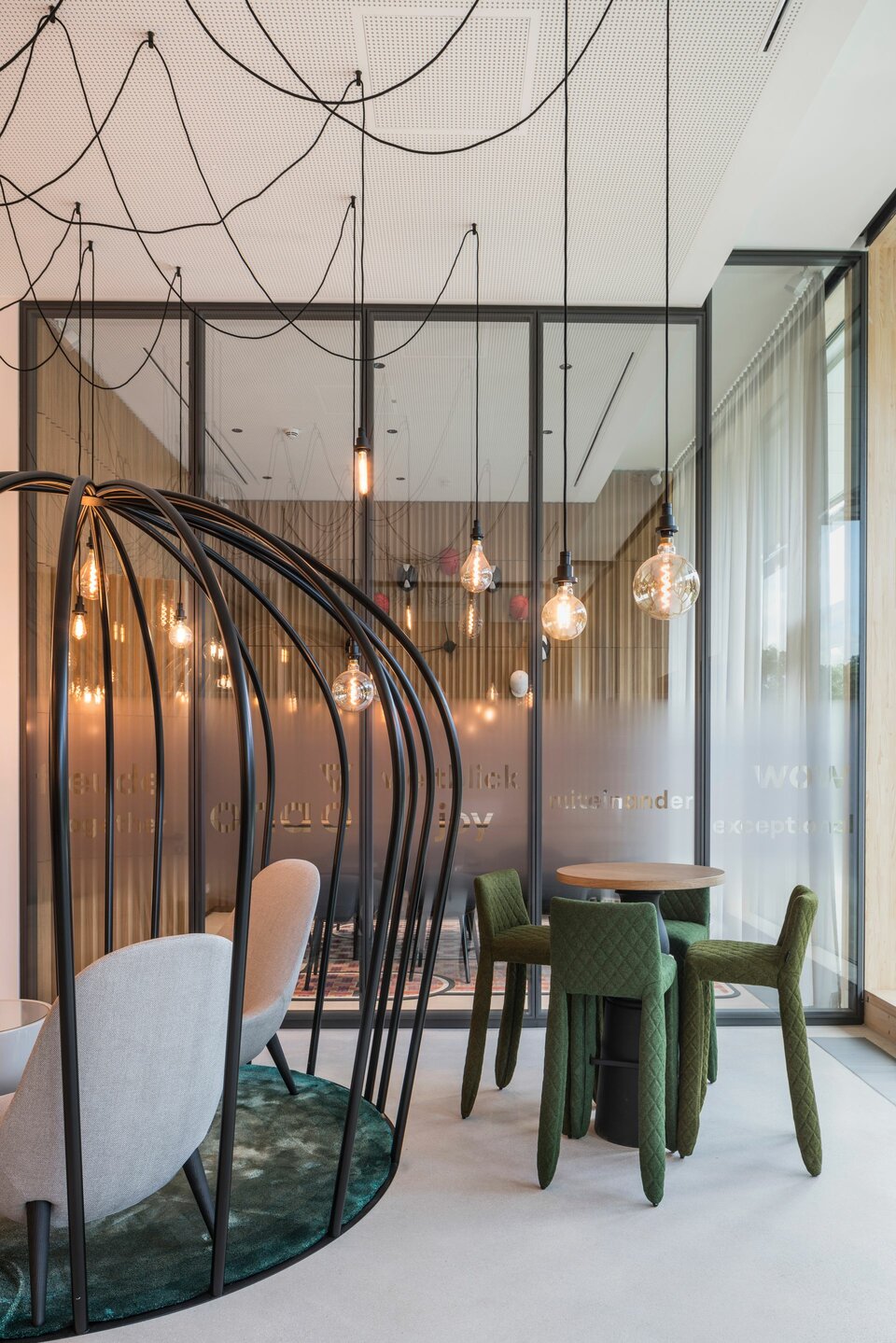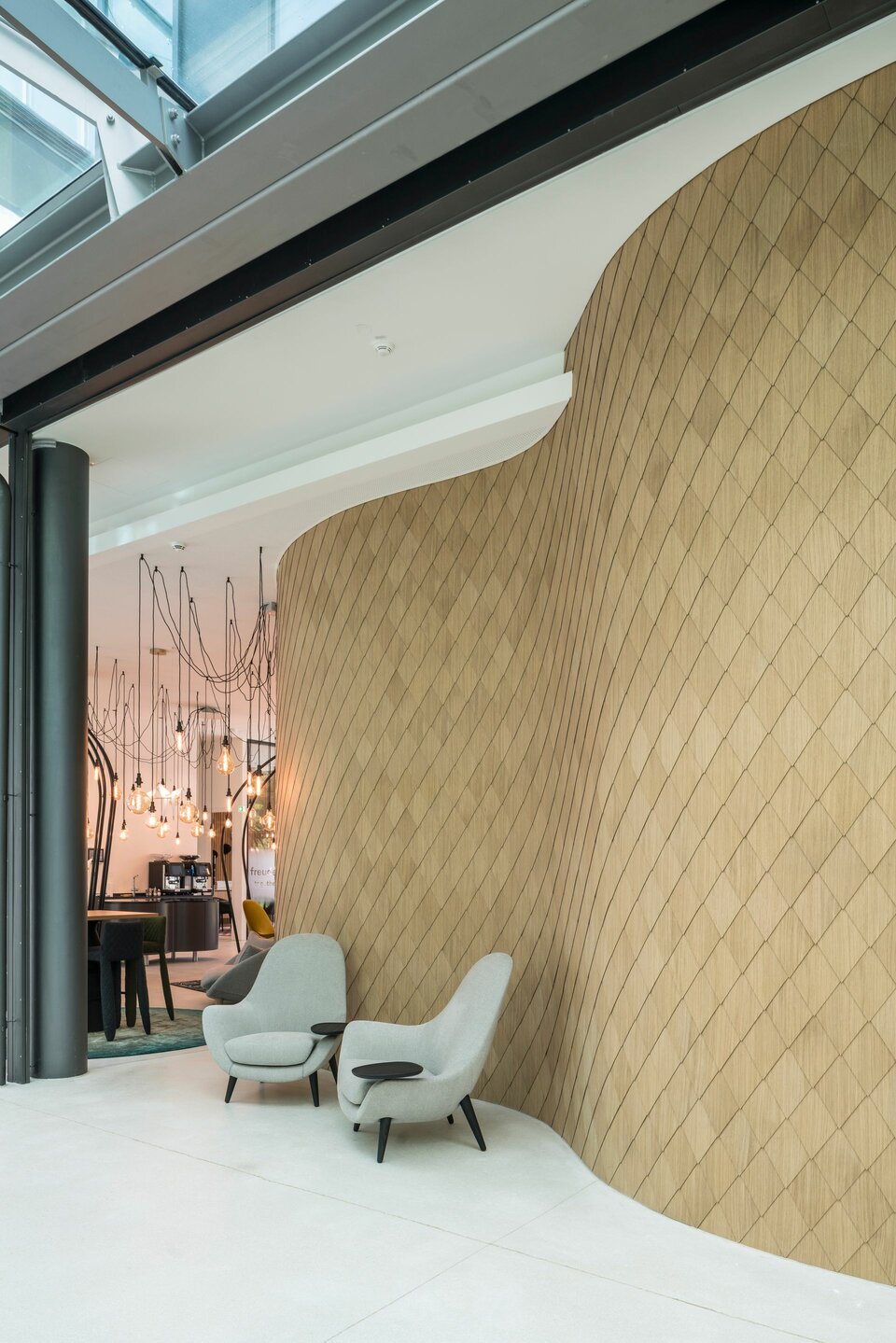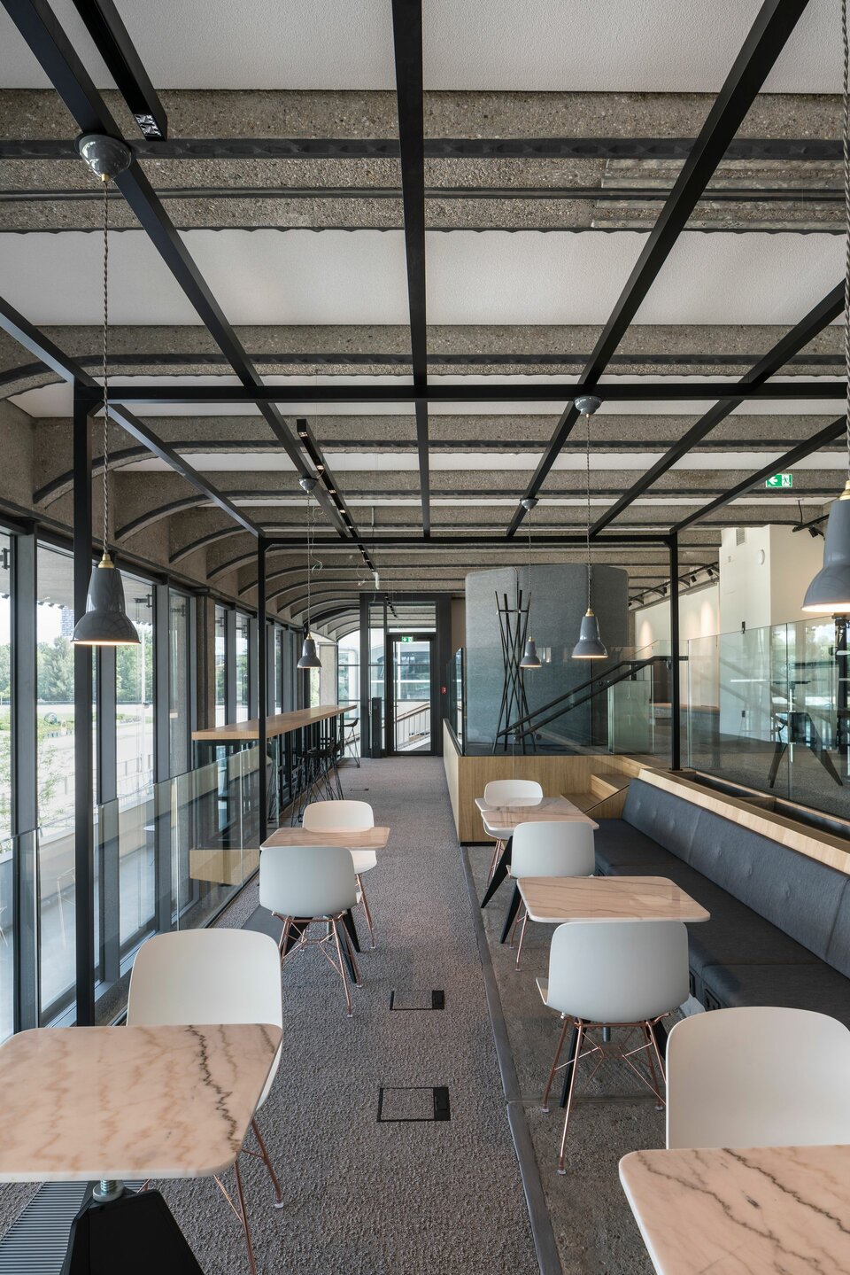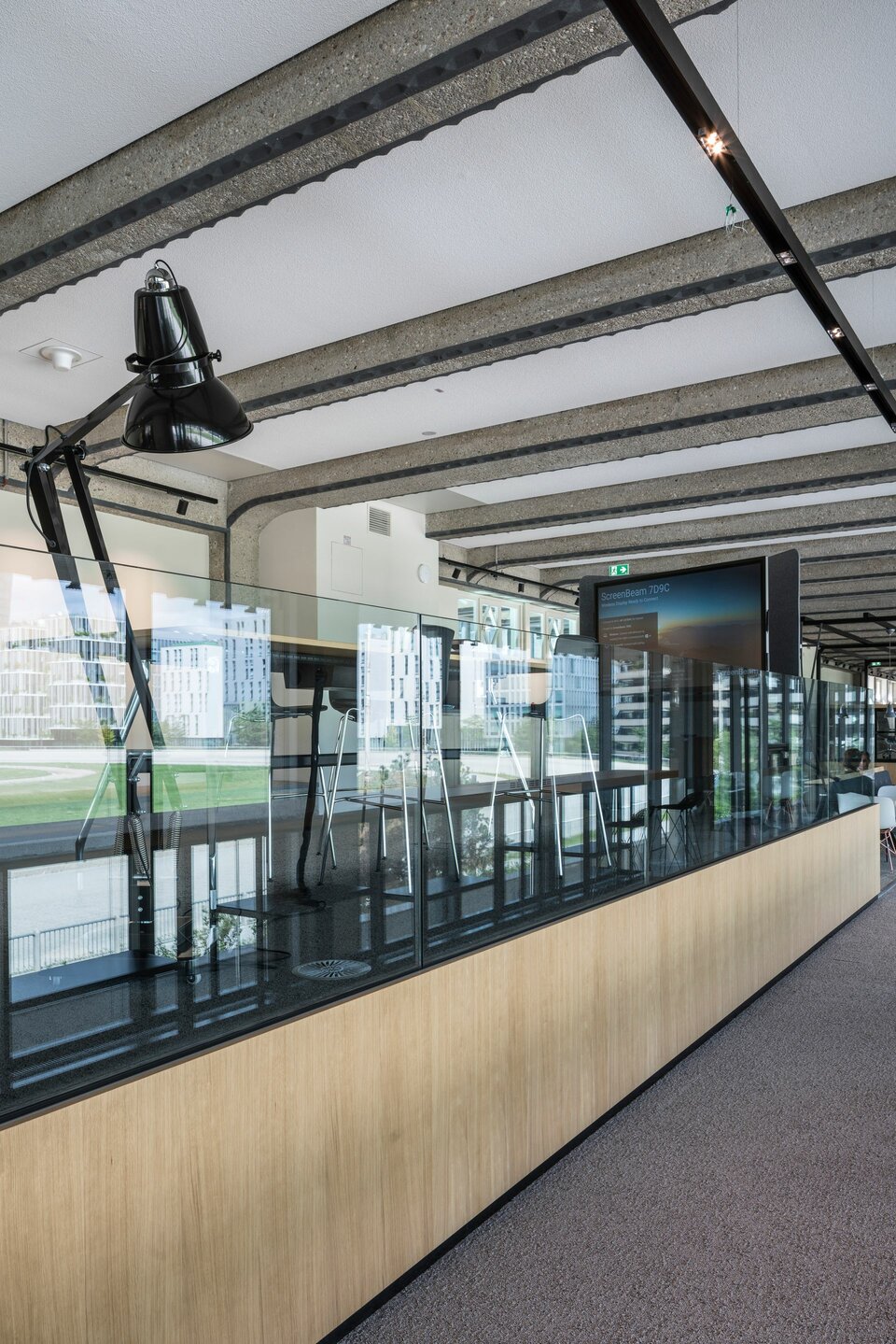 Der Neubau wurde 2021 fertiggestellt und umfasst neben abgeschlossenen Büros auch zahlreiche offene Arbeitsplätze, Projektinseln, eine Bibliothek und Soft-Meeting-Bereiche.