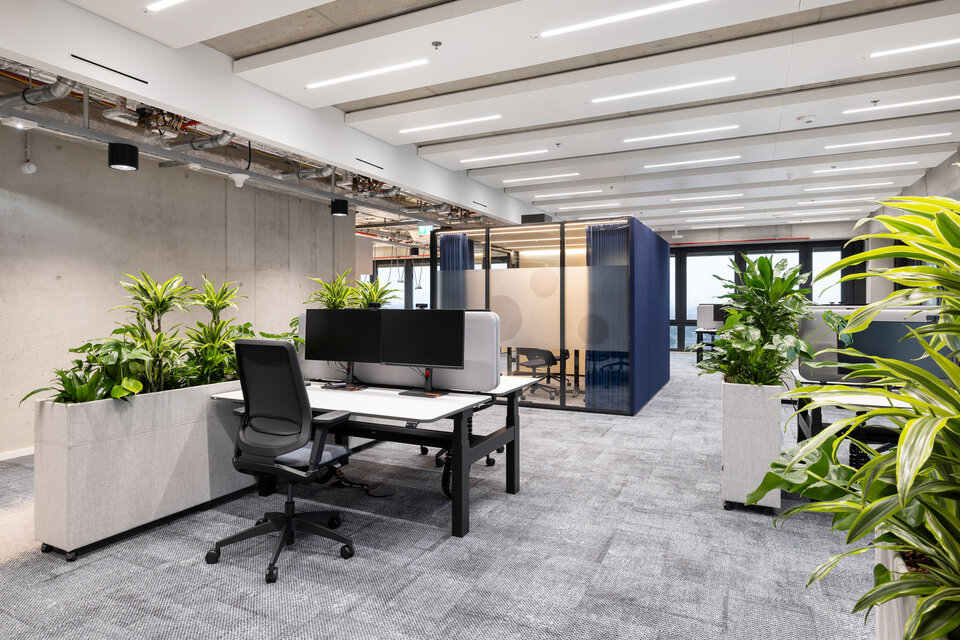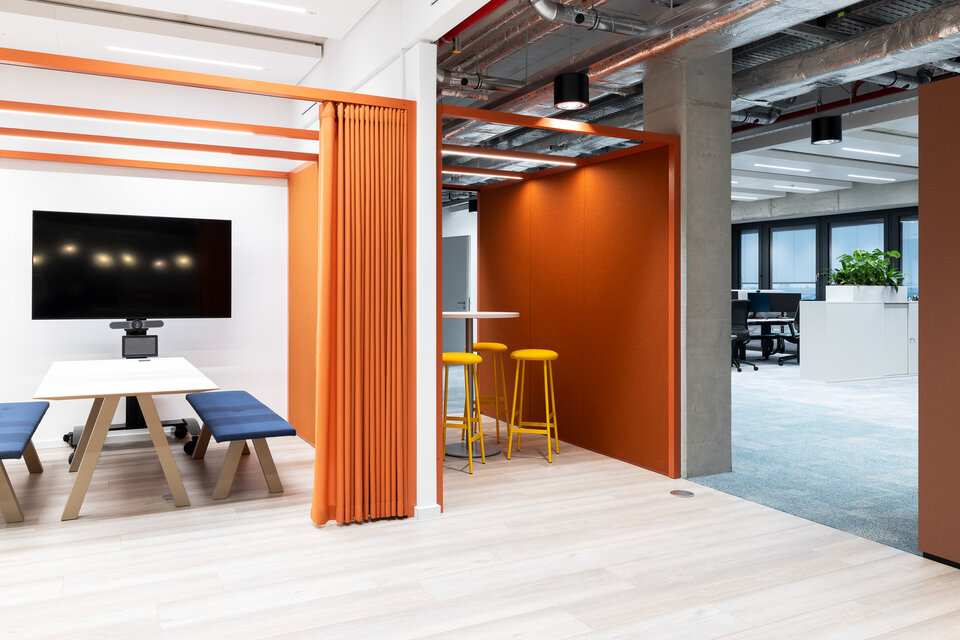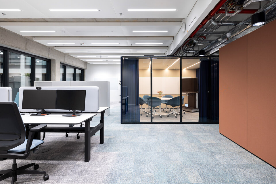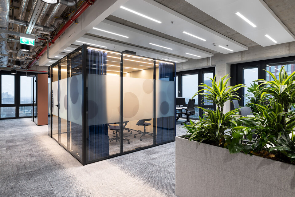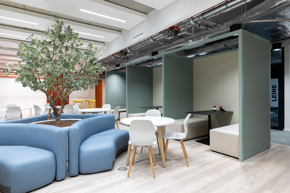 Für die Umsetzung dieser offenen und flexiblen Arbeitswelt setzte die Lindner Group auf das CAS Raum-in-Raum System, das durch seine Modularität und Anpassungsfähigkeit überzeugt. Neben den klassischen CAS Rooms, die als Besprechungsräume und Telefonzellen dienen, wurde das innovative CAS Rooms Flow System integriert: Die filigranen Traversen mit integrierten LED-Leisten erzeugen eine elegante Raumwirkung, ohne den offenen Charakter der Umgebung einzuschränken. Dank der Option, Vorhänge an den Traversen zu integrieren, konnten flexible Besprechungszonen und Rückzugsmöglichkeiten geschaffen werden, die für eine akustische Abgrenzung sorgen. So entstand eine perfekte Balance zwischen Kommunikation und Rückzug.